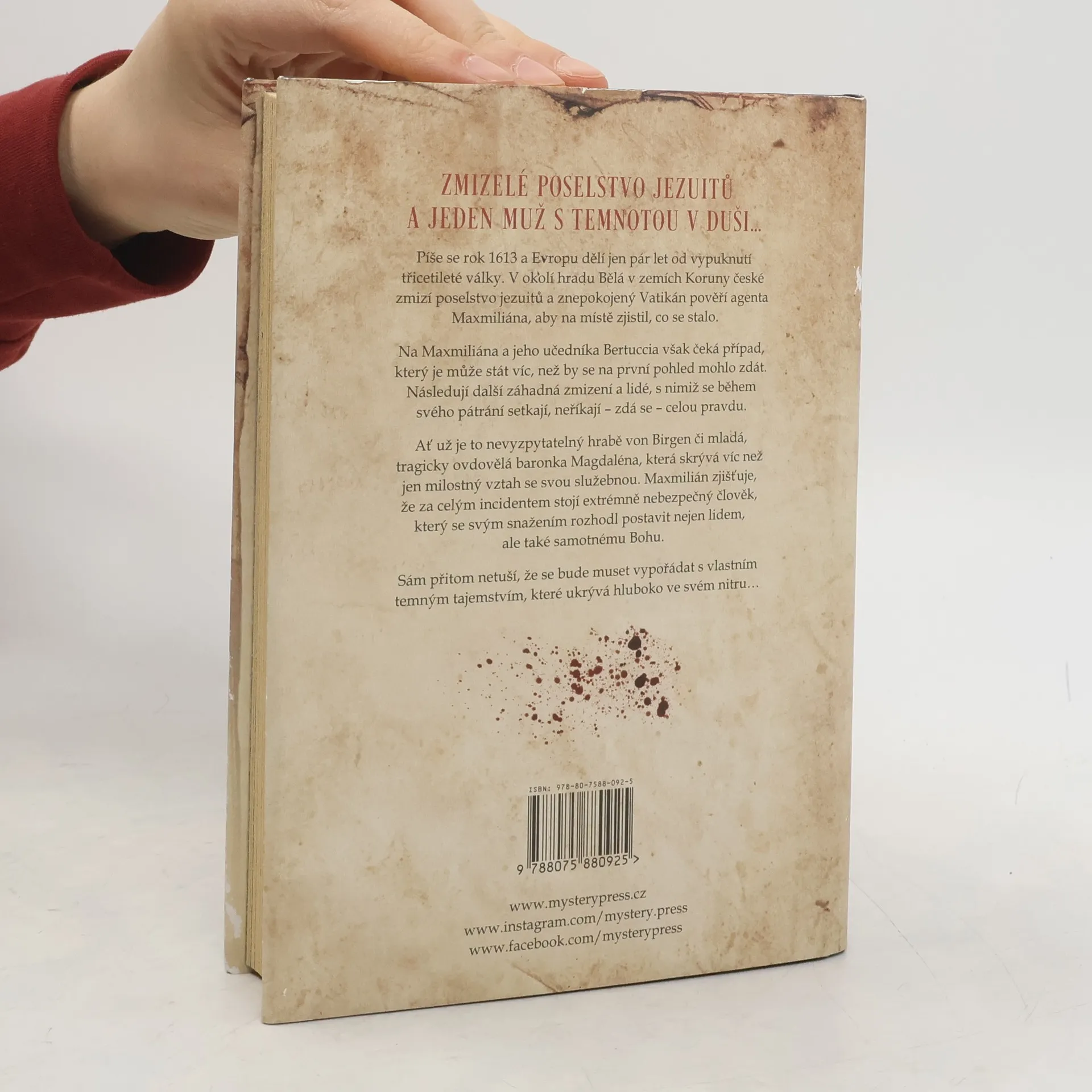 ZMIZELÉ POSELSTVO JEZUITŮ A JEDEN MUŽ S TEMNOTOU V DUŠI… Píše se rok 1613 a Evropu dělí jen pár let od vypuknutí třicetileté války. V okolí hradu Bělá v zemích Koruny české zmizí poselstvo jezuitů a znepokojený Vatikán pověří agenta Maxmiliána, aby na místě zjistil, co se stalo. Na Maxmiliána a jeho učedníka Bertuccia však čeká případ, který je může stát víc, než by se na první pohled mohlo zdát. Následují další záhadná zmizení a lidé, s nimiž se během svého pátrání setkají, neříkají – zdá se – celou pravdu. Ať už je to nevyzpytatelný hrabě von Birgen či mladá, tragicky ovdovělá baronka Magdaléna, která skrývá víc než jen milostný vztah se svou služebnou. Maxmilián zjišťuje, že za celým incidentem stojí extrémně nebezpečný člověk, který se svým snažením rozhodl postavit nejen lidem, ale také samotnému Bohu. Sám přitom netuší, že se bude muset vypořádat s vlastním temným tajemstvím, které ukrývá hluboko ve svém nitru…
