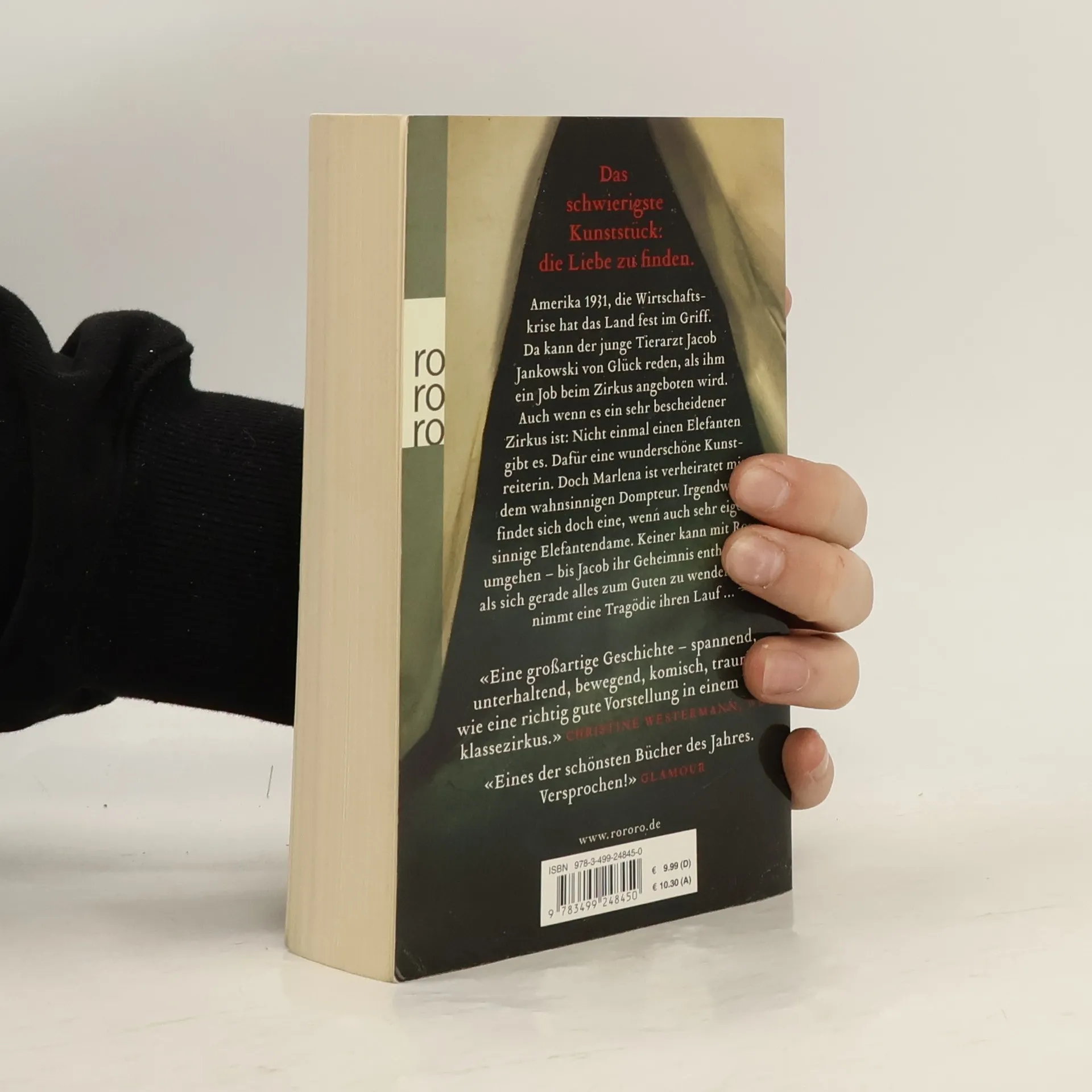 Das schwierigste Kunststück: die Liebe zu finden. Amerika 1931, die Wirtschaftskrise hat das Land fest im Griff. Da kann der junge Tierarzt Jacob Jankowski von Glück reden, als ihm ein Job beim Zirkus angeboten wird. Auch wenn es ein sehr bescheidener Zirkus ist: Nicht einmal einen Elefanten gibt es. Dafür eine wunderschöne Kunstreiterin. Doch Marlena ist verheiratet mit dem wahnsinnigen Dompteur. Irgendwann findet sich doch eine, wenn auch sehr eigensinnige Elefantendame. Keiner kann mit Rosie umgehen – bis Jacob ihr Geheimnis enthüllt. Und als sich gerade alles zum Guten zu wenden scheint, nimmt eine Tragödie ihren Lauf ... «Eine großartige Geschichte – spannend, unterhaltend, bewegend, komisch, traurig, wie eine richtig gute Vorstellung in einem Weltklassezirkus.» CHRISTINE WESTERMANN, WDR «Eines der schönsten Bücher des Jahres. Versprochen!» GLAMOUR
