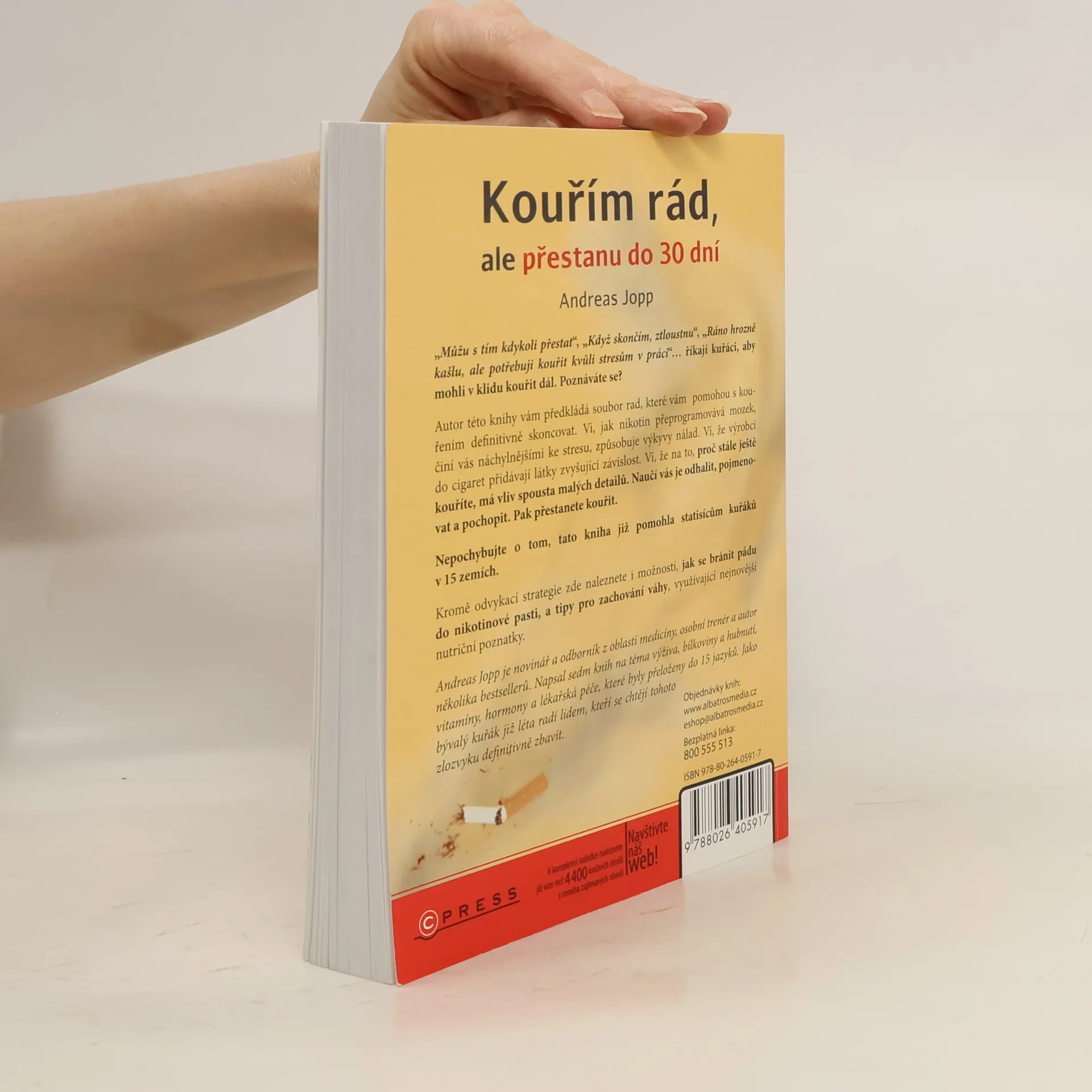 „Můžu s tím kdykoli přestat“ říkají kuřáci, aby mohli v klidu kouřit dál. Poznáváte se? Autor této knihy vám předkládá soubor rad, který vám pomůže s kouřením definitivně skoncovat. Ví, jak nikotin přeprogramovává mozek, činí vás náchylnějšími ke stresu, způsobuje výkyvy nálad. Ví, že na to, proč stále ještě kouříte, má vliv spousta malých detailů. Naučí vás je odhalit, pojmenovat a pochopit. Pak přestanete kouřit. Nepochybujte o tom, tato kniha již pomohla statisícům kuřáků v 15 zemích. Kromě odvykací strategie zde naleznete i možnosti, jak se bránit pádu do nikotinové pasti a tipy pro zachování váhy. Andreas Jopp je novinář a odborník z oblasti medicíny, osobní trenér a autor několika bestsellerů. Napsal sedm knih na téma výživa, bílkoviny a hubnutí, vitamíny, hormony a lékařská péče, které byly přeloženy do 14 jazyků. Jako bývalý kuřák již léta radí lidem, kteří se chtějí tohoto zlozvyku definitivně zbavit.