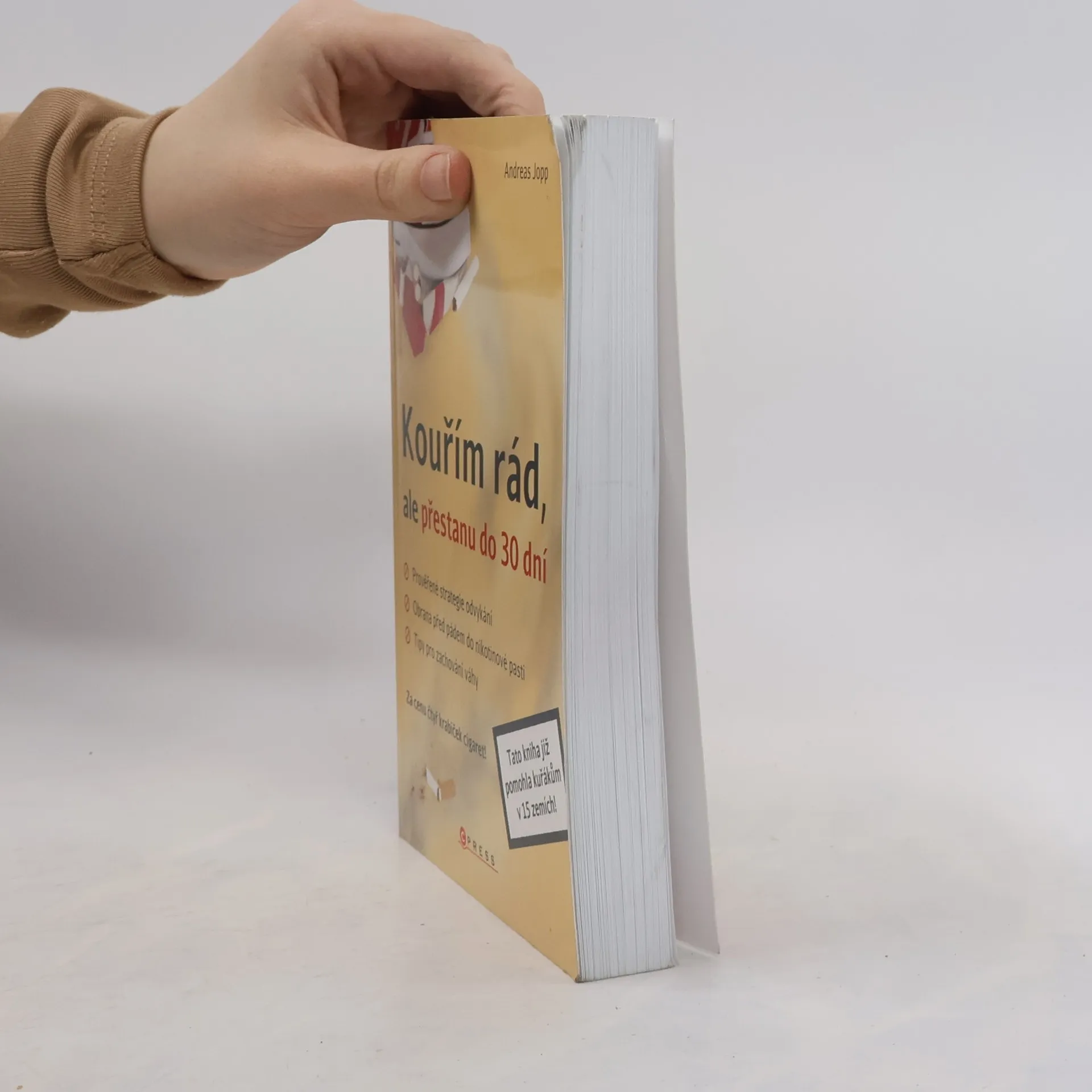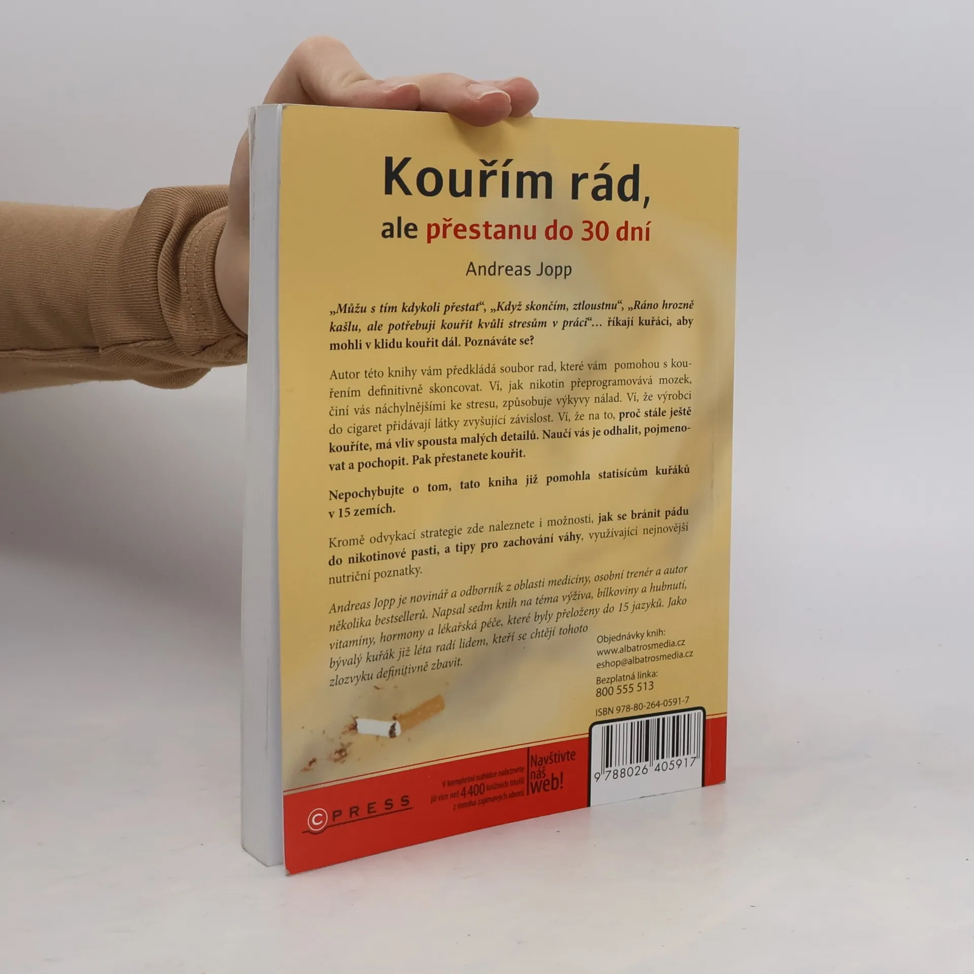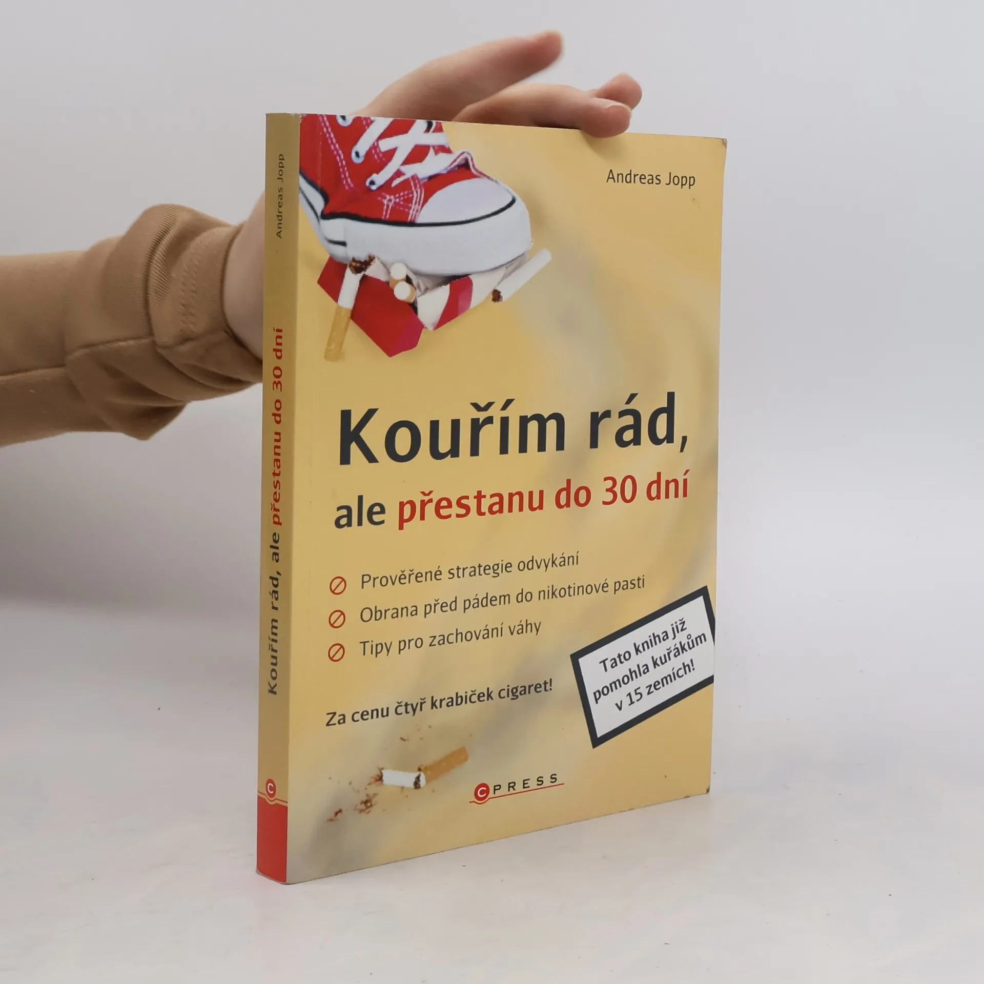 „Můžu s tím kdykoli přestat“ říkají kuřáci, aby mohli v klidu kouřit dál. Poznáváte se? Autor této knihy vám předkládá soubor rad, který vám pomůže s kouřením definitivně skoncovat. Ví, jak nikotin přeprogramovává mozek, činí vás náchylnějšími ke stresu, způsobuje výkyvy nálad. Ví, že na to, proč stále ještě kouříte, má vliv spousta malých detailů. Naučí vás je odhalit, pojmenovat a pochopit. Pak přestanete kouřit. Nepochybujte o tom, tato kniha již pomohla statisícům kuřáků v 15 zemích. Kromě odvykací strategie zde naleznete i možnosti, jak se bránit pádu do nikotinové pasti a tipy pro zachování váhy. Andreas Jopp je novinář a odborník z oblasti medicíny, osobní trenér a autor několika bestsellerů. Napsal sedm knih na téma výživa, bílkoviny a hubnutí, vitamíny, hormony a lékařská péče, které byly přeloženy do 14 jazyků. Jako bývalý kuřák již léta radí lidem, kteří se chtějí tohoto zlozvyku definitivně zbavit.
