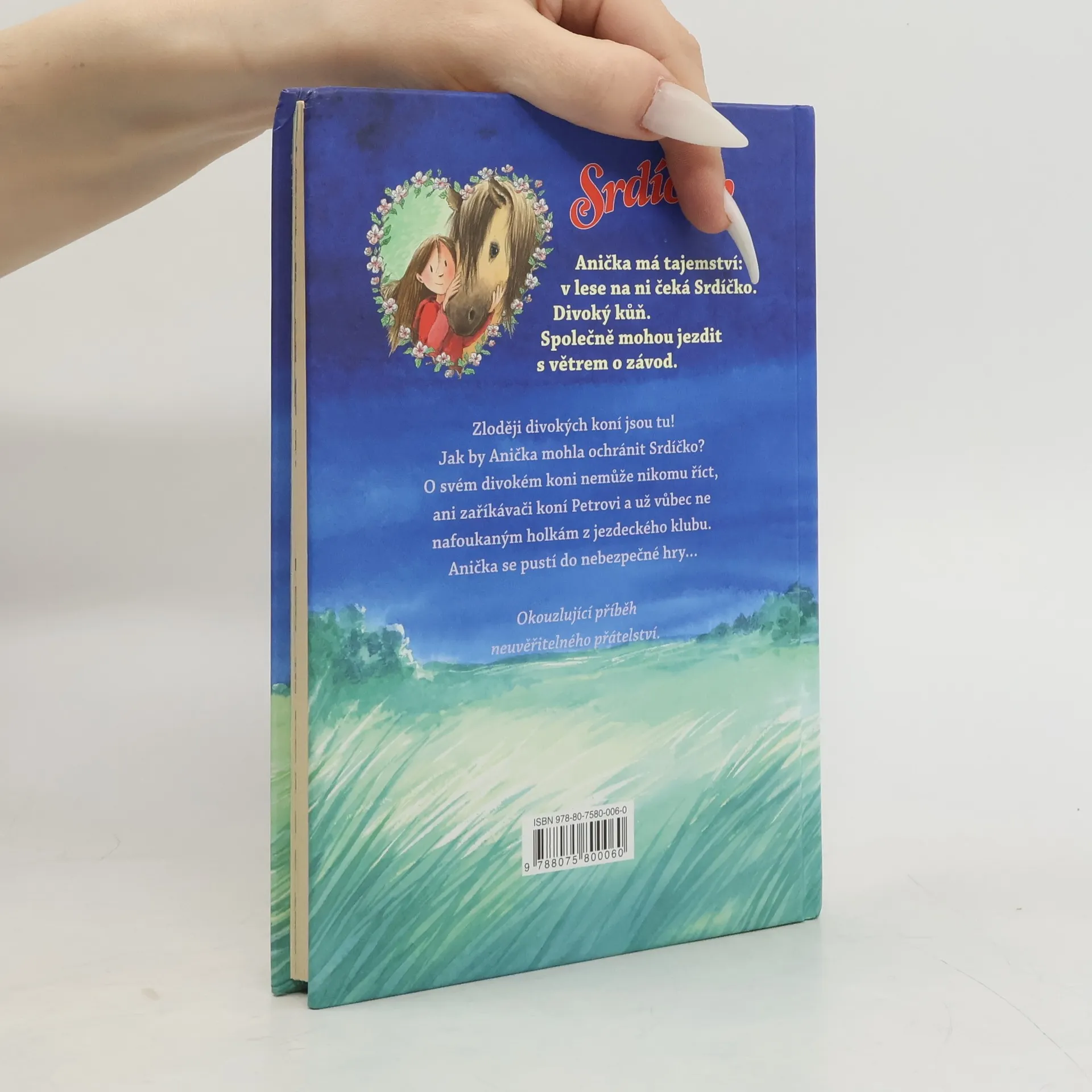 Anička má tajemství: v lese na ní čeká Srdíčko. Divoký kůň. Společně mohou jezdit s větrem o závod. Zloději divokých koní jsou tu! Jak by Anička mohla ochránit Srdíčko? O svém divokém koni nemůže nikomu říct, ani zaříkávači koní Petrovi a už vůbec ne nafoukaným holkám z jezdeckého klubu. Anička se pustí do nebezpečné hry...