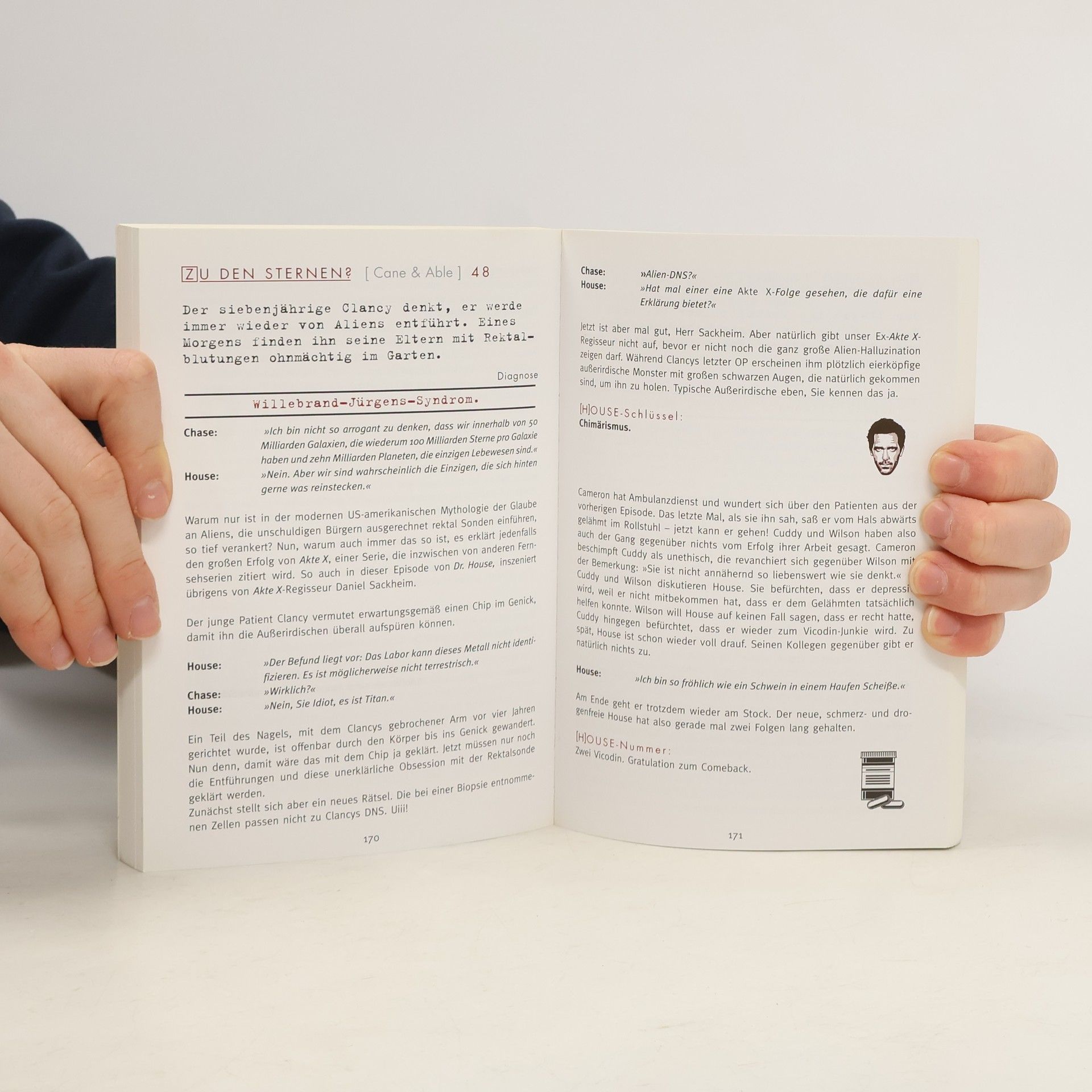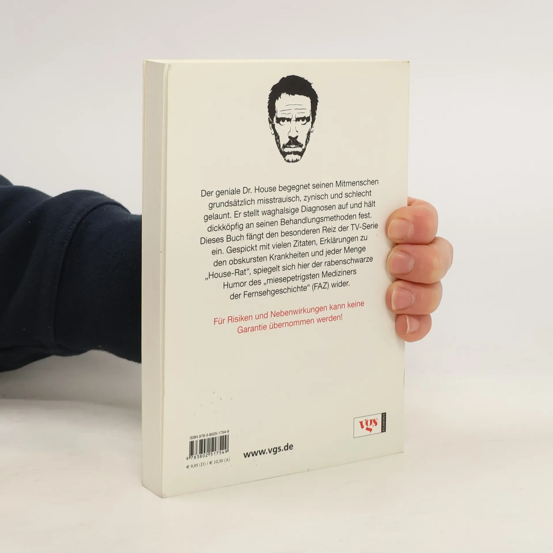 Die kleine House-Apotheke: Dr. House ist ein übelgelaunter, menschenfeindlicher Zyniker, der seine Patienten am liebsten vor den Kopf stößt. Zugleich aber ist Dr. House ein genialer Arzt. Seine Fans verehren ihn, er ist die Kultfigur einer ganzen Fernsehgeneration. Das vorliegende Buch enthält alles, was die Serie so unwiderstehlich macht. So finden sich am Rand der pointierten Episodenzusammenfassungen Rubriken wie „Houseschlüssel“ (Lösung eines medizinischen Problems) und „Housenummer“ (Anzahl der Vicodin-Pillen, die House in einer Folge schluckt), außerdem ein medizinisches Wörterbuch mit Erklärungen der obskursten Krankheitsbilder. Zudem eine Menge „Houserat“: Weisheiten, die House seinen Patienten und uns allen mit auf den Weg gibt („Alle Patienten lügen!“)
