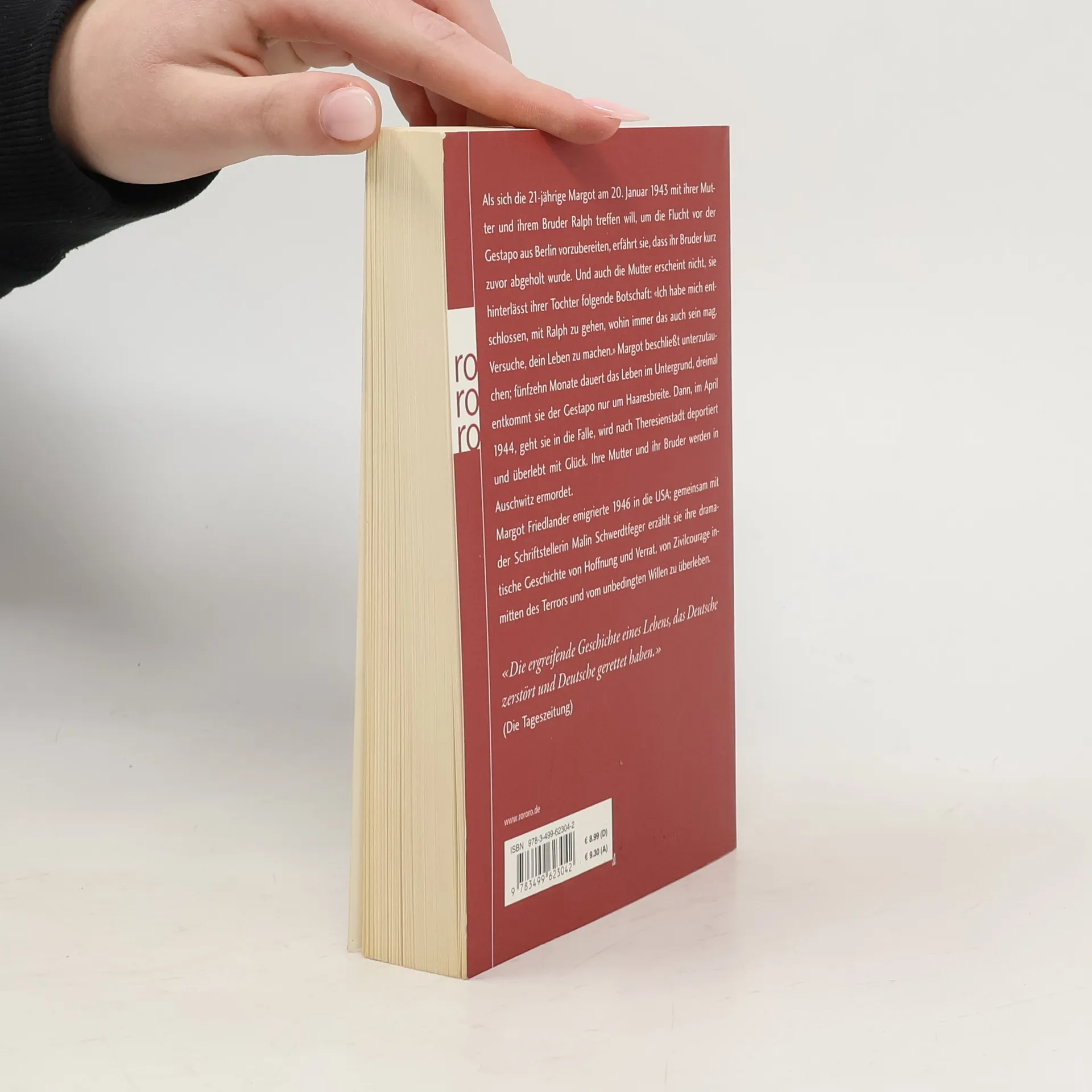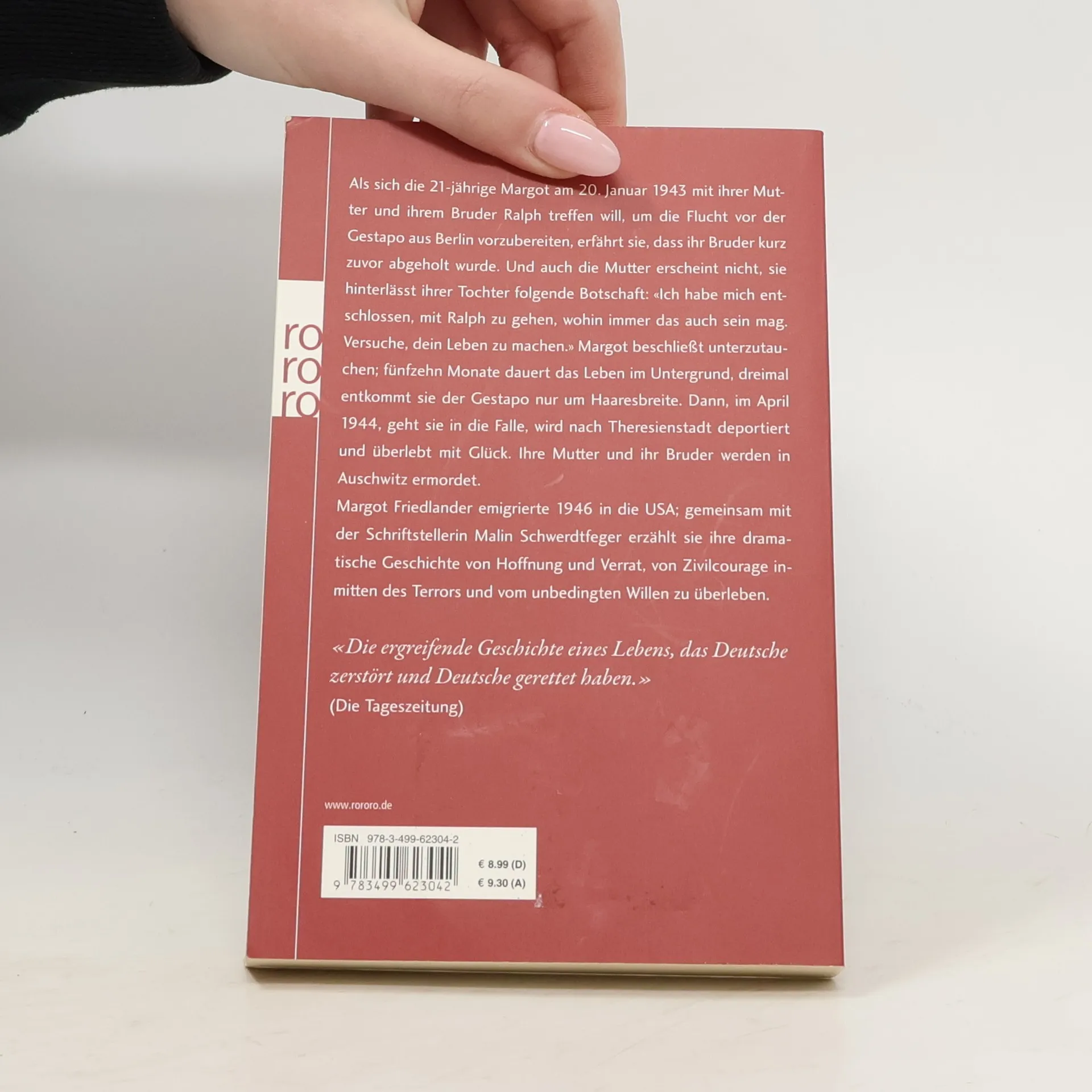 Als sich die 21-jährige Margot am 20. Januar 1943 mit ihrer Mutter und ihrem Bruder Ralph treffen will, um die Flucht vor der Gestapo aus Berlin vorzubereiten, erfährt sie, dass ihr Bruder kurz zuvor abgeholt wurde. Und auch die Mutter erscheint nicht; sie hinterlässt ihrer Tochter folgende Botschaft: «Ich habe mich entschlossen, mit Ralph zu gehen, wohin immer das auch sein mag. Versuche, dein Leben zu machen.» Margot beschließt unterzutauchen; fünfzehn Monate dauert das Leben im Untergrund, dreimal entkommt sie der Gestapo nur um Haaresbreite. Dann, im April 1944, geht sie in die Falle, wird nach Theresienstadt deportiert und überlebt mit Glück. Ihre Mutter und ihr Bruder werden in Auschwitz ermordet. Margot Friedlander emigrierte 1946 in die USA; gemeinsam mit der Schriftstellerin Malin Schwerdtfeger erzählt sie ihre dramatische Geschichte von Hoffnung und Verrat, von Zivilcourage inmitten des Terrors und vom unbedingten Willen zu überleben. «Die ergreifende Geschichte eines Lebens, das Deutsche zerstört und Deutsche gerettet haben.» (Die Tageszeitung)