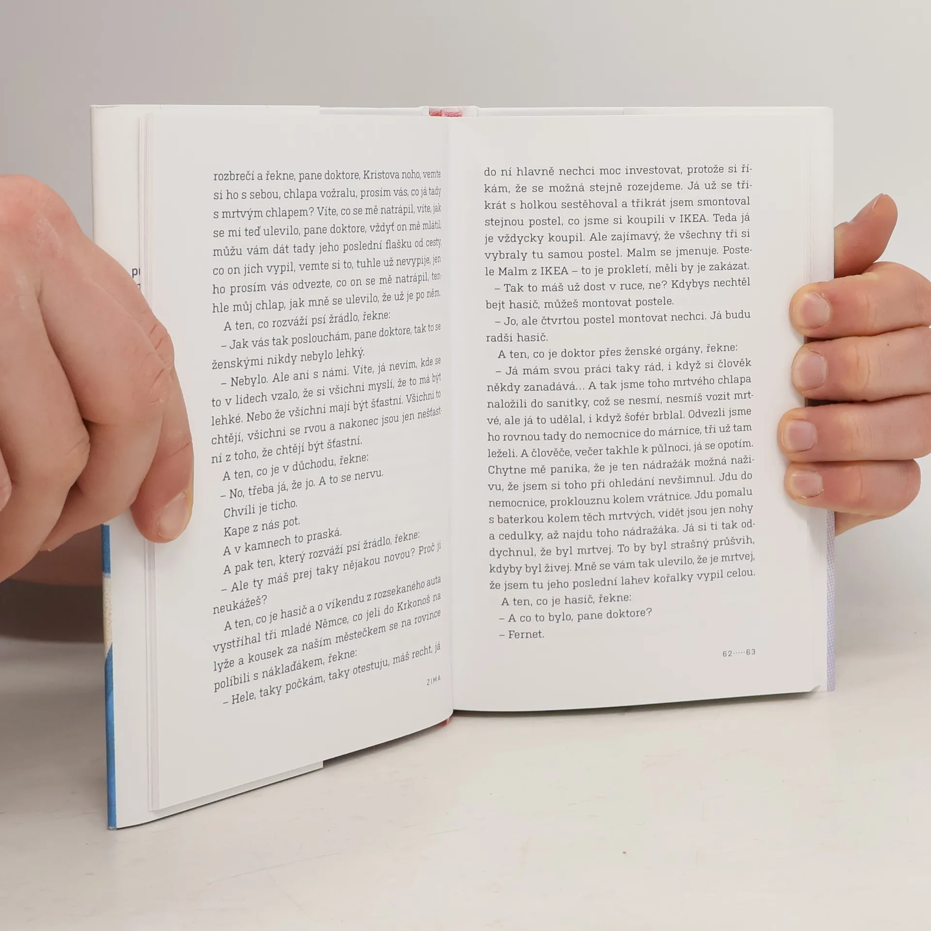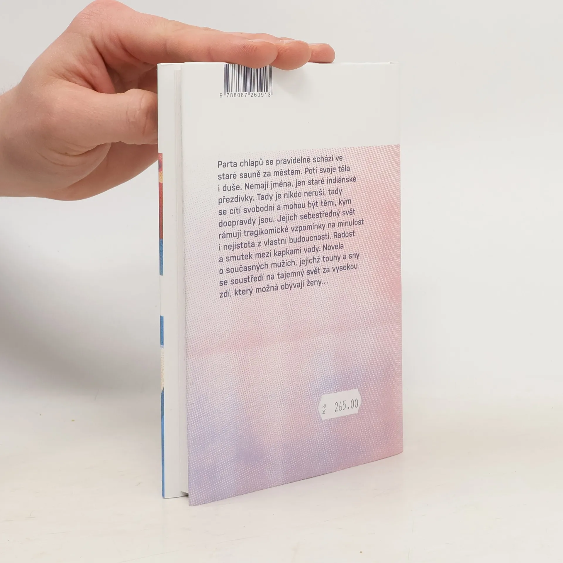 Parta chlapů se pravidelně schází ve staré sauně za městem. Potí svoje těla i duše. Nemají jména, jen staré indiánské přezdívky. Tady je nikdo neruší, tady se cítí svobodní a mohou být těmi, kým doopravdy jsou. Jejich sebestředný svět rámují tragikomické vzpomínky na minulost i nejistota z vlastní budoucnosti. Radost a smutek mezi kapkami vody. Novela o současných mužích, jejichž touhy a sny se soustředí na tajemný svět za vysokou zdí, který možná obývají ženy…