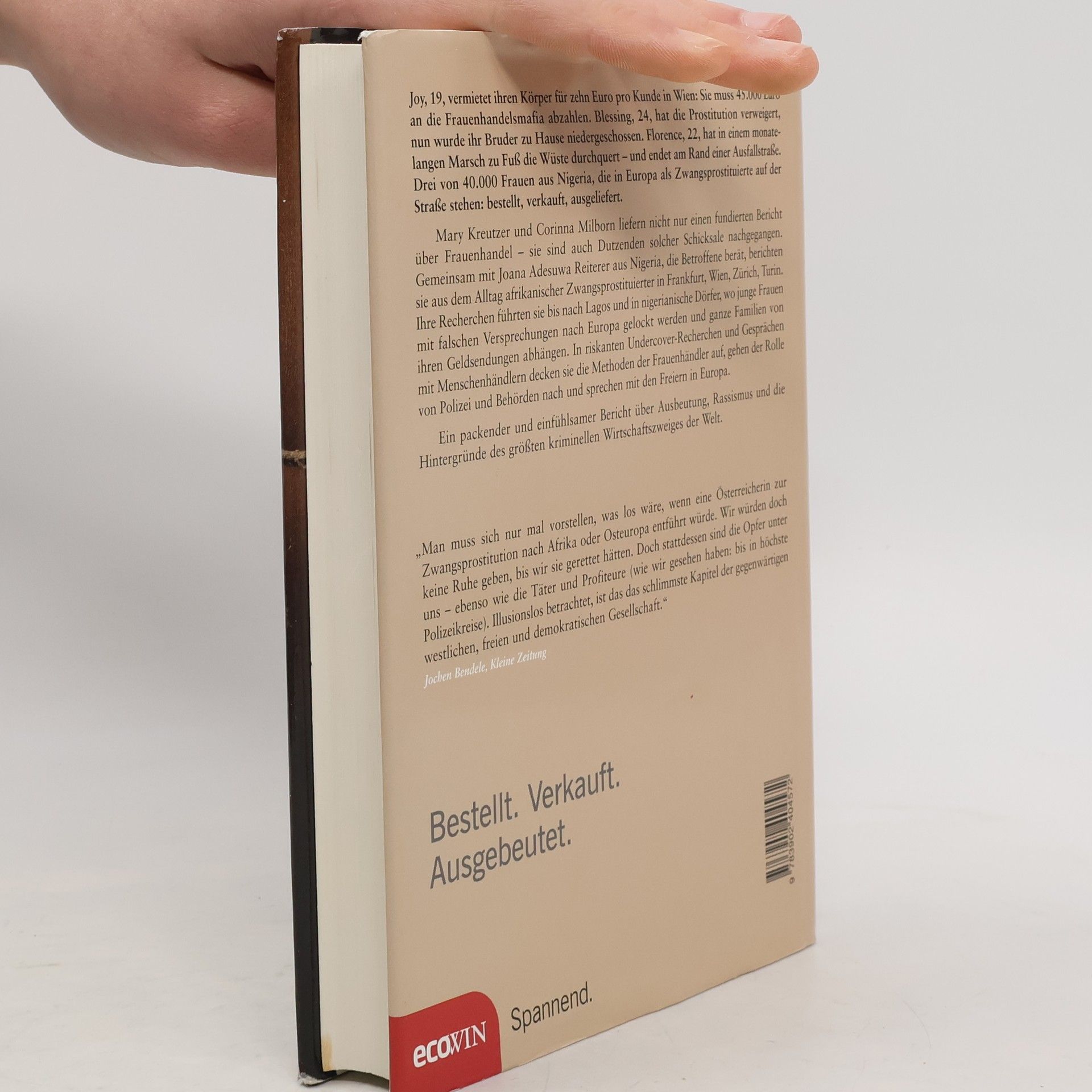 Joy, 19, vermietet ihren Körper für zehn Euro pro Kunde in Wien: Sie muss 45.000 Euro an die Frauenhandels-Mafia abzahlen. Blessing, 24, hat die Prostitution verweigert, nun wurde ihr Bruder zu Hause niedergeschossen. Florence, 22, hat in einem monatelangen Marsch zu Fuß die Wüste durchquert – und endet am Rand einer Ausfallstraße. Drei von 40.000 Frauen aus Nigeria, die in Europa als Zwangsprostituierte auf der Straße stehen: bestellt, verkauft, ausgeliefert. Mary Kreutzer und Corinna Milborn liefern nicht nur einen fundierten Bericht über Frauenhandel – sie sind auch Dutzenden solcher Schicksale nachgegangen. Gemeinsam mit Joana Adesuwa Reiterer aus Nigeria, die Betroffene berät, berichten sie aus dem Alltag afrikanischer Zwangsprostituierter in Wien, Frankfurt, Berlin. Ihre Recherchen führten sie bis nach Lagos und in nigerianische Dörfer, wo junge Frauen mit falschen Versprechungen nach Europa gelockt werden und ganze Familien von ihren Geldsendungen abhängen. In riskanten Undercover-Recherchen und Gesprächen mit Menschenhändlern decken sie die Methoden der Frauenhändler auf, gehen der Rolle von Polizei und Behörden nach und sprechen mit den Freiern in Europa. Ein packender und einfühlsamer Bericht über Ausbeutung, Rassismus und die Hintergründe des größten kriminellen Wirtschaftszweiges der Welt.