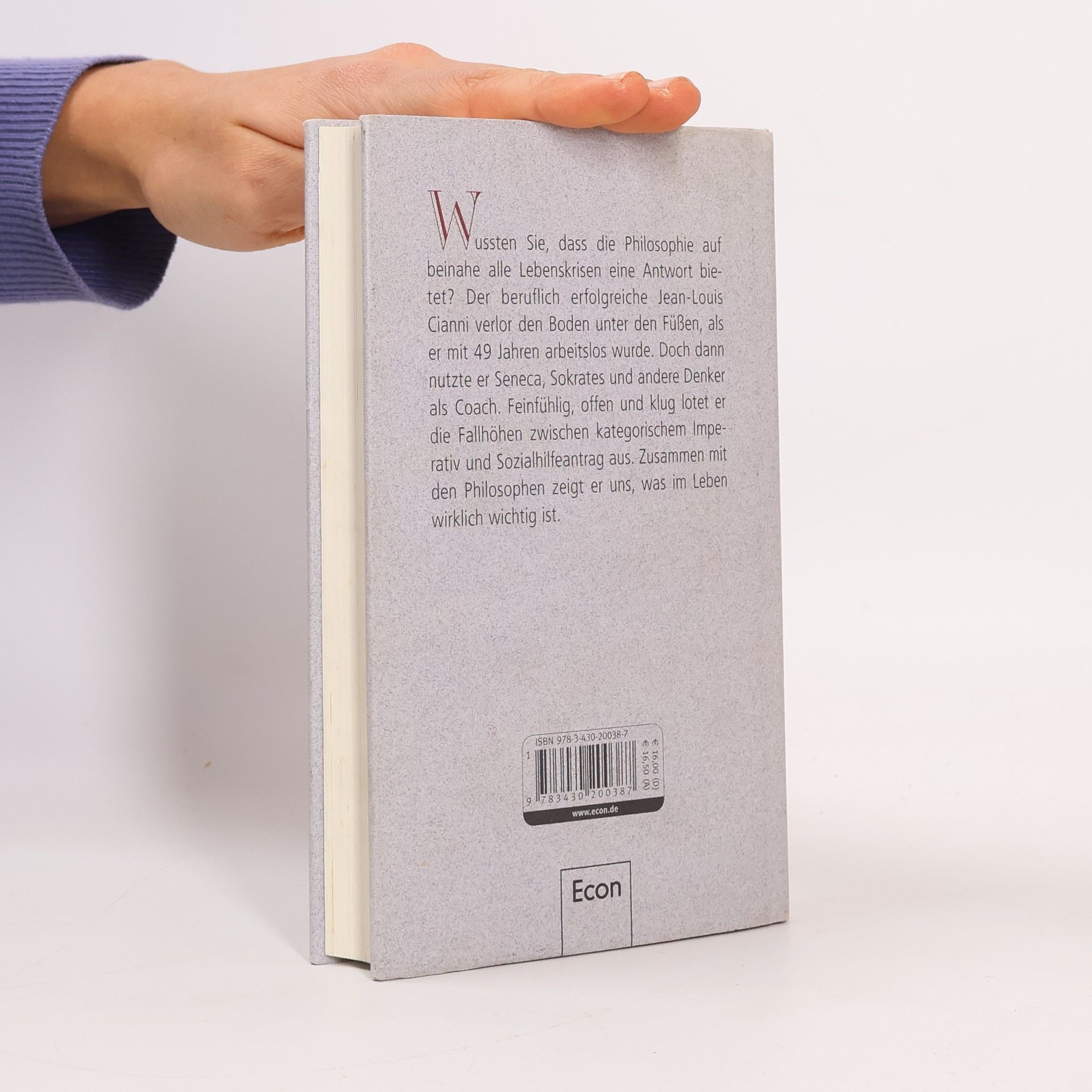Jean-Louis Cianni wird mit 49 arbeitslos. Der ehemalige PR-Chef droht den Boden unter den Füßen zu verlieren – bis er Trost in der Philosophie findet. Statt jeden Tag ins Büro geht er in die Bibliothek seiner alten Universität, wo er die Schriften der großen Denker studiert. Kurzum: Er nutzt Seneca, Sokrates und andere Denker als Coach. Spinoza lehrt ihn, im Abseits zu überleben und Montaigne bringt ihm bei, die Faust zu ballen. Während er dank Schopenhauer über abtrünnige Freunde hinweggkommt, inspiriert ihn Augustinus zu einem neuen Umgang mit der Zeit.