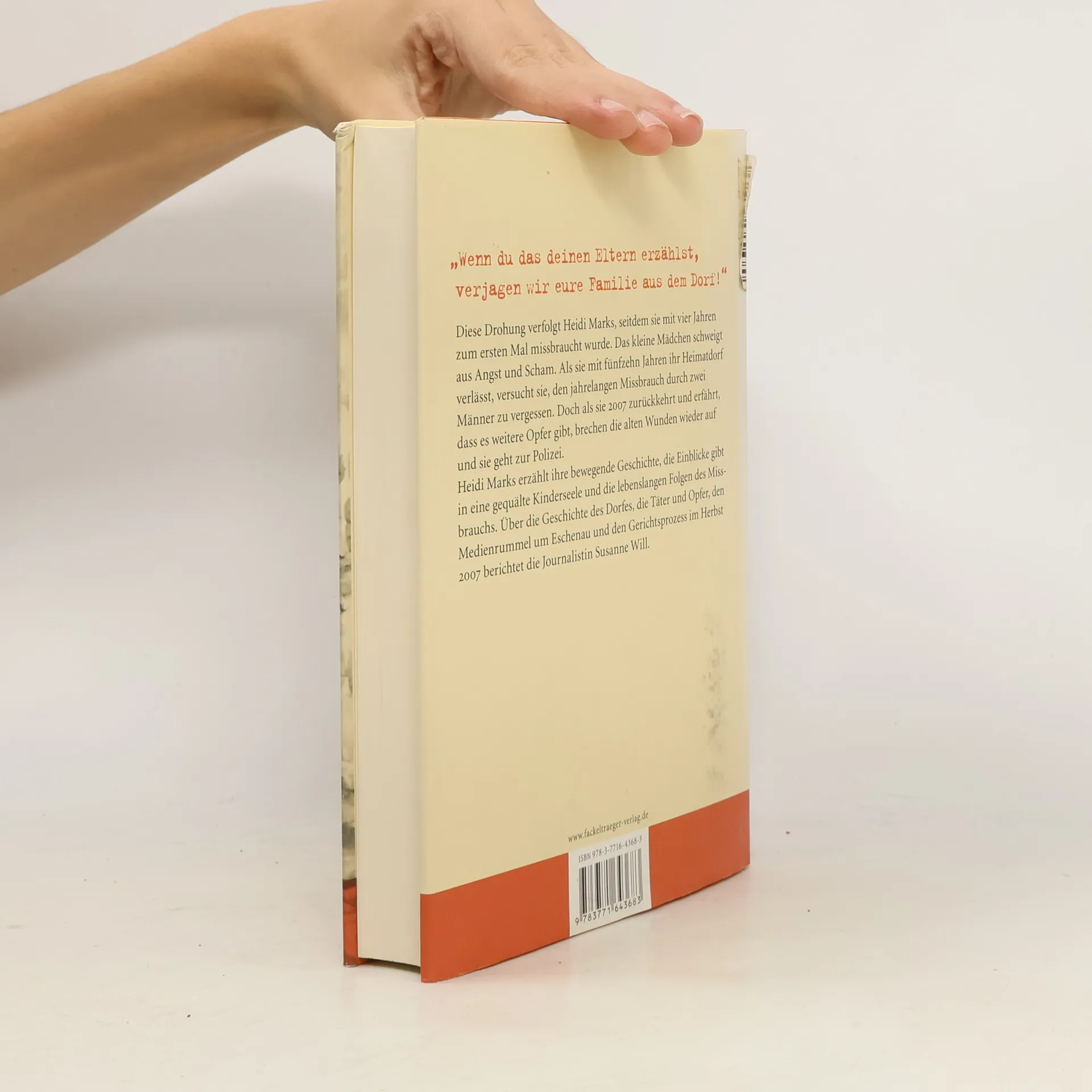 „Wenn Du das Deinen Eltern erzählst, verjagen wir Eure Familie aus dem Dorf!“ Dieser Satz verfolgt Heidi Marks seit fast fünfzig Jahren. Damit gedroht haben ihr zwei Männer aus ihrem Heimatdorf Eschenau, die sie mit vier Jahren erstmals missbrauchten. Das kleien Mädchen schwieg aus Angst, zoch sich immer mehr zurück. Im frühen Erwachsenenalter flüchtet Heidi Marks aus der 192-Seelen-Gemeinde in die Vereinigten Staaten. Erst als sie im Frühjahr 2007 nach Eschenau zurückkehrt, bricht sie das Schweigen und erfährt, dass sie nicht das einzige Opfer ist. Über vierzig Jahre würden kleine Mädchen von den beiden Männern vergewaltigt und keiner will es bemerkt haben. Heidi Marks erzählt ihre Geschicht, die tief bewegend ist und Einblicke gibt in eine geschundene Kinderseele und die lebenlangen Folgenen eines Missbrachs. Über die Geschcihte des Dorfes, die Täter und Opfer, den Medienrummel und den Gerichtsprozess berichtet die Journalistin Susanne Will.