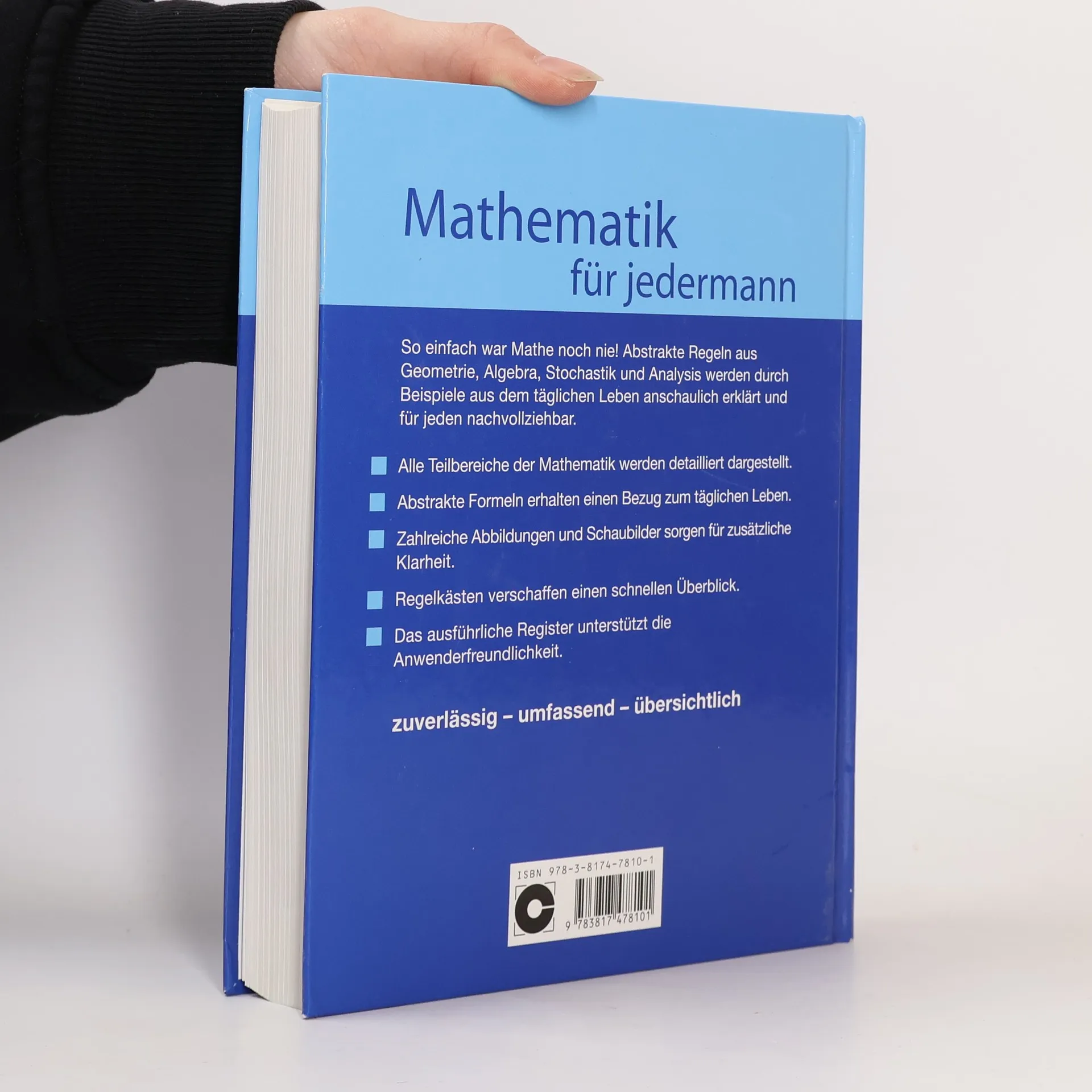 Der Titel behandelt alle wichtigen Teilbereiche der Mathematik von Arithmetik und Algebra über Geometrie und Analysis bis zur Stochastik. Das Nachschlagewerk bietet darüber hinaus anschauliche Erklärungen und stellt Bezüge zu alltäglichen Begebenheiten her. Dadurch gelingt es dem Leser, eine Verbindung zwischen den Geschehnissen seines täglichen Lebens und den abstrakten Regeln der Mathematik herzustellen. Zudem tragen viele Schaubilder zum leichten Verständnis der mathematischen Sachverhalte bei. Regelkästen heben die wichtigsten Regeln nochmals optisch hervor. Ein Inhaltsverzeichnis am Buchanfang und ein Register im hinteren Teil des Buches ermöglichen einen schnellen Überblick und Zugriff auf gesuchte Begriffe.