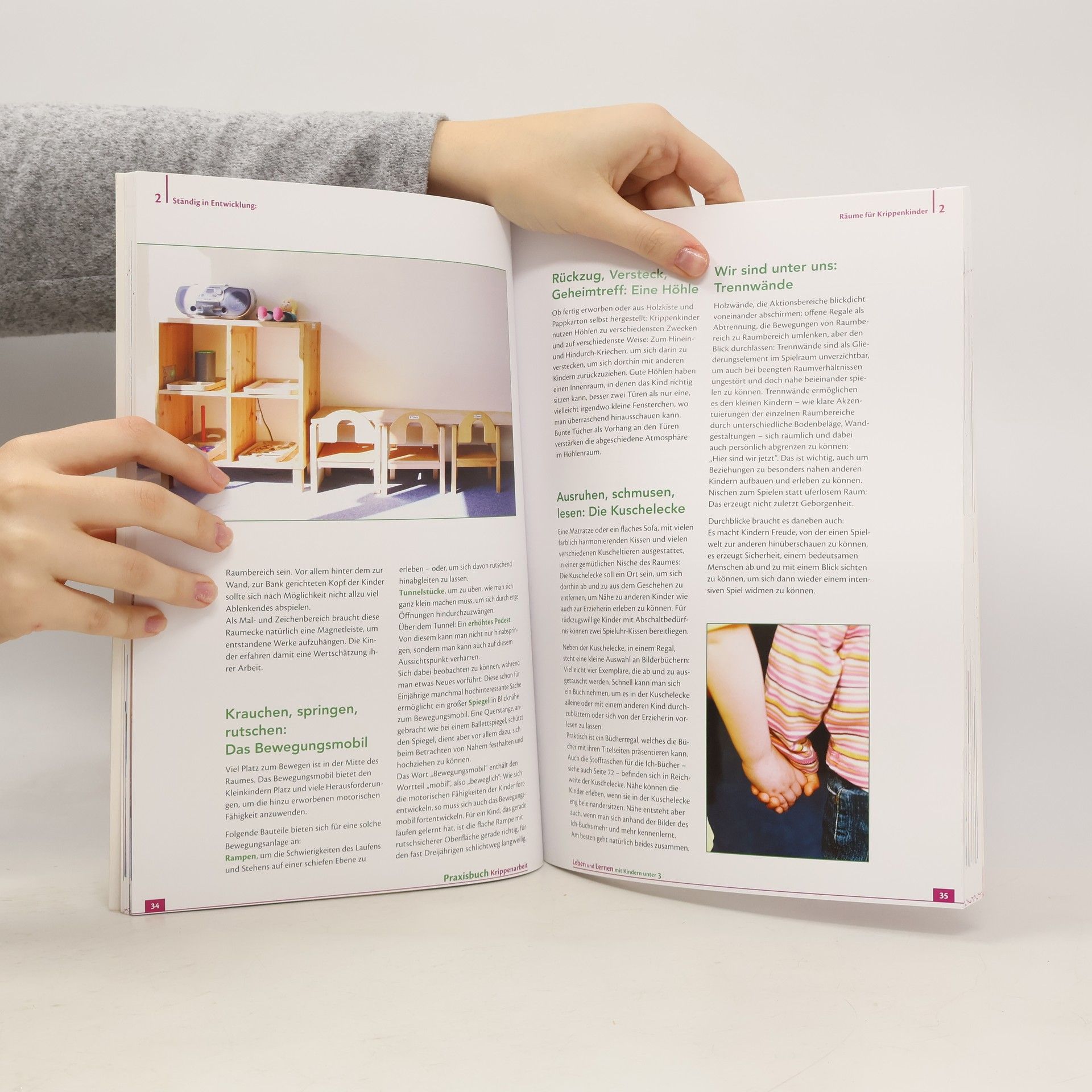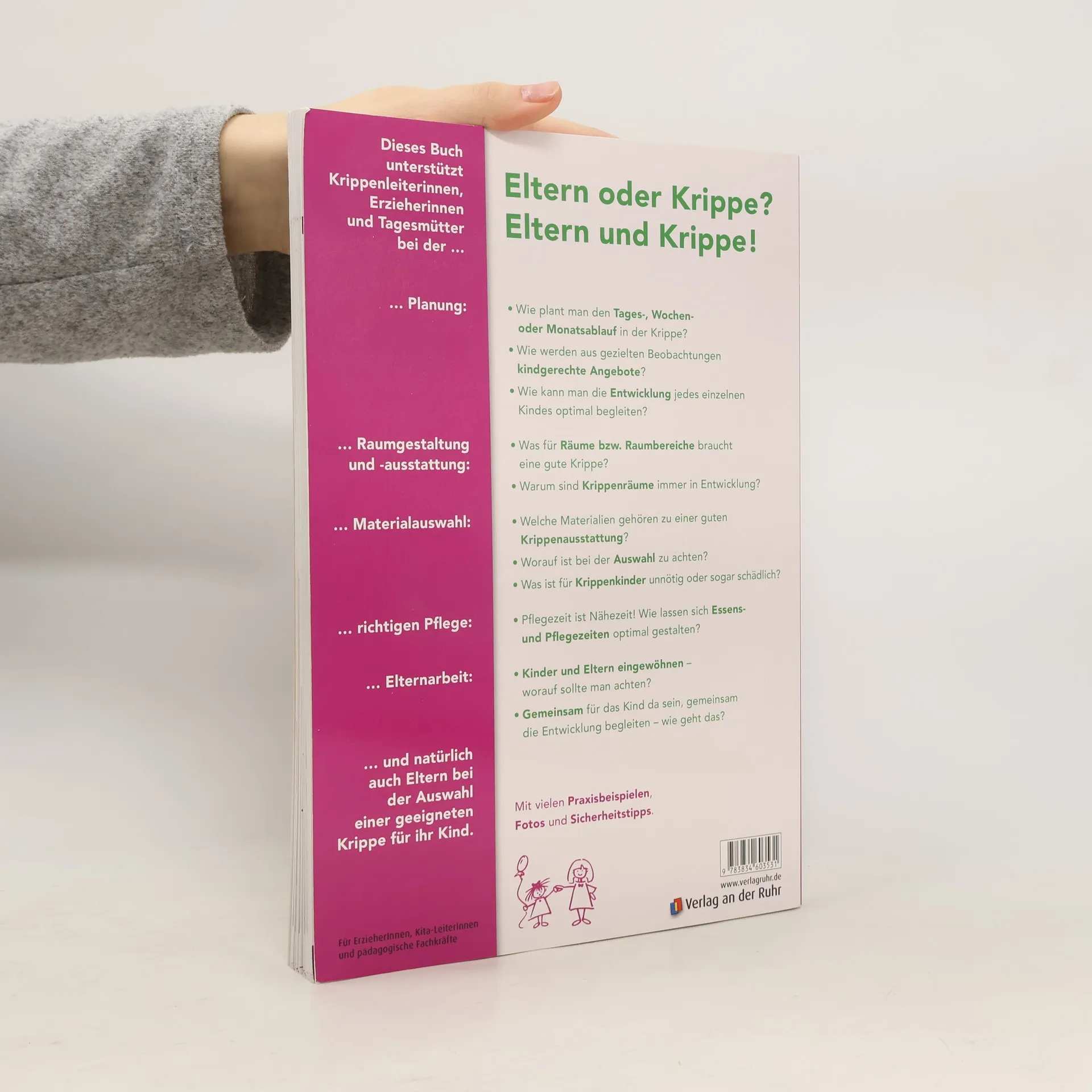 Wer Kinder unter drei Jahren bei ihrer Lernentwicklung begleiten möchte, muss ihre Bedürfnisse und ihre Wege, sich die Welt zu erschließen, gut kennen. Wie müssen die Räume gestaltet sein, um ihnen eine sichere und anregende Lernumgebung zu schaffen? Welches Material ist sinnvoll? Anhand zahlreicher praktischer Beispiele zeigen die Autoren, wie Krippenarbeit erfolgreich gelingt. Sie räumen auf mit typischen Erziehungsirrtümern (z. B. „Ordnung halten kann man nicht früh genug lernen“) und zeigen, dass auch scheinbar Alltägliches wie Essens- und Pflegephasen oder das Ausräumen von Schubladen für Kinder wichtige Lernsituationen sind. Die vielen Praxisideen lassen sich sowohl in der Krippe als auch zu Hause umsetzen. Mit Tipps zur Entwicklungsdokumentation, sowie verschiedenen Checklisten für den Umgang mit den Kleinsten liefert dieses Buch nicht nur ErzieherInnen und Tagesmüttern eine Arbeitsgrundlage, sondern auch Eltern eine Hilfe zur Qualitätsbeurteilung und Auswahl einer Krippe.