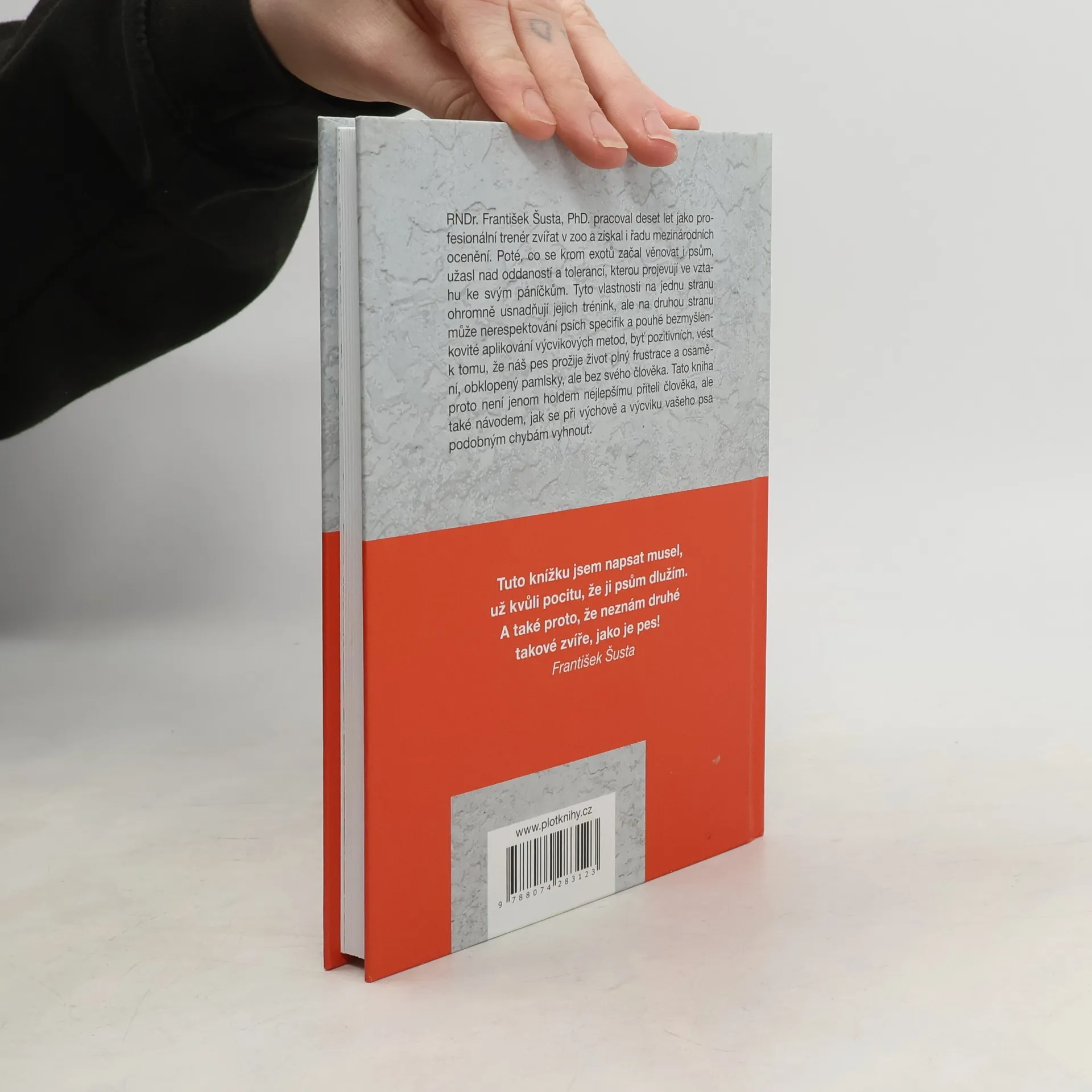 RNDr. František Šusta, PhD. pracoval deset let jako profesionální trenér zvířat v zoo a získal i řadu mezinárodních ocenění. Poté, co se krom exotů začal věnovat i psům, užasl nad oddaností a tolerancí, kterou projevují ve vztahu ke svým páníčkům. Tyto vlastnosti na jednu stranu ohromně usnadňují jejich trénink, ale na druhou stranu může nerespektování psích specifik a pouhé bezmyšlenkovité aplikování výcvikových metod, byť pozitivních, vést k tomu, že náš pes prožije život plný frustrace a osamění, obklopený pamlsky, ale bez svého člověka. Tato kniha proto není jenom holdem nejlepšímu příteli člověka, ale také návodem, jak se při výchově a výcviku vašeho psa podobným chybám vyhnout. "Tuto knížku jsem napsat musel, už kvůli pocitu, že ji psům dlužím. A také proto, že neznám druhé takové zvíře, jako je pes!" František Šusta