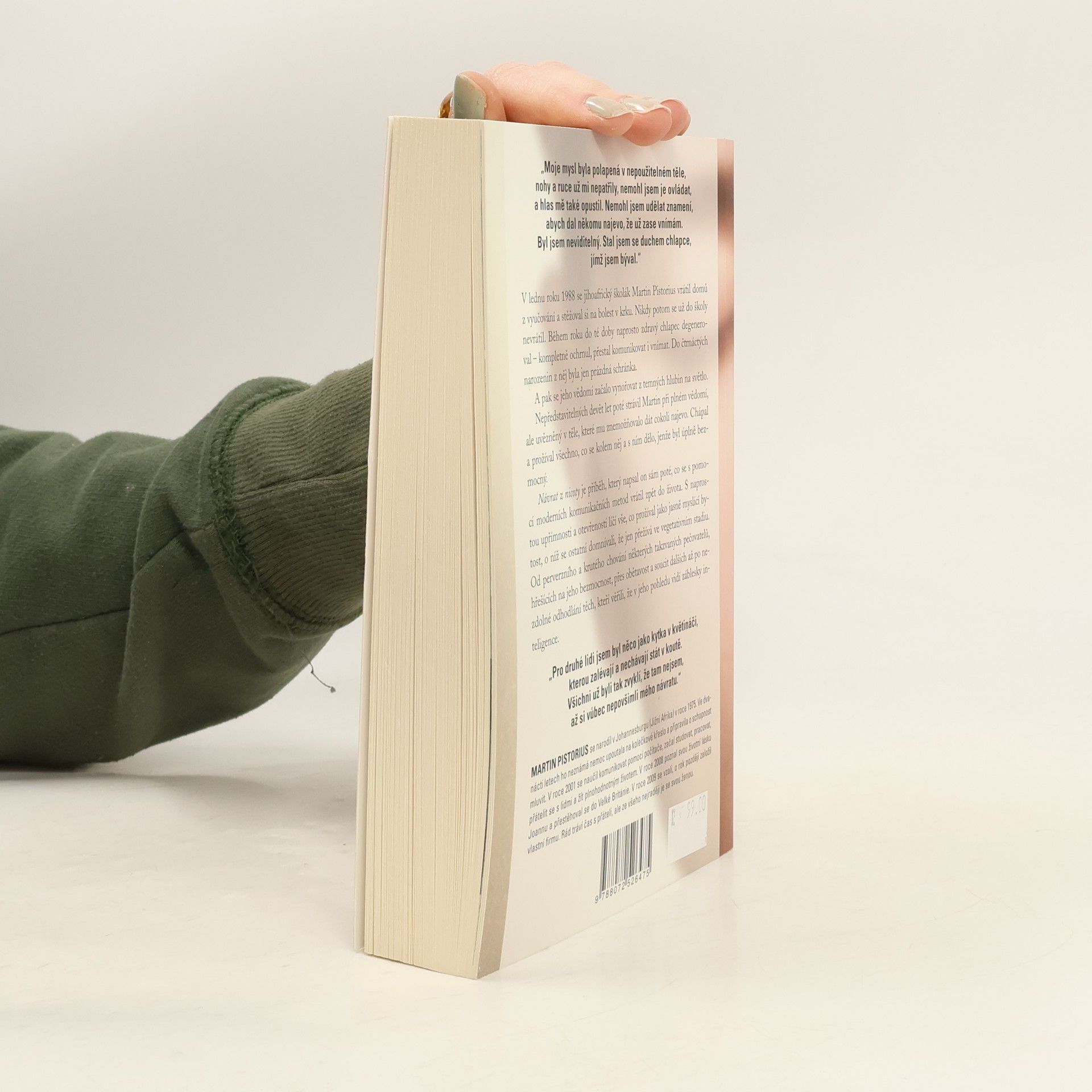 Strhující vítězství chlapce, jenž se stal vězněm vlastního těla Deset let žil ve vegetativním stavu a jen on sám věděl, že je při plném vědomí. Nyní vypráví svůj neuvěřitelný, úžasný a zároveň otřesný příběh, který se stal světovým bestsellerem. V lednu roku 1988 se jihoafrický školák Martin Pistorius vrátil domů z vyučování a stěžoval si na bolest v krku. Nikdy potom se už do školy nevrátil. Během roku dosud naprosto zdravý chlapec degeneroval – kompletně ochrnul, přestal komunikovat i vnímat. Do čtrnáctých narozenin z něj byla jen prázdná schránka. Nepředstavitelných deset let poté strávil při plném vědomí, ale uvězněný v těle, které mu znemožňovalo dát cokoli najevo. Chápal a prožíval všechno, co se kolem něj a s ním dělo, jenže byl úplně bezmocný, pokud šlo o komunikaci. Návrat z nicoty je příběh, který napsal sám Martin poté, kdy se s pomocí moderních komunikačních metod vrátil zpět do života. S naprostou upřímností a otevřeností líčí vše, co prožíval jako jasně myslící bytost, o níž se ostatní domnívali, že jen přežívá ve vegetativním stadiu. Od perverzního a krutého chování některých takzvaných pečovatelů, hřešících na jeho bezmocnost, přes obětavost a soucit dalších až po nezdolné odhodlání těch, kteří věřili, že v jeho pohledu vidí záblesky inteligence.