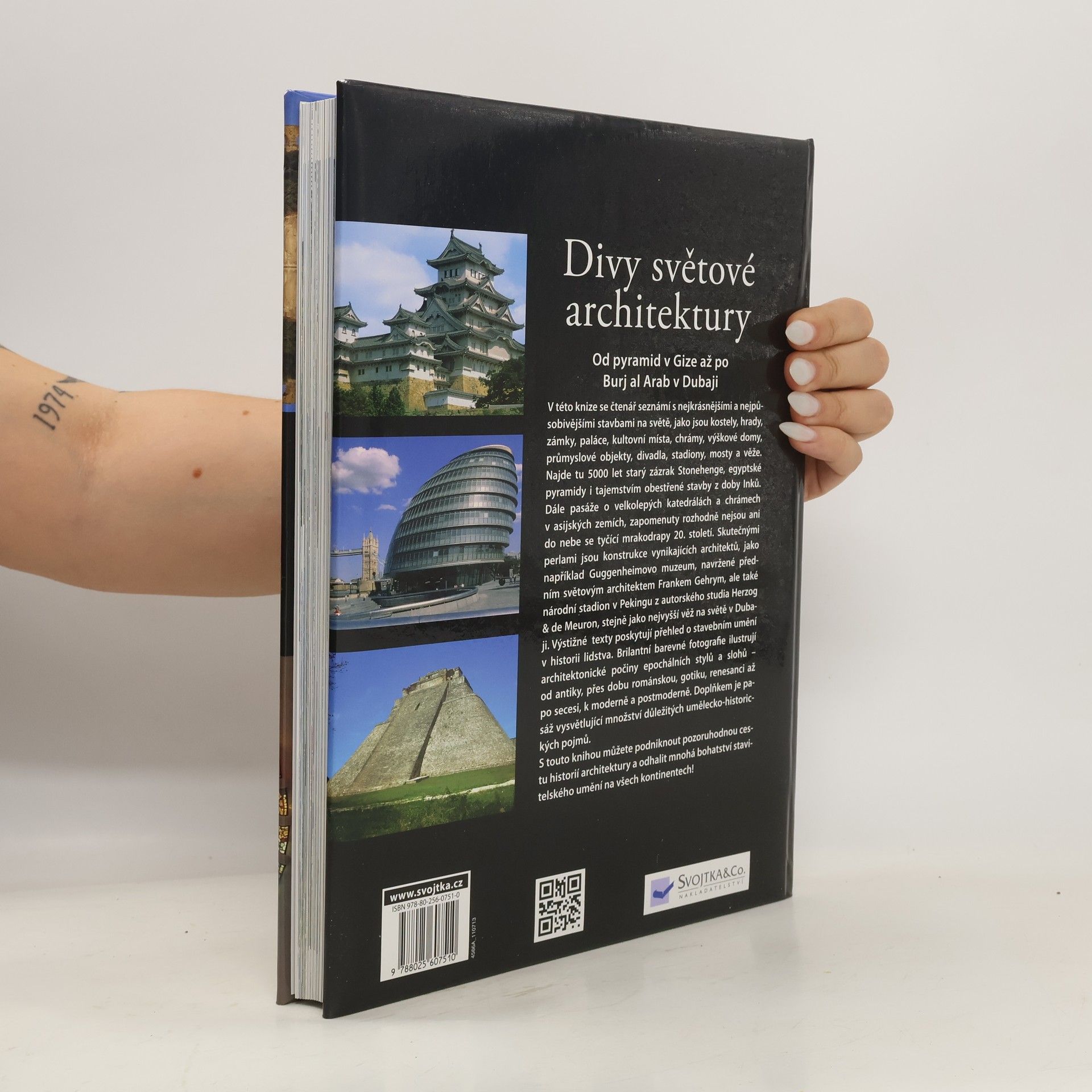 V této knize se můžete seznámit s nejkrásnějšími a nejpůsobivějšími stavbami na světě, jako jsou kostely, hrady, zámky, paláce, kultovní místa, chrámy, výškové budovy, průmyslové objekty, divadla, stadiony, mosty a veže. Najdete tu např. zmínku o 5000 let starém stavitelském zázraku zvaném Stonehenge, o egyptských pyramidách či o tajemstvím obestřených stavbách říše Inků. Obsáhlé jsou pasáže o velkolepých katedrálách, chrámech v asijských zemích, zapomenuty rozhodně nejsou ani do nebe se tyčící mrakodrapy 20. stolení. Výstižné informativní texty poskytují ucelený přehled o stavebním umění v historii lidstva. Brilantní barevné fotografie ilustrují architektonické počiny epochálních stylů a slohů - od antiky přes dobu románskou, gotiku, renesanci až po secesi, k moderně a postmoderně. Doplňkem je pasáž vysvětlující množství důležitých umělecko-historických pojmů. S touto knihou můžete podniknout pozoruhodnou cestu historií architektury a odhalit bohatství stavitelského umění na všech kontinentech!