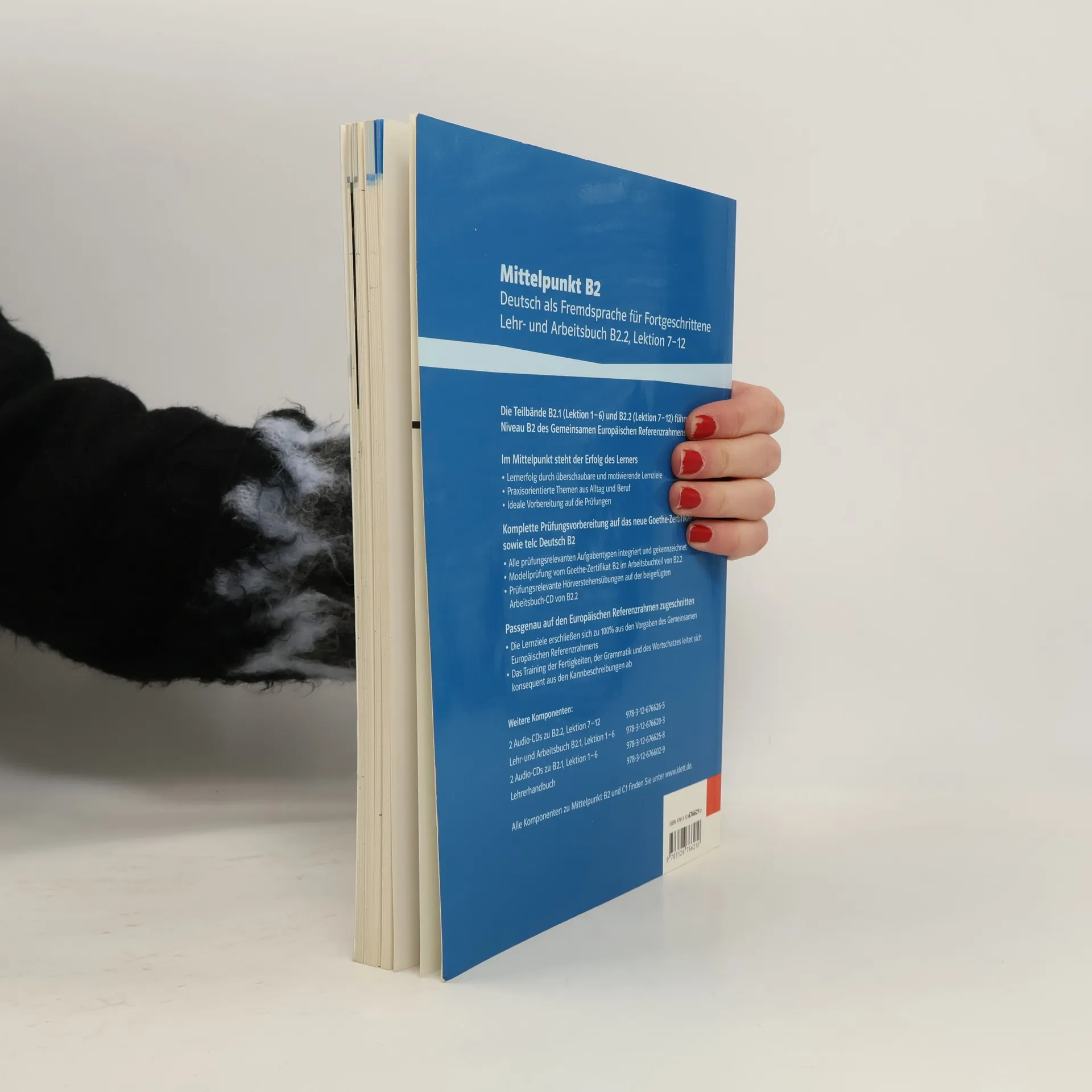 Die Teilbânde B2.1 (Lektion 1- 6) und B2.2 (Lektion 7-12) führen zum Niveau B2 des Gemeinsamen Europâischen Referenzrahmens. Im Mittelpunkt steht der Erfolg des Lerners : Lernerfolg durch überschaubare und motivierende Lernziele ; Praxisorientierte Themen aus Alltag und Beruf ; Ideale Vorbereitung auf die Prüfungen. Komplette Prüfungsvorbereitung auf das neue Goethe-Zertifikat B2 sowie telc Deutsch B2 : Aile prüfungsrelevanten Aufgabentypen integriert und gekennzeichnet ; Modellprüfung vom Goethe-Zertifikat B2 im Arbeitsbuchteil von B2.2 ; Prüfungsrelevante Hiirverstehensübungen auf der beigefügten Arbeitsbuch-CD von B2.2. Passgenau auf den Europâischen Referenzrahmen zugeschnitten : Die Lernziele erschlie1 en sich zu 100% aus den Vorgaben des Gemeinsamen Europâischen Referenzrahmens ; Das Training der Fertigkeiten, der Grammatik und des Wortschatzes Ieitet sich konsequent aus den Kannbeschreibungen ab.