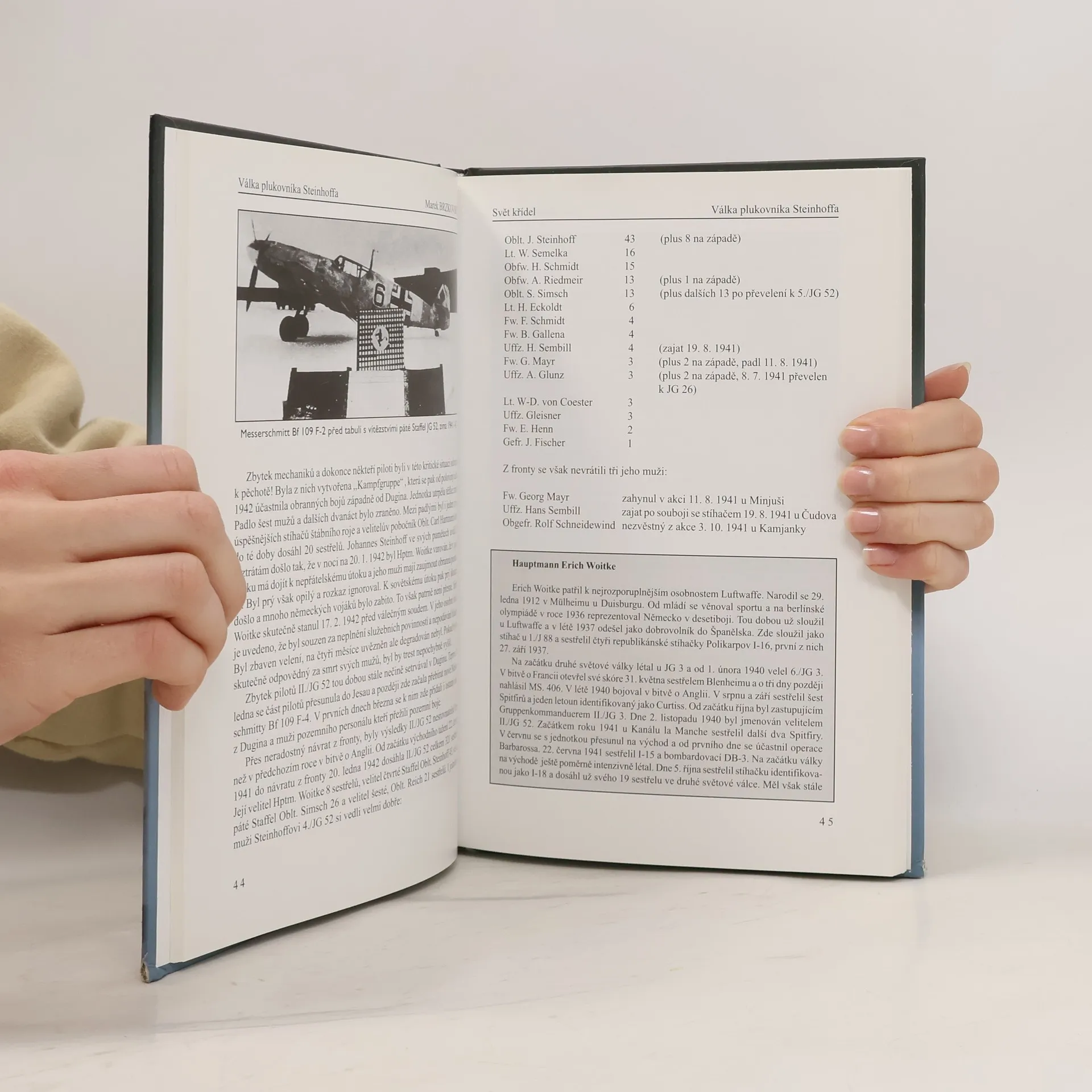 Stíhací esa Luftwaffe, jako Erich Hartmann a Gerhard Barkhorn, s neuvěřitelnými počty sestřelů vzbuzovala po válce nedůvěru, často považována za propagandu. V pozdějších letech, s výzkumem leteckých bojů, se však ukázalo, že většina německých záznamů je reálná. Jedním z významných pilotů byl Johannes Steinhoff, který bojoval od začátku války až do jara 1945. Začínal jako noční stíhač a účastnil se mnoha klíčových operací, včetně bitvy o Anglii a operace Barbarossa. Jeho úspěchy zahrnovaly 150 vzdušných vítězství, přičemž byl dvanáctkrát sestřelen a absolvoval 993 bojových letů. Steinhoffova kariéra ilustruje historii Luftwaffe od jejích počátků až po úpadek na konci války. Válku přežil a později publikoval své vzpomínky a poskytoval rozhovory historikům, čímž zanechal cenné svědectví. Ačkoli nebyl fanatickým nacistou a nesouhlasil s Hitlerem a Göringem, bojoval za Třetí říši více než pět let. Čtenáři ocení jeho osobní statečnost a schopnosti jako pilota a velitele, který se postavil za své muže v těžkých situacích. Přesto je důležité mít na paměti, jaký režim zastupoval a jaké by byly důsledky jeho vítězství pro Evropu.