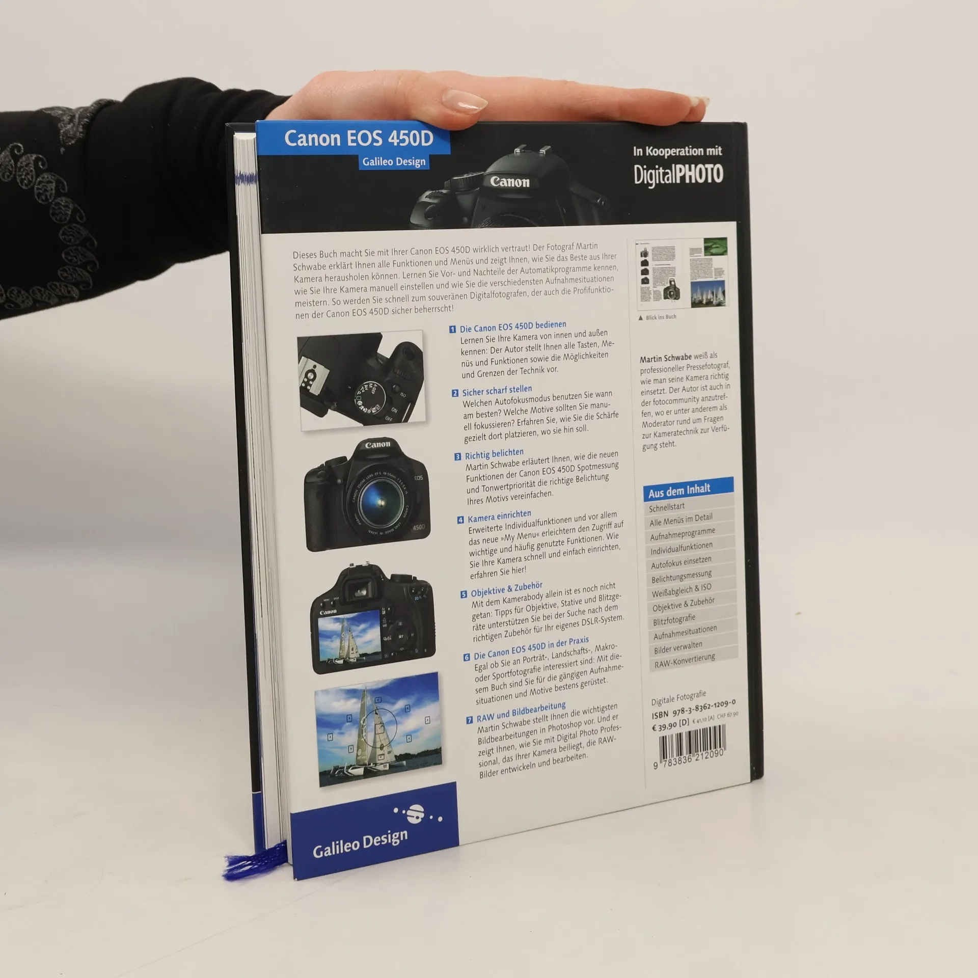 Mit diesem umfassenden Handbuch bleibt Ihnen kein Funktion der Canon EOS 450D verborgen! Der Profifotograf Martin Schwabe zeigt Ihnen, was alles in Ihrer EOS 450D steckt und wie Sie die Kamera sicher und zielführend bedienen: Von der Belichtung, über die Fokussierung bis hin zum Weißabgleich. Lernen Sie die neue Spotmessung kennen und experimentieren Sie mit der Live View, einem Feature aus der semiprofessionellen Canon EOS 40D. Außerdem stellt Ihnen Martin Schwabe aktuelle Objektive und weiteres Zubehör vor – nicht nur von Canon –, mit dem Sie die EOS 450D zu Ihrem ganz eigenen DSLR-System erweitern können.
