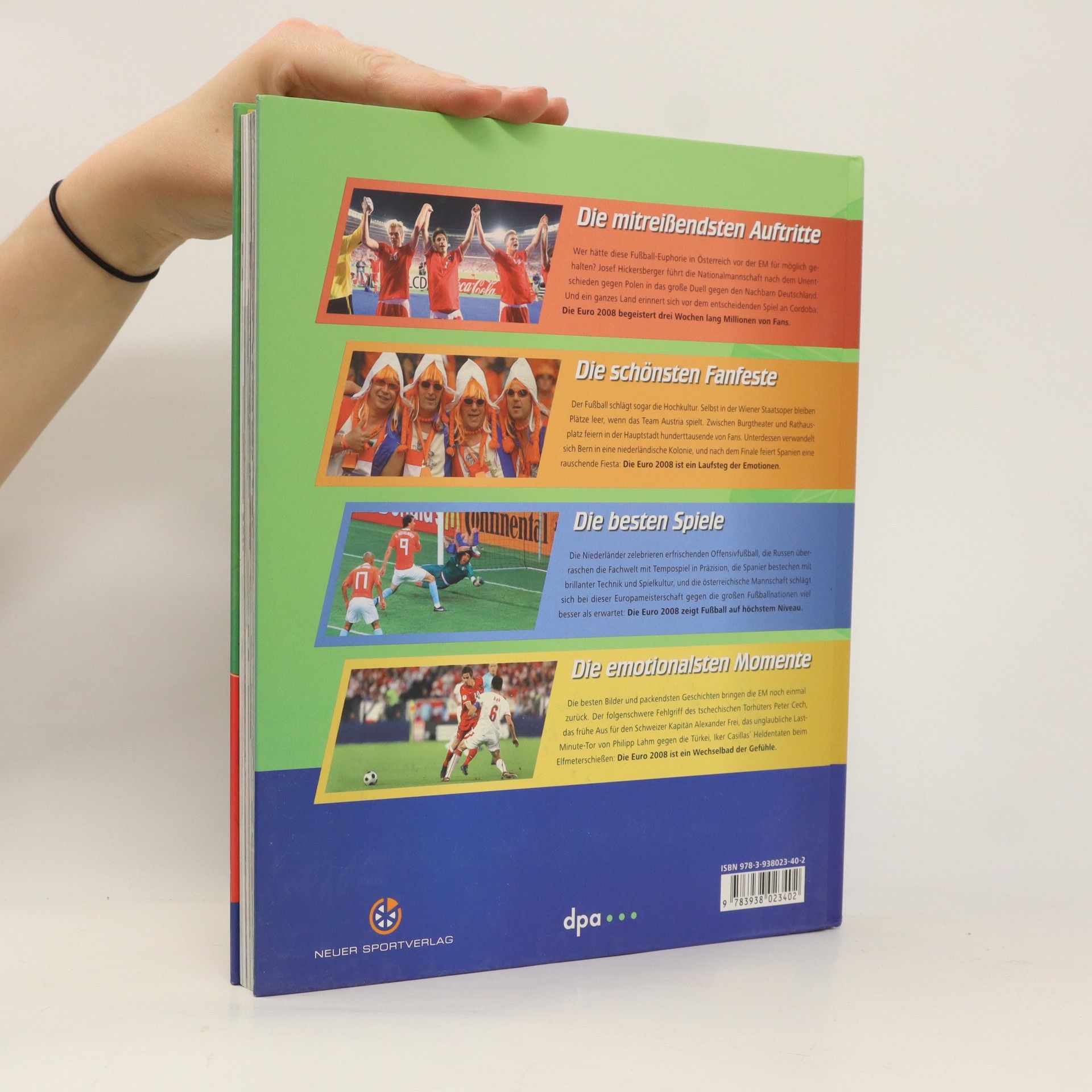 EM 08 – Landesausgabe Österreich: Erleben Sie mit dem faszinierenden Bildband „EM 08” noch einmal die emotionalsten Momente der Fussball-Europameisterschaft. Schlagen Sie nach, wie sich Ihr Team durch die Vorrunde gekämpft und wer gewonnen hat. Welche Mannschaft die verrücktesten Fans hatte und wo am meisten gefeiert wurde. „EM 08” zeigt das Fan-Geschehen rund um die Spielorte in der Schweiz und Österreich. Über 500 Hochglanz-Fotografien zu den Spielen und Fan-Festen, Spielberichte zu allen Begegnungen, Spieler-Portraits der Österreichischen Nationalmannschaft und eine umfangreiche Turnierdokumentation mit Bildern aller Teams machen diesen Bildband zur Pflichtlektüre und faszinierenden Erinnerung an das Fussball Ereignis 2008.