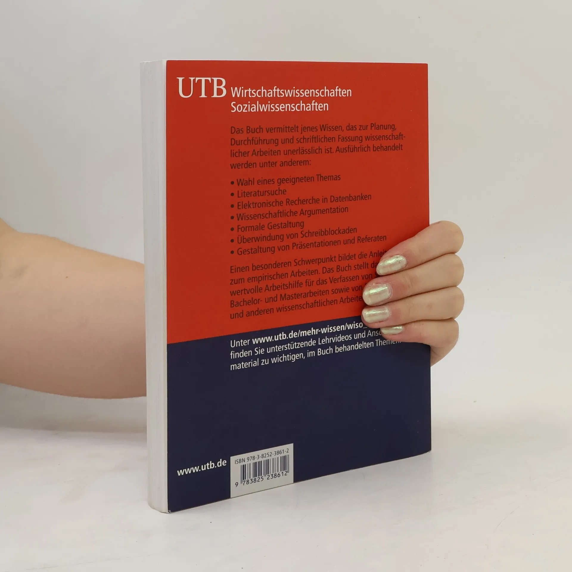 Das Buch vermittelt jenes Wissen, das zur Planung, Durchführung und schriftlichen Fassung wissenschaftlicher Arbeiten unerlässlich ist. Ausführlich behandelt werden unter anderem: Wahl eines geeigneten Themas Literatursuche Elektronische Recherche in Datenbanken Wissenschaftliche Argumentation Formale Gestaltung Überwindung von Schreibblockaden Gestaltung von Präsentationen und Referaten Einen besonderen Schwerpunkt bildet die Anleitung zum empirischen Arbeiten. Das Buch stellt damit eine wertvolle Arbeitshilfe für das Verfassen von Seminar-, Bachelor- und Masterarbeiten sowie von Dissertationen und anderen wissenschaftlichen Arbeiten dar.