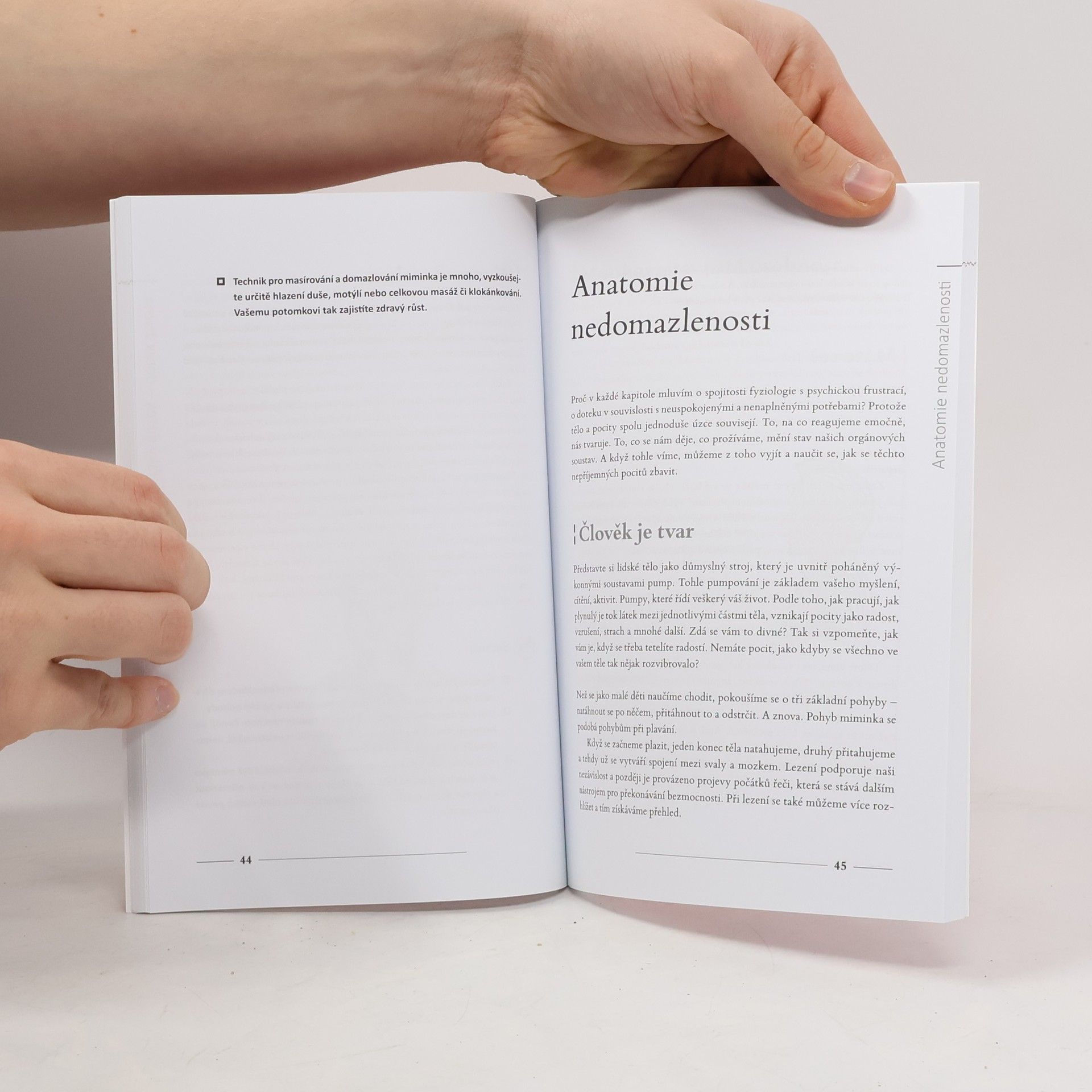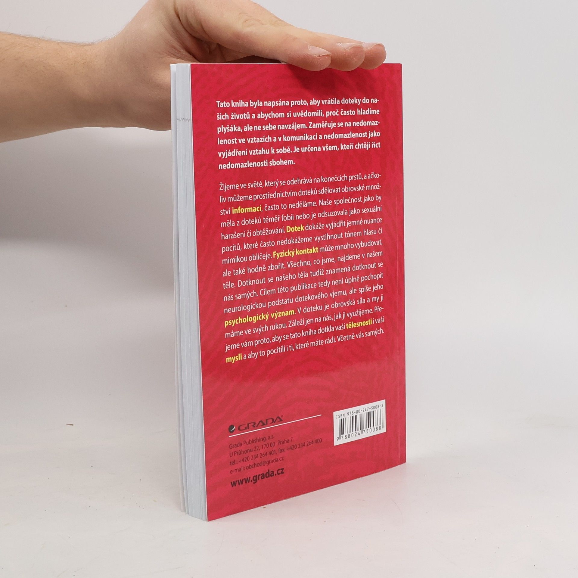 Tato kniha byla napsána proto, aby vrátila doteky do našich životů a abychom si uvědomili, proč často hladíme plyšáka, ale ne sebe navzájem. Zaměřuje se na nedomazlenost ve vztazích a v komunikaci a nedomazlenost jako vyjádření vztahu k sobě. Je určena všem, kteří chtějí říct nedomazlenosti sbohem. Žijeme ve světě, který se odehrává na konečcích prstů, a ačkoliv můžeme prostřednictvím doteků sdělovat obrovské množství informací, často to neděláme. Naše společnost jako by měla z doteků téměř fobii nebo je odsuzovala jako sexuální harašení či obtěžování. Dotek dokáže vyjádřit jemné nuance pocitů, které často nedokážeme vystihnout tónem hlasu či mimikou obličeje. Fyzický kontakt může mnoho vybudovat, ale také hodně zbořit. Všechno, co jsme, najdeme v našem těle. Dotknout se našeho těla tudíž znamená dotknout se nás samých. Cílem této publikace tedy není úplně pochopit neurologickou podstatu dotekového vjemu, ale spíše jeho psychologický význam. V doteku je obrovská síla a my ji máme ve svých rukou. Záleží jen na nás, jak ji využijeme. Přejeme vám proto, aby se tato kniha dotkla vaší tělesnosti i vaší mysli a aby to pocítíli i ti, které máte rádi. Včetně vás samých.