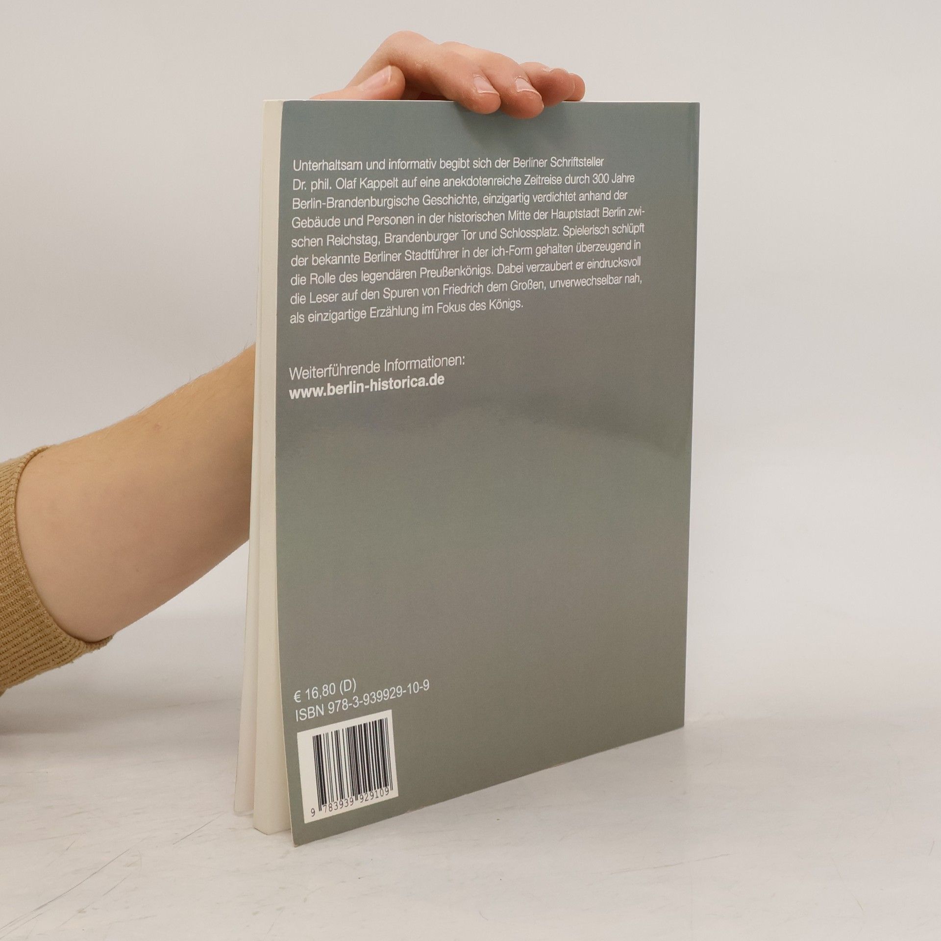 Unterhaltsam und informativ begibt sich der Berliner Schriftsteller Dr. phil. Olaf Kappelt auf einen anekdotenreiche Zeitreise durch 300 Jahre Berlin-Brandenburgische Geschichte, einzigartig verdichtet anhand der Gebäude und Personen in der historischen Mitte der Hauptstadt Berlin zwischen Reichstag, Brandenburger Tor und Schloßplatz. Spielerisch schlüpft der bekannte Berliner Stadtführer in der ich-Form gehalten überzeugend in die Rolle des legendären Preußenkönigs. Dabei verzaubert er eindrucksvoll die Leser auf den Spuren von Friedrich dem Großen, unverwechselbar nah, als einzigartige Erzählung im Fokus des Königs.