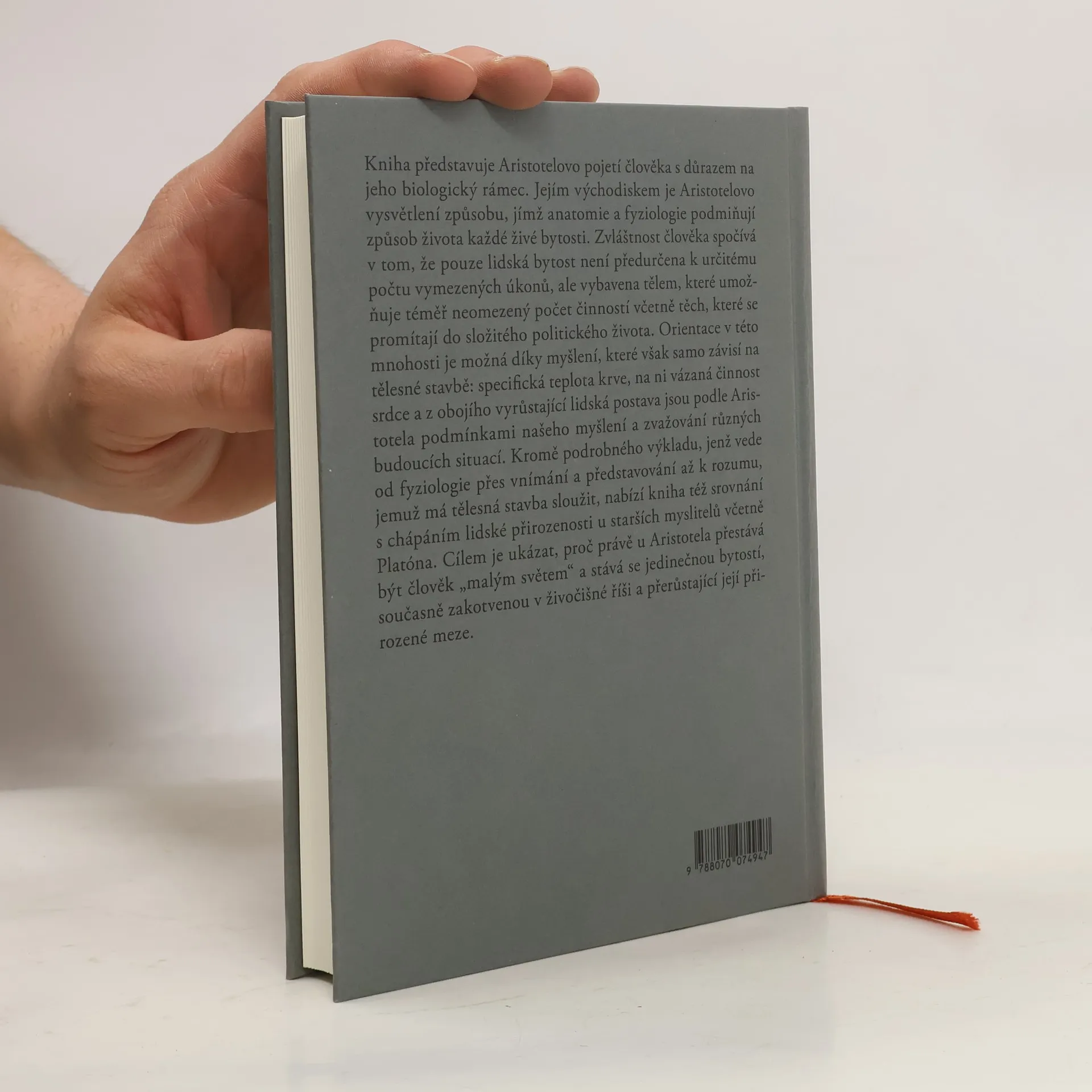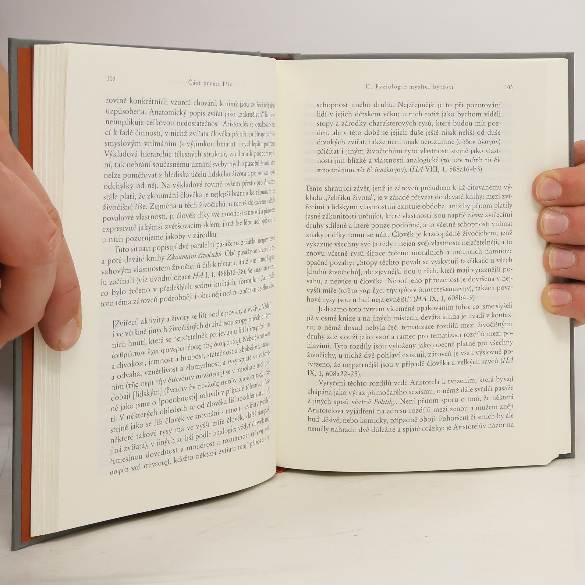 Kniha představuje Aristotelovo pojetí člověka jako výraz přesvědčení, že určující podobou skutečnosti jsou konkrétní živé bytosti. Rozdíly mezi těmito bytostmi jsou dány různými druhy činností, které jsou té či oné živé bytosti vlastní a které se promítají přímo do její tělesné stavby. Lidská anatomie je z tohoto hlediska výrazem schopnosti myslet i možností tuto schopnost realizovat. Aristotelův výklad lidské existence má proto dvě neoddělitelné stránky: tematizaci účelu tělesných částí a výklad jejich látkové konstituce. Kniha se věnuje oběma těmto stránkám v pěti kapitolách, v nichž směřuje od tvaru a funkce lidské postavy přes vnímání a představování až k problému myšlení, které samo tělesný půdorys nemá. Zvláštní postavení člověka současně ve středu a na okraji fyzikálního světa dokládá též na vlivném motivu sepětí mezi melancholií a géniem.