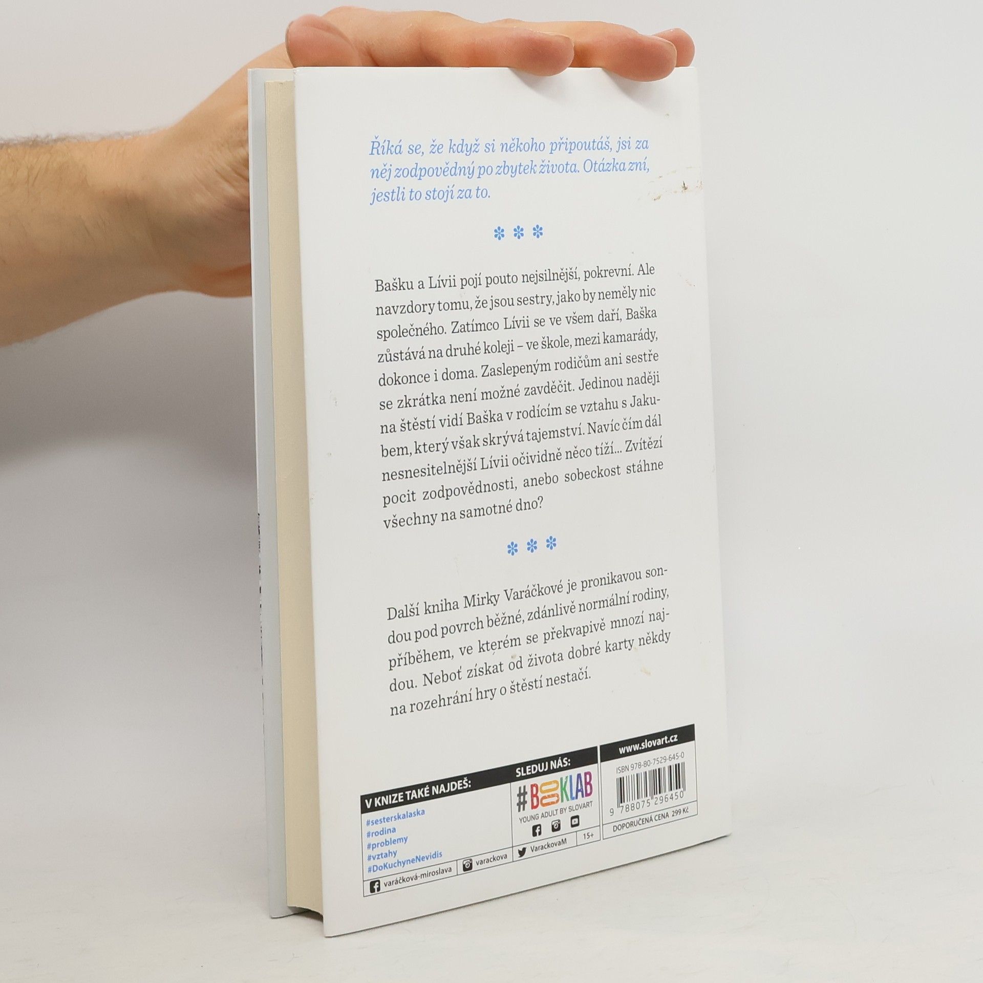 Říká se, že když si někoho připoutáš, jsi za něj zodpovědný po zbytek života. Otázka zní, jestli to stojí za to. Bašku a Lívii pojí pouto nejsilnější, pokrevní. Ale navzdory tomu, že jsou sestry, jako by neměly nic společného. Zatímco Lívii se ve všem daří, Baška zůstává na druhé koleji - ve škole, mezi kamarády, dokonce i doma. Zaslepeným rodičům ani sestře se zkrátka není možné zavděčit. Jedinou naději na štěstí vidí Baša v rodícím se vztahu s Jakubem, který však skrývá tajemství. Navíc, čím dál víc nesnesitelnější Lívii něco očividně tíží… Zvítězí pocit zodpovědnosti anebo sobeckost stáhne všechny na samotné dno? Další kniha Mirky Varáčkové je pronikavou sondou pod povrch běžné, zdánlivě normální rodiny, příběhem, ve kterém se překvapivě mnozí najdou. Neboť získat od života dobré karty někdy na rozehrání hry o štěstí nestačí.