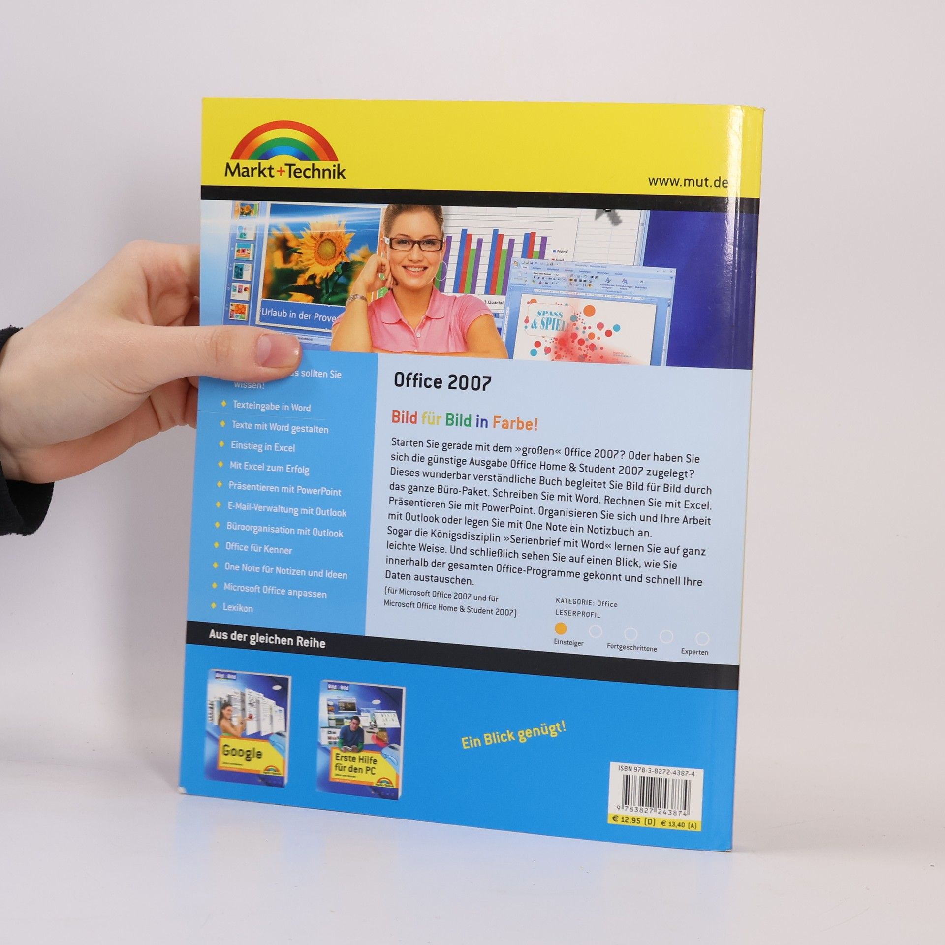 Die ganze Bürosoftware Office 2007 in Bildern. Leicht zu lernen, leicht nachzuschlagen: Word, Excel, Powerpoint und Outlook. Leser, die überhaupt das erste Mal am PC schreiben und rechnen wollen sind hier goldrichtig. Auch alle Umsteiger von Office 2003. Einfach das Buch neben den PC legen, immer wieder reinschauen und das Büro funktioniert wie von selbst.