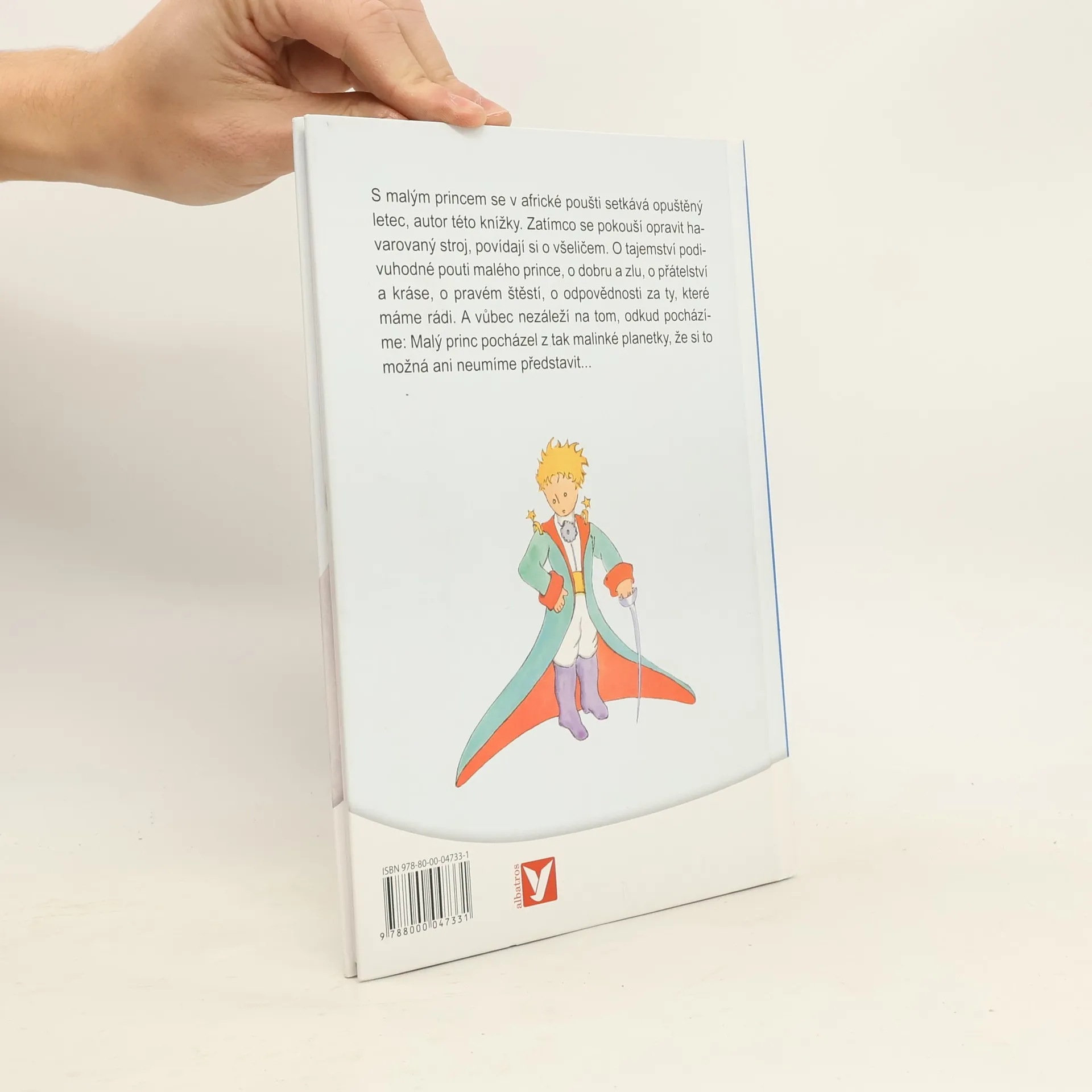 S Malým princem se v africké poušti setkává opuštěný letec, autor této knížky. Zatímco se pokouší opravit havarovaný stroj, povídají si o všeličem. O tajemství podivuhodné pouti Malého prince, o dobru a zlu, o přátelství a kráse, o pravém štěstí, o odpovědnosti za ty, které máme rádi. A vůbec nezáleží na tom, odkud pocházíme: Malý princ pocházel z tak malinké planetky, že si to možná ani neumíme představit...