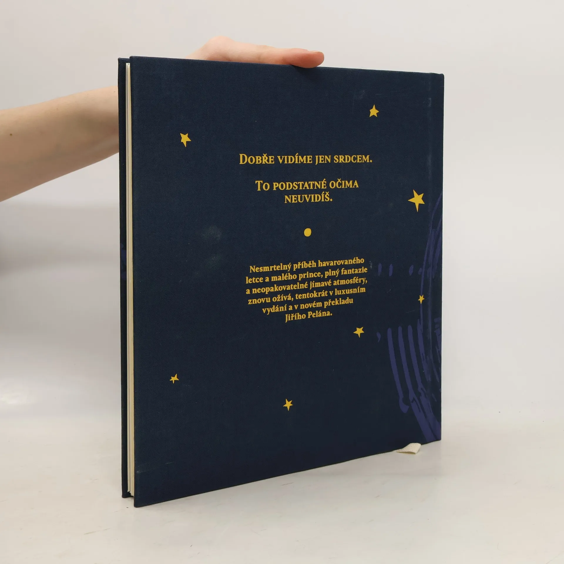 Nesmrtelný příběh havarovaného letce a malého prince, plný fantazie a neopakovatelné, jímavé atmosféry, znovu ožívá, tentokrát v luxusním vydání a v novém překladu Jiřího Pelána. Kniha obsahuje také dárkovou kartičku pro štěstí. Je určena čtenářům od 7 let.