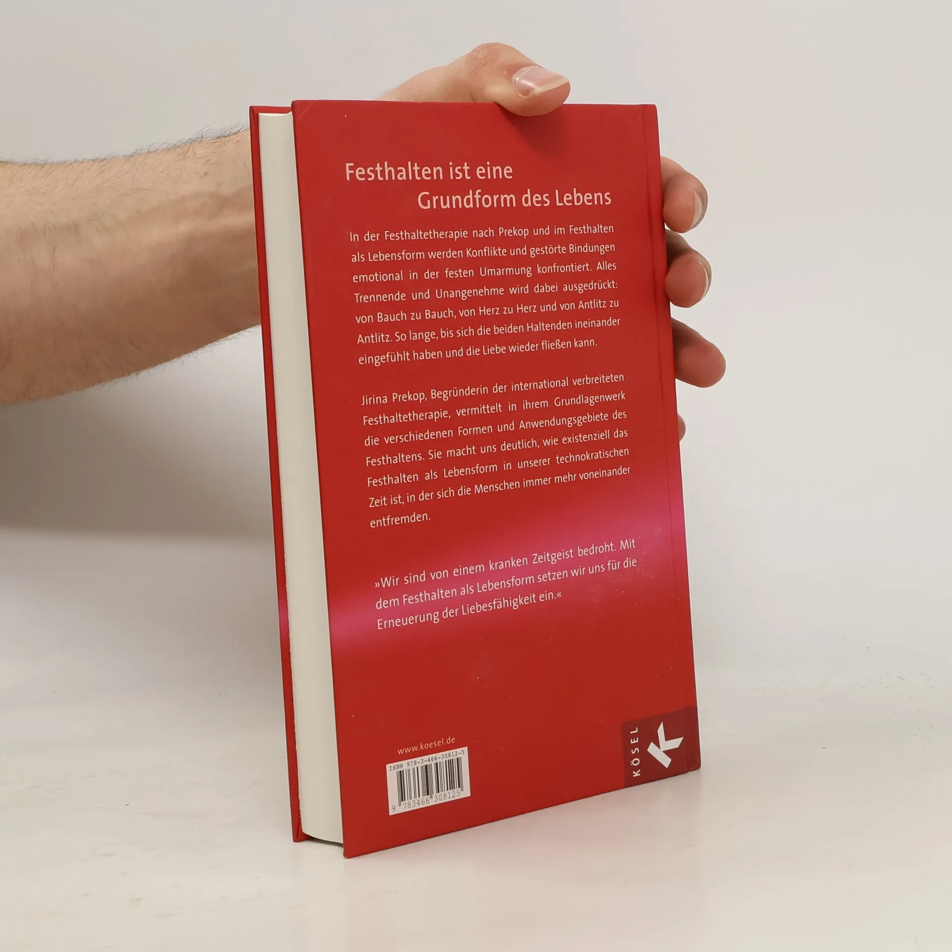 Jirina Prekops Lebenswerk: Ihr Engagement für die Erneuerung der LiebeDie Festhaltetherapie ist eine Form der Psychotherapie, mit der durch intensives Festhalten Bindungsstörungen aufgelöst werden können. In fester Umarmung darf alles Trennende und Unangenehme ausgedrückt werden. Der emotionale Prozess dauert solange, bis aller Schmerz, alle Wut und alle Angst geäußert sind und die Liebe wieder fließen kann. Das Grundlagenwerk zur Festhaltetherapie richtet sich an Therapeuten und alle, die sich Hilfe bei Beziehungsschwierigkeiten wünschen.