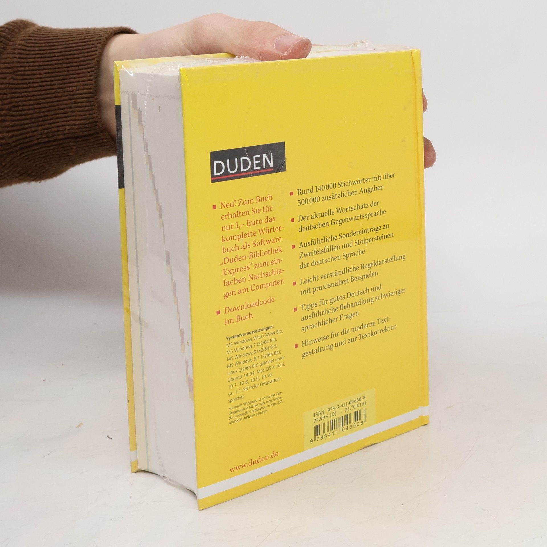 Mit seinen 5.000 neuen Wörtern bietet der "Duden - Die deutsche Rechtschreibung" nun 140.000 Stichwörter mit über 500.000 Bedeutungserklärungen und zusätzlichen Angaben zu Worttrennung, Aussprache, Grammatik, Etymologie und Stil. Die Regeln sind leicht verständlich dargestellt und mit praxisnahen Beispielen versehen. Darüber hinaus finden sich ausführliche Sondereinträge zu Zweifelsfällen und Stolperfallen der deutschen Sprache, Tipps für gutes Deutsch sowie Hinweise zur modernen Textgestaltung. Neu: Buchkäufer erhalten den kompletten Wörterbuchinhalt zum Buch auch als Programm "Duden-Bibliothek Express" für das einfache Nachschlagen am Computer für nur 1,- Euro (Downloadcode im Buch). Zahlreiche Suchfunktionen erleichtern die Recherche direkt beim Schreiben. Die Software ist kombinierbar mit allen anderen elektronischen Wörterbüchern aus der Software-Reihe "Duden-Bibliothek". Systemvoraussetzungen: MS Windows Vista (32/64 Bit), MS Windows 7 (32/64 Bit), MS Windows 8 (32/64 Bit), MS Windows 8.1 (32/64 Bit); Linux (32/64 Bit) getestet unter Ubuntu 14.04; Mac OS X 10.6, 10.7, 10.8, 10.9, 10.10; ca. 1,1 GB freier Festplattenspeicher.