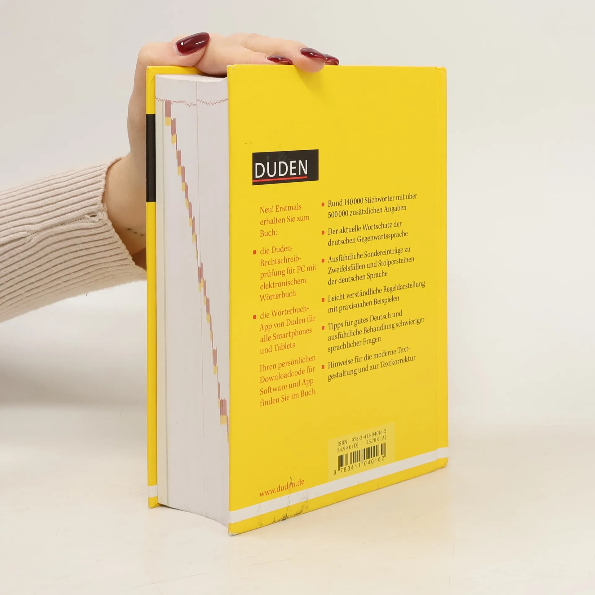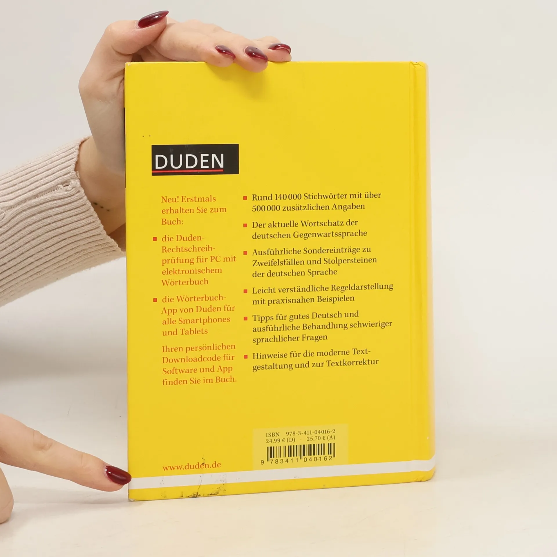 Die neue, 26. Auflage des umfassenden Standardwerks zur deutschen Rechtschreibung bietet nicht nur das gedruckte Buch, sondern auch die Rechtschreibsoftware für MS Office unter Windows sowie eine Wörterbuch-App für Smartphones und Tablets mit iOS oder Android. Mit 5.000 neuen Wörtern umfasst das Werk nun 140.000 Stichwörter und über 500.000 Bedeutungserklärungen, ergänzt durch Informationen zu Worttrennung, Aussprache, Grammatik, Etymologie und Stil. Die Regeln sind klar und praxisnah erklärt, unterstützt durch Beispiele. Zudem gibt es ausführliche Sondereinträge zu Zweifelsfällen, Tipps für gutes Deutsch und Hinweise zur modernen Textgestaltung. Die Wörterbuch-App ist kompatibel mit iPhone, iPod touch und iPad (iOS-Version ab 5.1) sowie Android (Version ab 2.2). Die Rechtschreibsoftware funktioniert auf verschiedenen Windows-Betriebssystemen, darunter Windows XP, Vista, 7 und 8, und unterstützt MS Office-Anwendungen ab bestimmten Versionen. Microsoft Windows und Microsoft Office sind eingetragene Marken der Microsoft Corporation in den USA und/oder anderen Ländern.