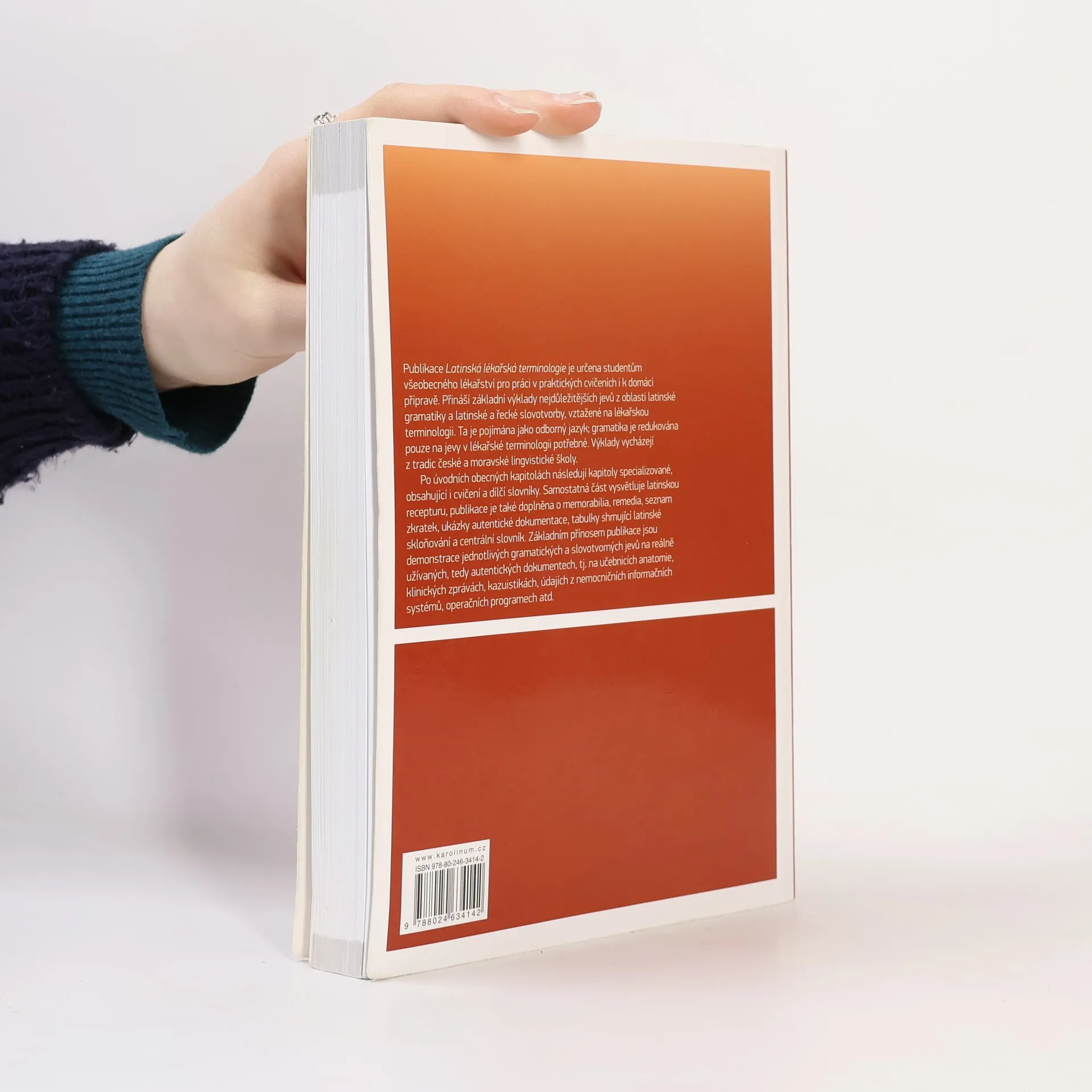 Publikace je určena studentům všeobecného lékařství pro práci v praktických cvičeních i pro domácí přípravu. Cílem je seznámit uživatele se základy gramatických a lexikálních jevů potřebných jak pro obory teoretické a preklinické, tak pro samotné obory klinické – jde zvláště o gramatiku latinských substantiv a adjektiv, výklad základních jevů latinské a řecké slovotvorby či uvedení do latinské receptury. Zvláště v tomto posledně jmenovaném oboru může najít užitečné informace i poučená veřejnost. Nedílnou součástí jsou úvodní výklady popisující výslovnost, gramatické kategorie a základní strukturu latinských lékařských termínů. Všechny gramatické a lexikální jevy jsou doloženy vhodnými příklady z reálně užívaných, tedy autentických dokumentů, tj. z učebnic anatomie, nemocničního informačního systému, z klinických zpráv a zápisů kazuistik. Knihu doplňuje nezbytný centrální slovník latinských medicínských pojmů.