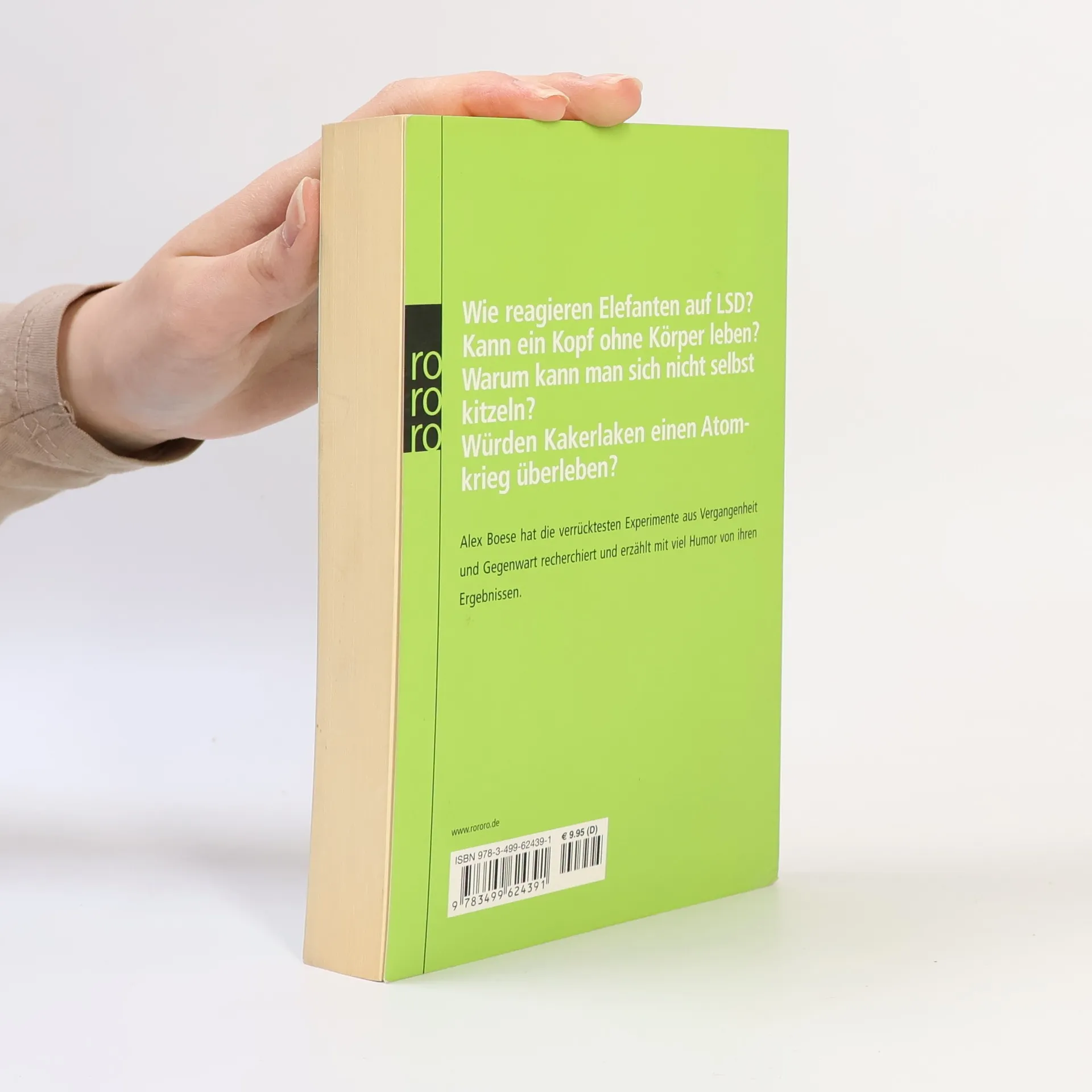 Wie reagieren Elefanten auf LSD? Kann ein Kopf ohne Körper leben? Warum kann man sich nicht selbst kitzeln? Würden Kakerlaken einen Atomkrieg überleben? Alex Boese hat die verrücktesten Experimente aus Vergangenheit und Gegenwart recherchiert und erzählt mit viel Humor von ihren Ergebnissen.