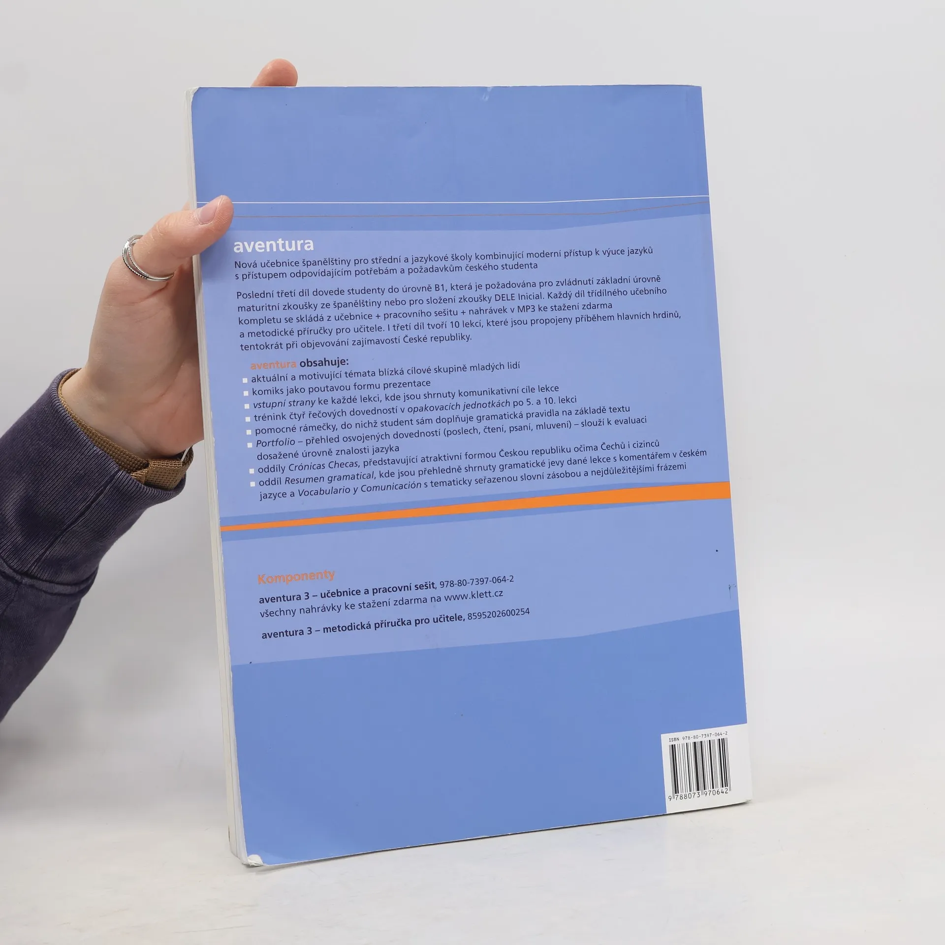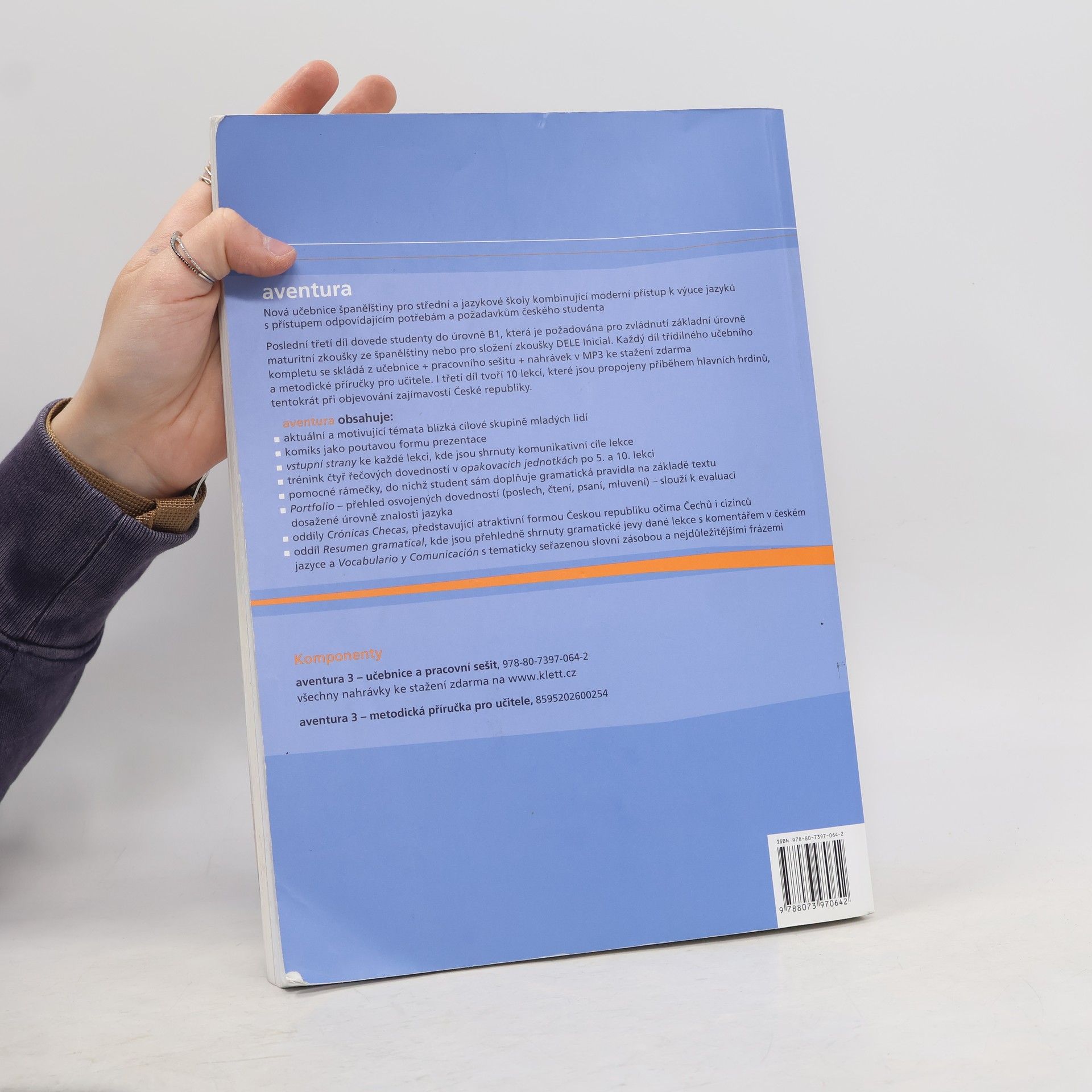 Nová učebnice španělštiny Aventura 3 je určená pro střední a jazykové školy kombinující moderní přístup k výuce jazyků s přístupem odpovídajícím potřebám a požadavkům českého studenta. Poslední, třetí díl dovede studenty do úrovně B1, která je požadována pro zvládnutí základní úrovně maturitní zkoušky ze španělštiny nebo pro složení zkoušky DELE Inicial. I třetí díl tvoří 10 lekcí, které jsou propojeny příběhem hlavních hrdinů, tentokrát při objevování zajímavostí České republiky.