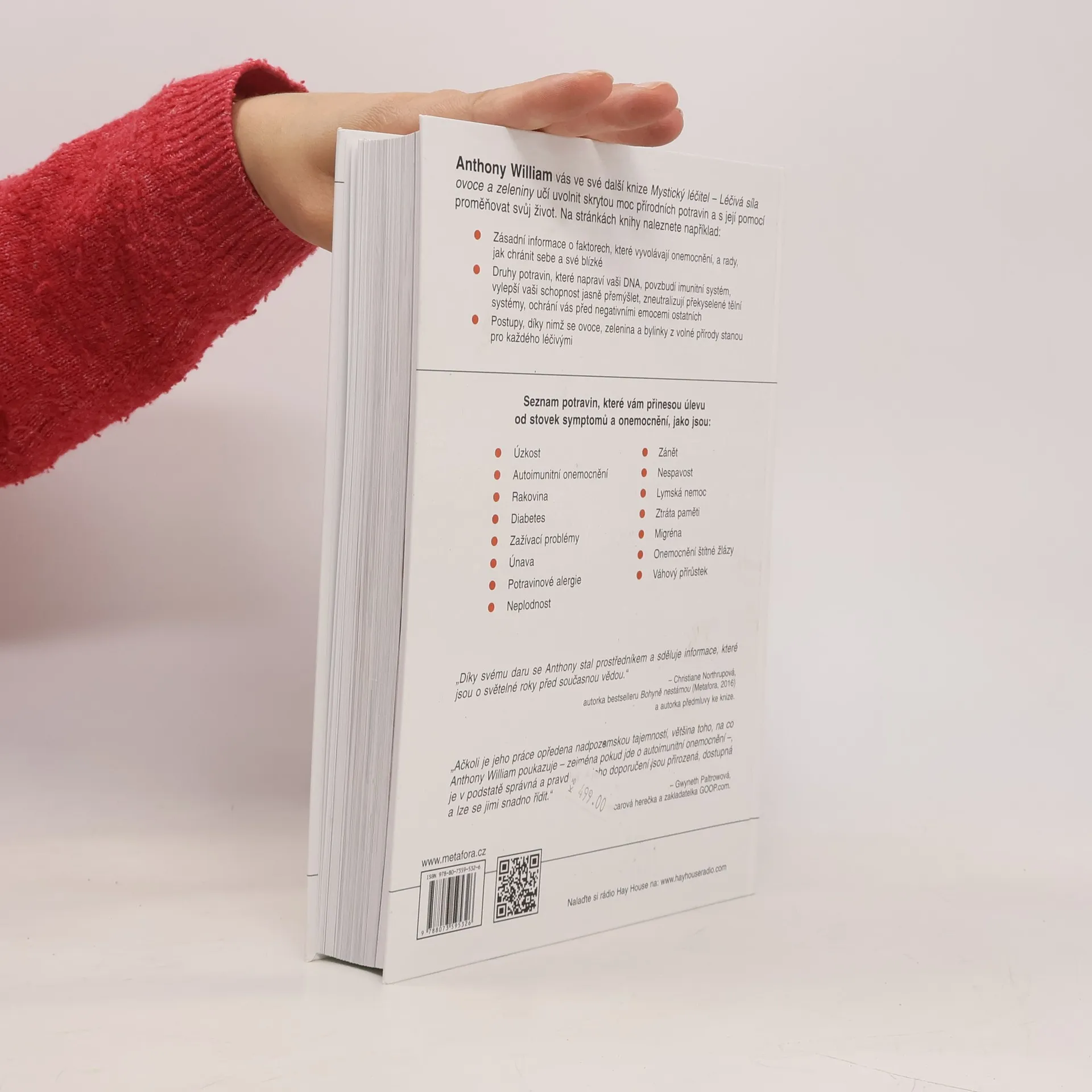 ANTHONY WILLIAM coby Mystický léčitel pomohl tisícům lidí uzdravit se z nemocí, které byly buď chybně diagnostikovány, neúčinně léčeny nebo považovány za nevyléčitelné. Božský hlas mu přímo sděluje, co je pravou příčinou bolesti či nemoci konkrétního člověka a co pro své uzdravení každý může udělat. Léčivá síla ovoce a zeleniny pojednává naprosto nově o léčivém potenciálu více než 50 druhů ovoce, zeleniny a bylinek z volné přírody. Díky informacím, které jinde nenajdete, porozumíte vlastnímu zdraví a ochráníte tak sebe a své blízké před utrpením a nemocemi. Odkryjte skrytou sílu ovoce a zeleniny a proměňte svůj život. OBJEVÍTE: •Proč jsou borůvky ovocem vzkříšení, chřest zřídlem mládí a citrony vás pozvednou, kdykoli se dozvíte něco špatného •Nejlepší potraviny pro úlevu od žlučových kamenů, hypertenze, psychické otupělosti, onemocnění štítné žlázy, migrény a stovek dalších symptomů a nemocí •Konkrétní léčivou sílu kiwi, okurek, manga, ředkviček a mnoha dalších •Nahlédnete do mechanismu nezvladatelných chutí, pochopíte, jak využít stres ve váš prospěch a jak klíčovou roli hraje ovoce v otázce plodnosti Většina informací v knize se dramaticky liší od názorů konvenční medicíny, takže neočekávejte stále stejně omílaná doporučení. Připravte se na nový pohled na potraviny jako na účinné nástroje, které vás uzdraví a přinesou vám pohodu i dobrou kondici.