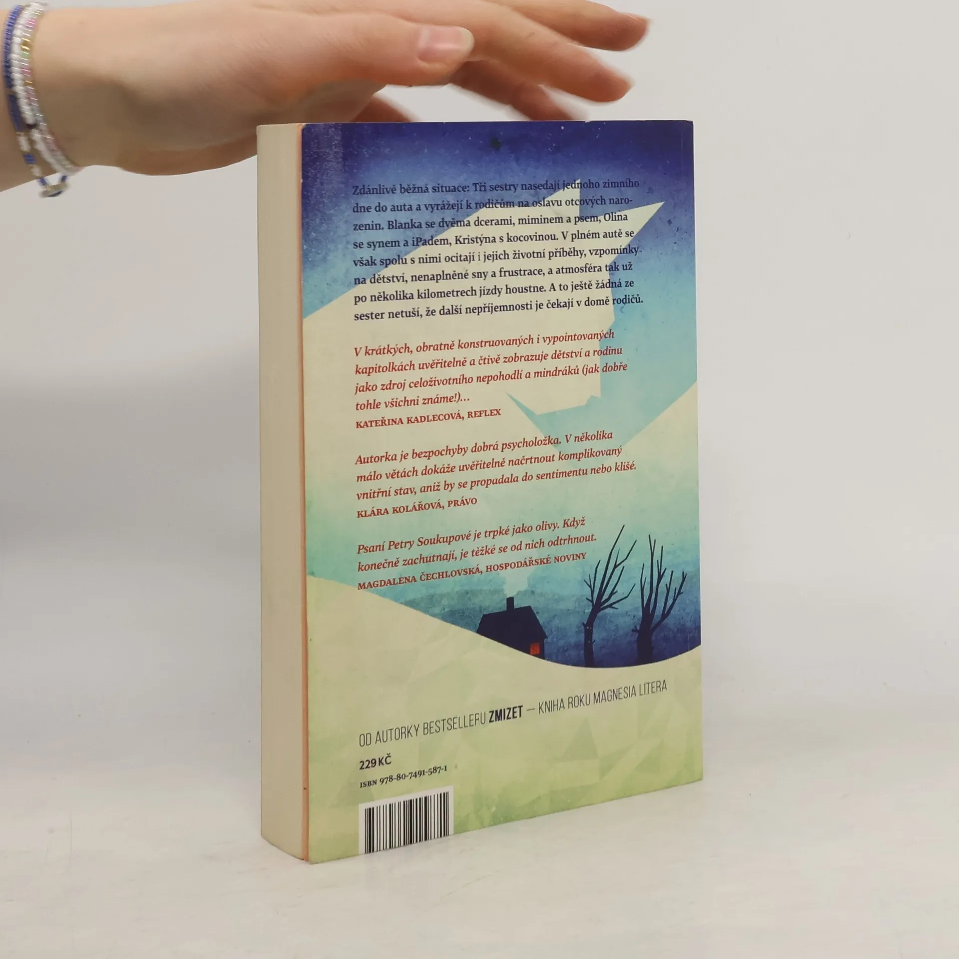 Zdánlivě běžná situace: Tři sestry nasedají jednoho zimního dne do auta a vyrážejí k rodičům na oslavu narozenin svého otce. Blanka se dvěma dcerami, miminem a psem, Olina se synem a tabletem, Kristýna s kocovinou. V jednom autě se však spolu s nimi ocitají i jejich životní příběhy, vzpomínky na dětství, nenaplněné sny a frustrace a sedmimístné Volvo XC se tak už po několika kilometrech jízdy mění v napěchovaný papiňák, který každou chvíli hrozí výbuchem. A to ještě žádná ze sester netuší, že další drama je čeká v domě rodičů. V rodinných vztazích a na první pohled obyčejných událostech dokáže Soukupová zachytit otisky spletitých osudů, dávných zážitků a frustrací s takovou bravurou, že před čtenářem vyvstávají jako jedinečná životní dramata. Autorčin typický způsob vyprávění s předstíranou ledabylostí a neokázale podtrhuje autenticitu příběhu a vtahuje do něj čtenáře natolik, že se sám stává jedním z pasažérů auta jedoucího na rodinnou oslavu.