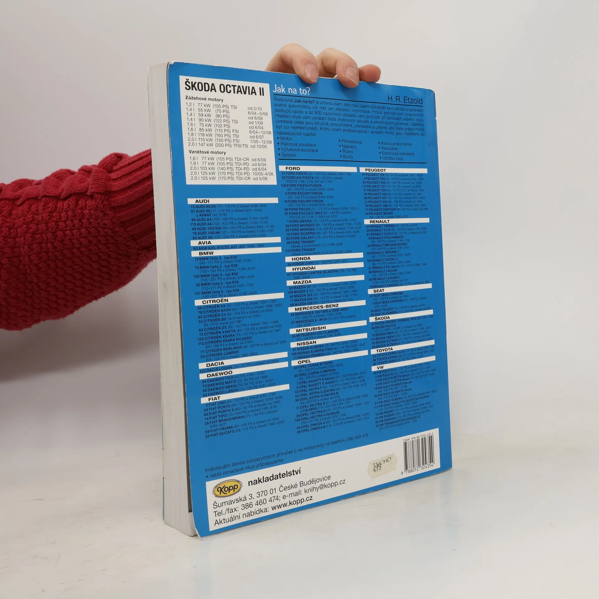 Kniha, vydaná v roce 2012, je součástí série automobilových příruček "Jak na to?" a zaměřuje se na údržbu a opravy automobilů Škoda Octavia II. Je určena jak profesionálům, tak amatérům a obsahuje přibližně 800 obrázků, 50 tabulek a více než 30 elektrických schémat, což ji činí podstatně rozsáhlejší než první vydání. Příručka je rozdělena do několika kapitol, které pokrývají technická data motoru, údržbu vozidla, elektrickou instalaci, osvětlení, brzdy, řízení, klimatizaci a další důležité aspekty. Obsahuje také detailní popis motorů, včetně zážehových a vznětových variant, jako jsou motory 1,2 l TSI, 1,6 l FSI, 2,0 l TFSI a různé vznětové motory s výkony od 77 kW do 125 kW. Kniha se zaměřuje na specifické modely a poskytuje cenné informace pro údržbu a opravy, což ji činí užitečným zdrojem pro všechny majitele a nadšence automobilů Škoda Octavia II.