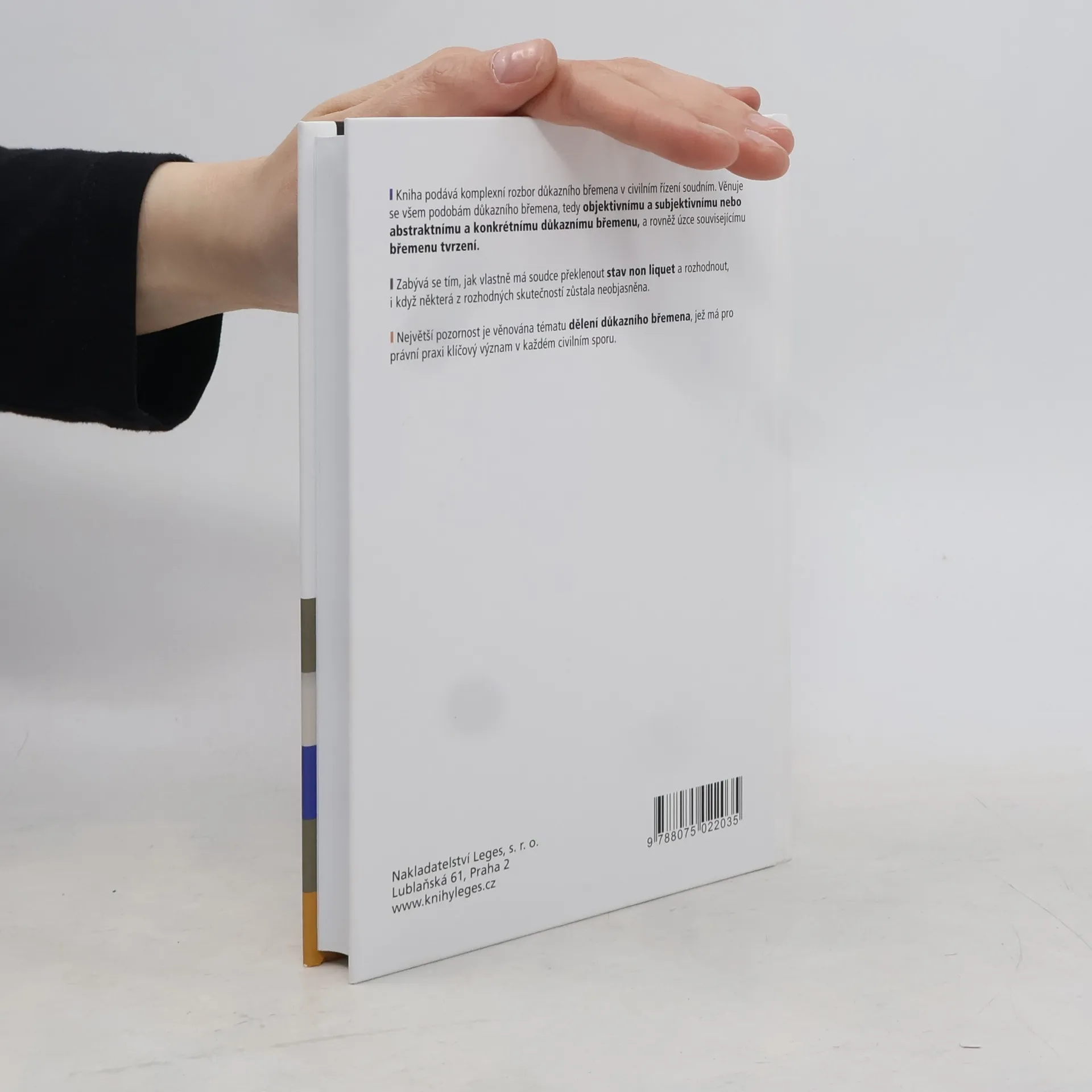 Kniha podává komplexní rozbor důkazního břemena v civilním řízení soudním. Věnuje se všem podobám důkazního břemena, tedy objektivnímu a subjektivnímu nebo abstraktnímu a konkrétnímu důkaznímu břemenu, a rovněž úzce souvisejícímu břemenu tvrzení. Zabývá se tím, jak vlastně má soudce překlenout stav non liquet a rozhodnout, i když některá z rozhodných skutečností zůstala neobjasněna. Největší pozornost je věnována tématu dělení důkazního břemena, jež má pro právní praxi klíčový význam v každém civilním sporu.