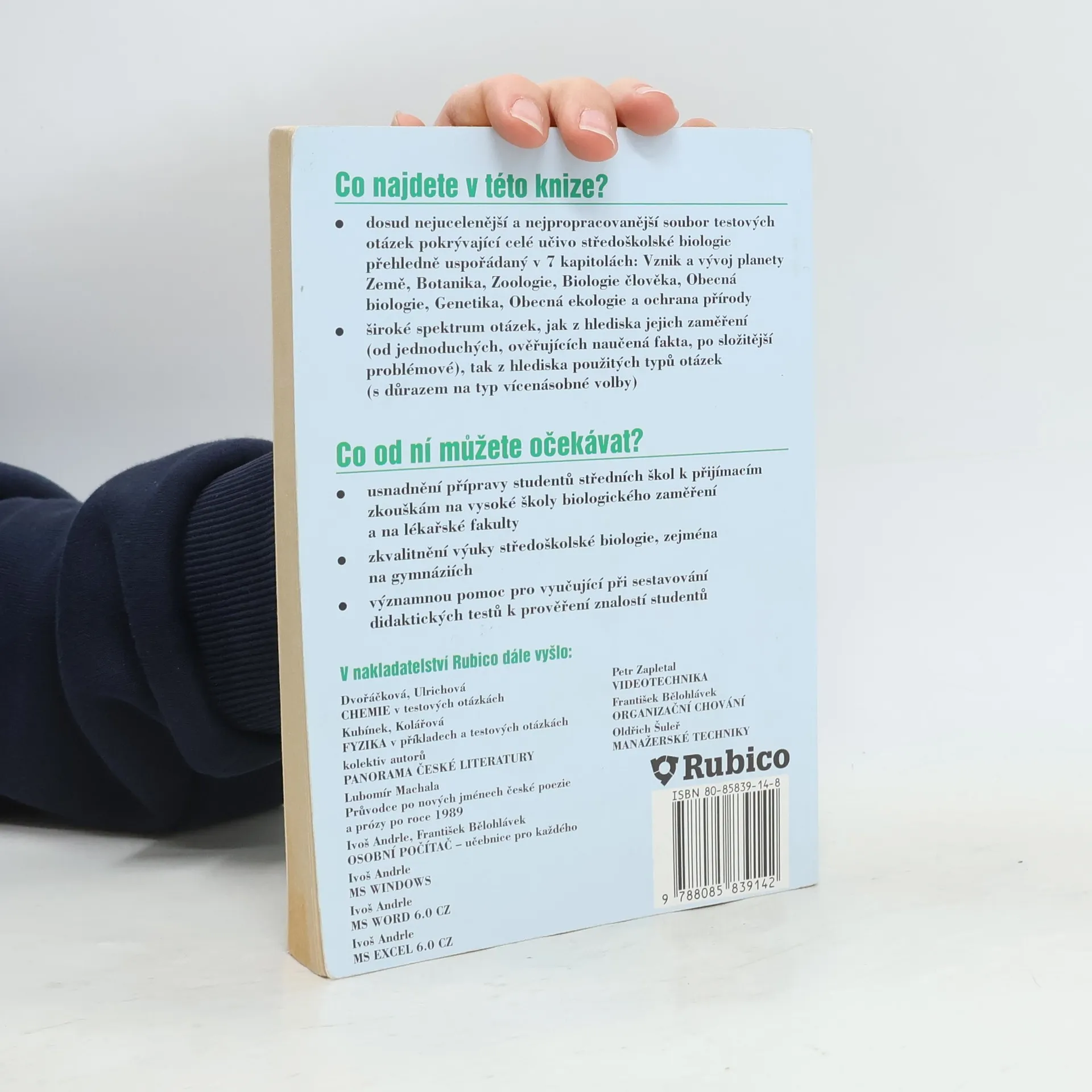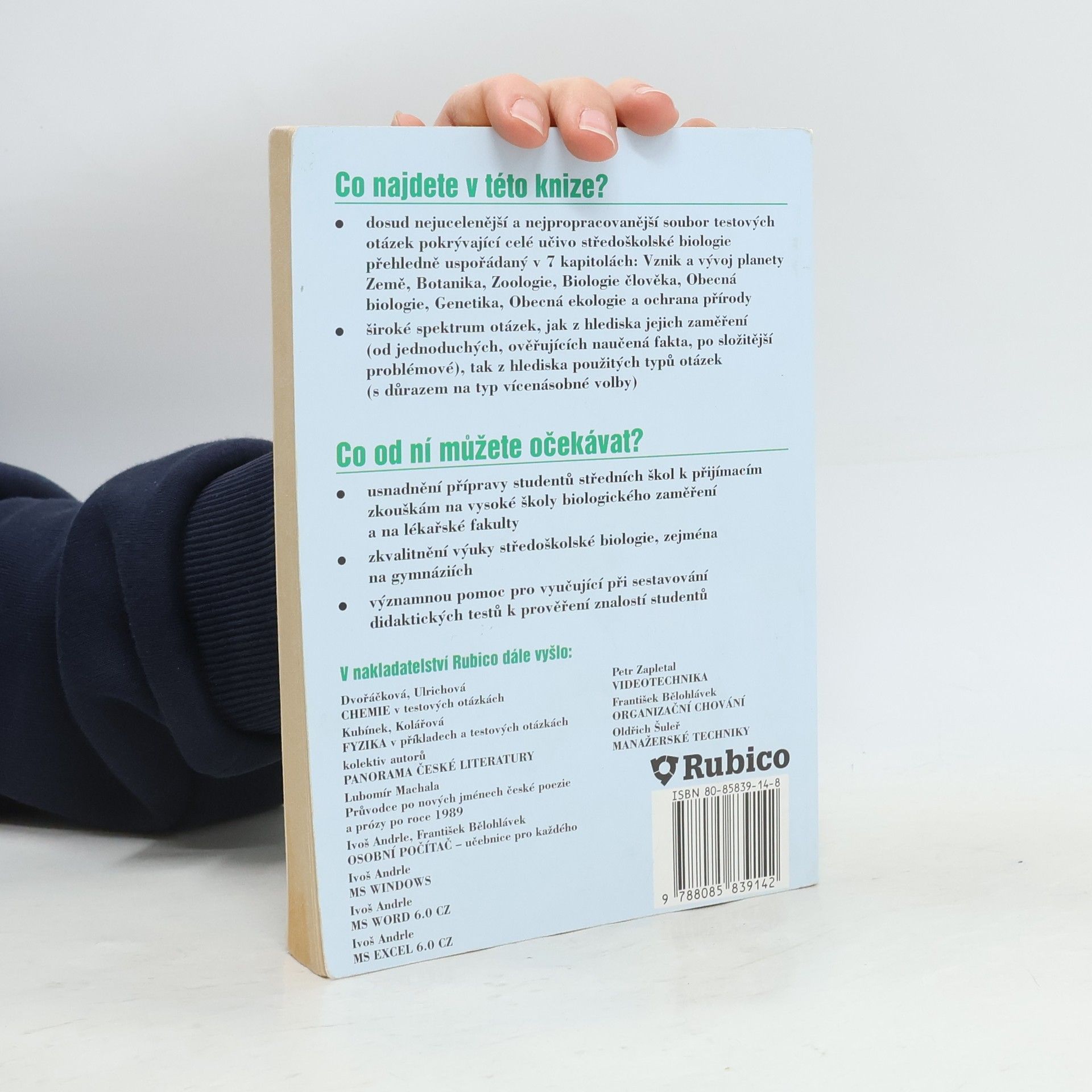 V této knize najdete dosud nejucelenější a nejpropracovanější soubor testových otázek pokrývající celé učivo středoškolské biologie přehledně uspořádaný v 7 kapitolách: Vznik a vývoj planety Země, Botanika, Zoologie, Biologie člověka, Obecná biologie, Genetika, Obecná ekologie a ochrana přírody.