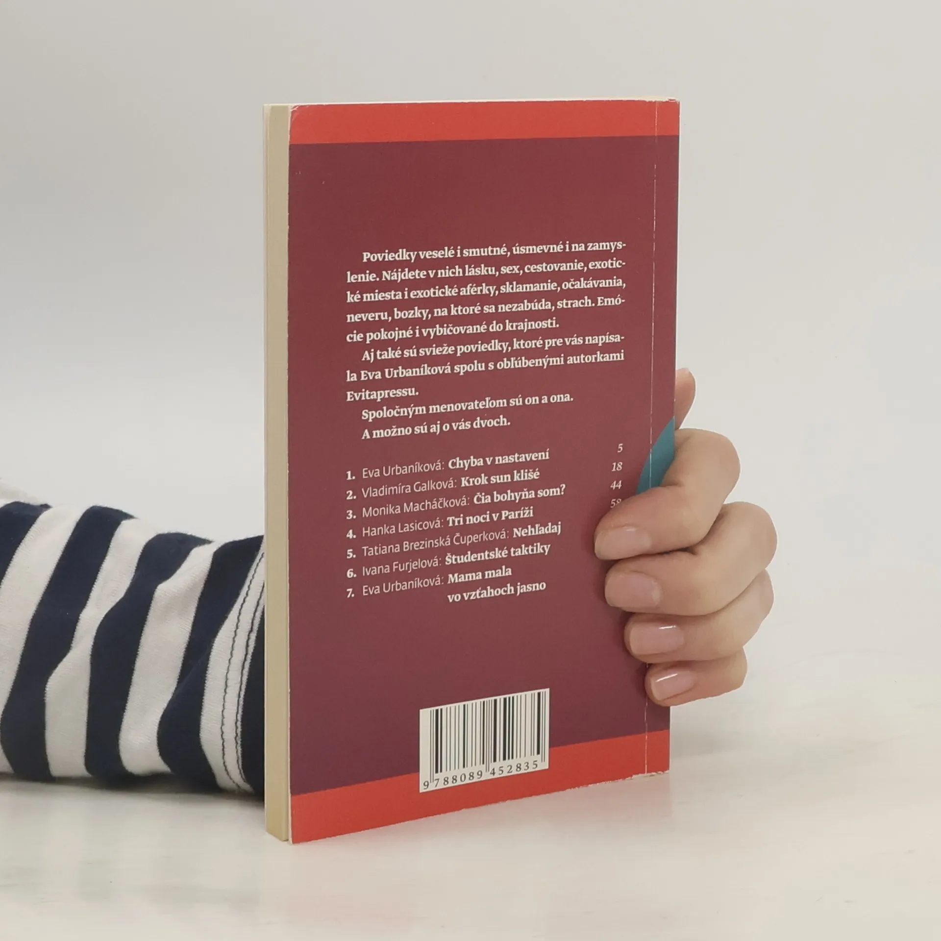 Poviedky veselé i smutné, úsmevné i na zamyslenie. Nájdete v nich lásku, sex, cestovanie, exotické miesta i exotické aférky, sklamanie, očakávania, neveru, bozky, na ktoré sa nezabúda, strach, Emócie pokojné i vybičované do krajnosti. Poviedky od autoriek: H. Lasicová, M. Macháčková, V. Galková, I. Furjelová, T.B. Čuperková.