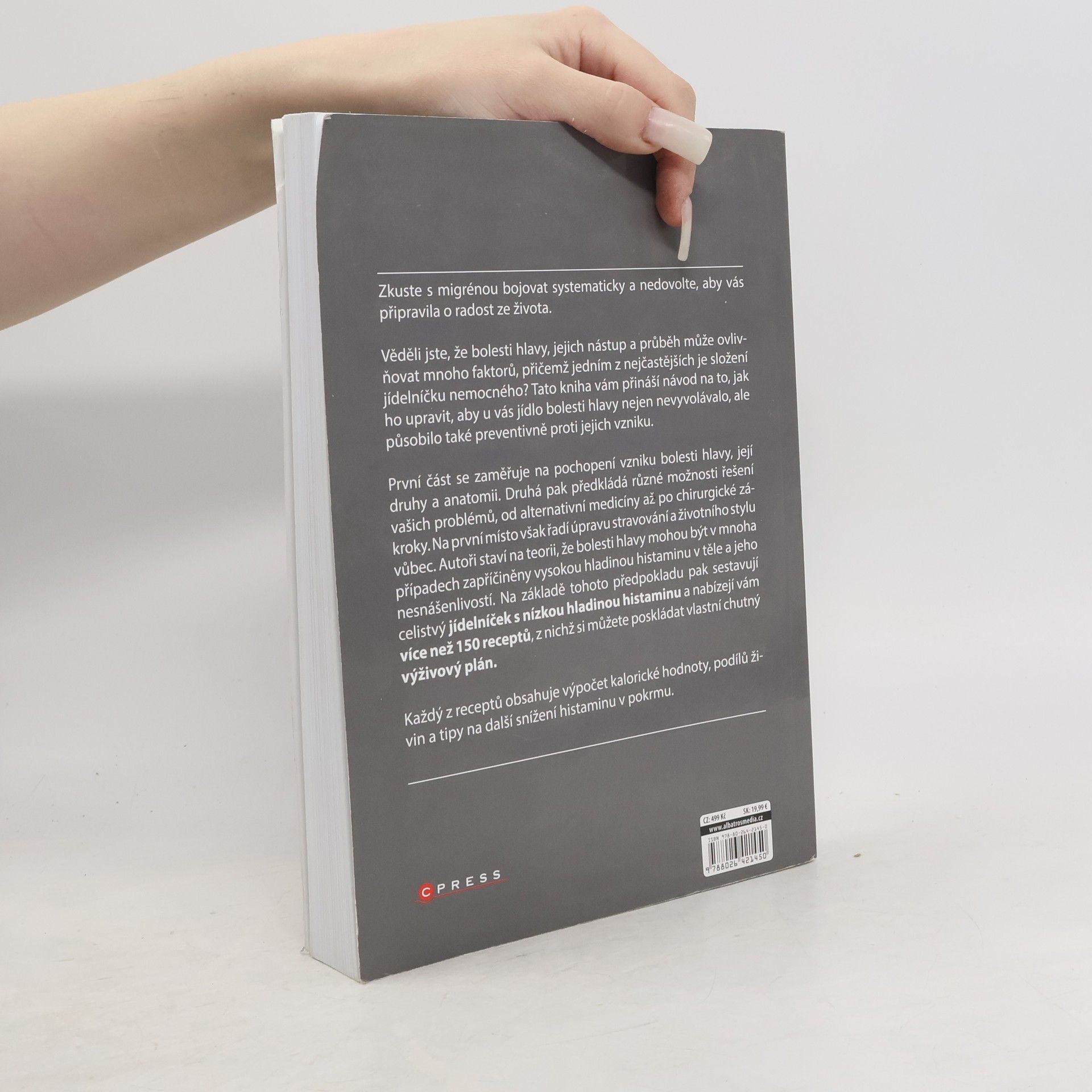 Zkuste s migrénou bojovat systematicky a nedovolte, aby vás připravila o radost ze života. Věděli jste, že bolesti hlavy, jejich nástup a průběh může ovlivňovat mnoho faktorů, přičemž jedním z nejčastějších je složení jídelníčku nemocného? Tato kniha vám přináší návod na to, jak ho upravit, aby u vás jídlo bolesti hlavy nejen nevyvolávalo, ale působilo také preventivně proti jejich vzniku. První část se zaměřuje na pochopení vzniku bolesti hlavy, její druhy anatomii. Druhá pak předkládá různé možnosti řešení vašich problémů, od alternativní medicíny až po chirurgické zákroky. Na první místo však staví úpravu stravování a životního stylu vůbec. Autoři staví na teorii, že bolesti hlavy mohou být v mnoha případech zapříčiněny vysokou hladinou histaminu v těle a jeho nesnášenlivostí. Na základě tohoto předpokladu pak sestavují celistvý jídelníček s nízkou hladinou histaminu a nabízejí vám více než 150 receptů, z nichž si můžete poskládat vlastní chutný výživový plán. Každý z receptů obsahuje výpočet kalorické hodnoty, podílů živin a tipy na další snížení histaminu v pokrmu.