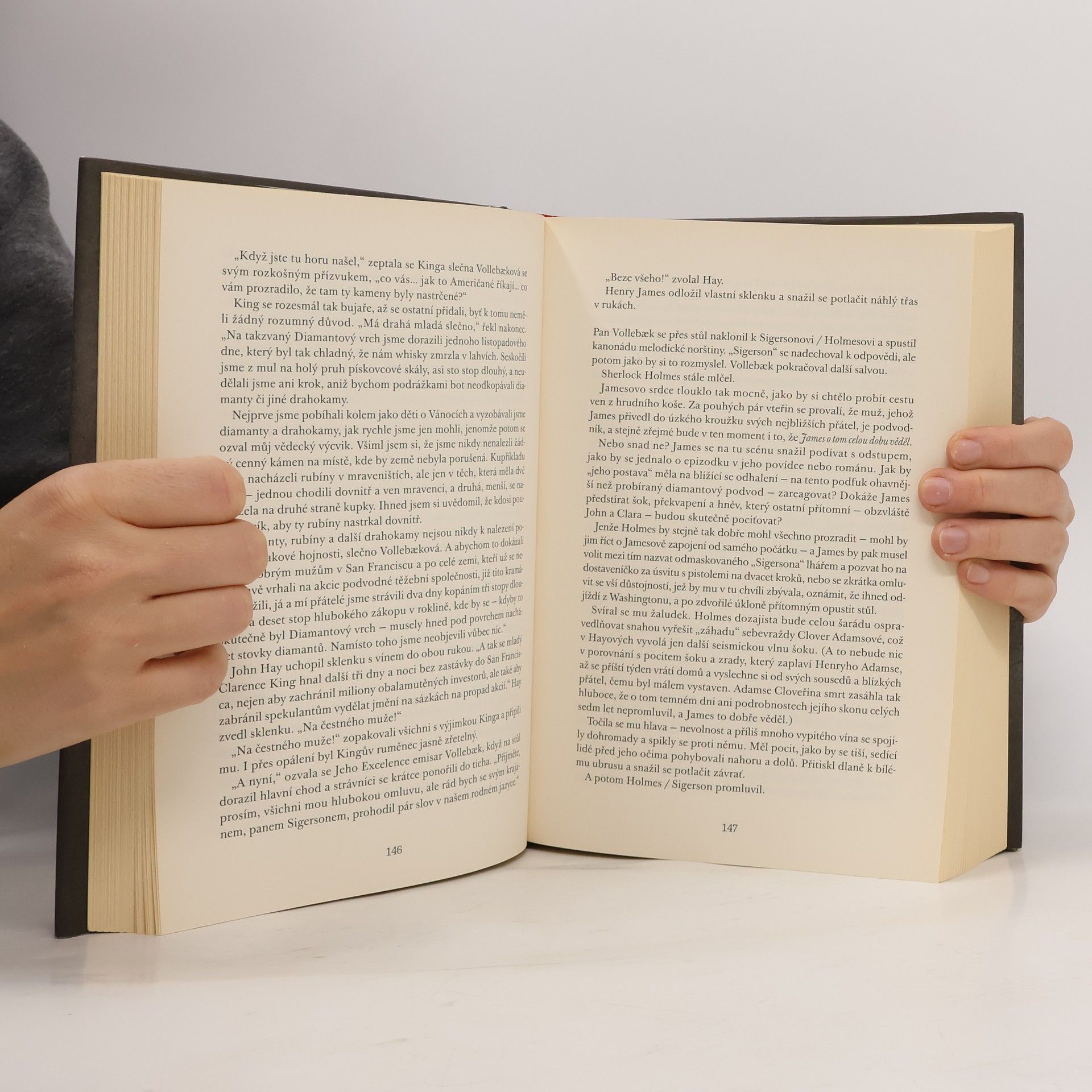 V roce 1893 se slavný detektiv Sherlock Holmes a spisovatel Henry James vydávají do Ameriky, aby rozluštili záhadu svázanou se sedm let starým úmrtím Clover Adamsové, manželky váženého historika Henryho Adamse (jehož rodina dala Spojeným státům dva prezidenty). Podle všeho se za údajnou Cloveřinou sebevraždou skrývá mnohem více, než by se na první pohled zdálo. A dokonce by se mohlo jednat o násilný čin související se záležitostmi státního významu. Tou dobou se Holmes právě nachází uprostřed tříletého období po událostech u Reichenbašských vodopádů, během něhož ho Londýňané považují za mrtvého. Holmes svou smrt předstíral, neboť pomocí vlastních dedukčních schopností dospěl k závěru, že je pouhou fiktivní postavou. Tohle zjištění pro Henryho Jamese představuje celou řadu dalších problémů: je-li jeho spoluvyšetřovatel pouhým dílem fikce, co to dělá z něj? A co si má mistrovský vypravěč počít se zlověstnou silou – nesoucí možná jméno Moriarty –, která je nejspíš ze stínů všechny ovládá?