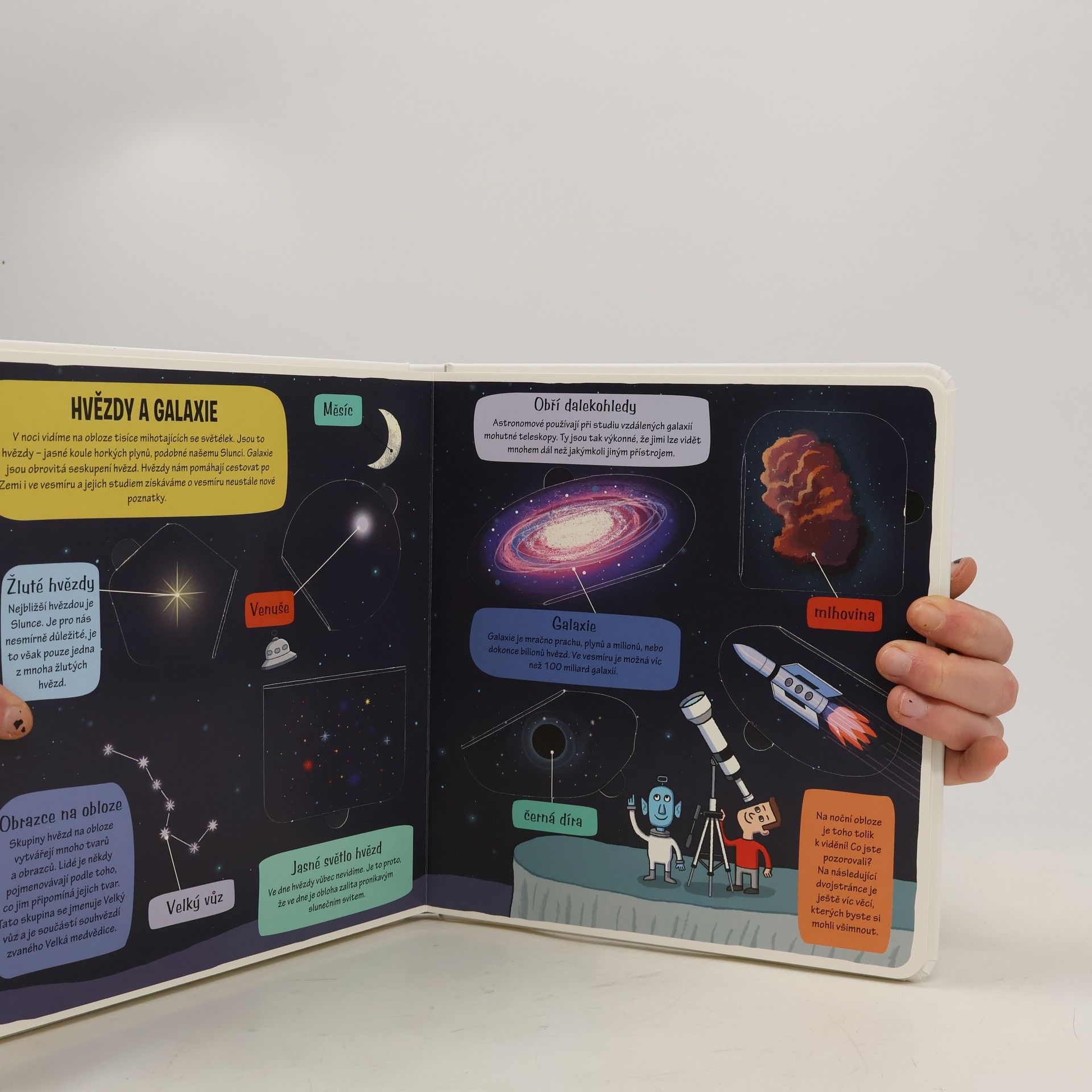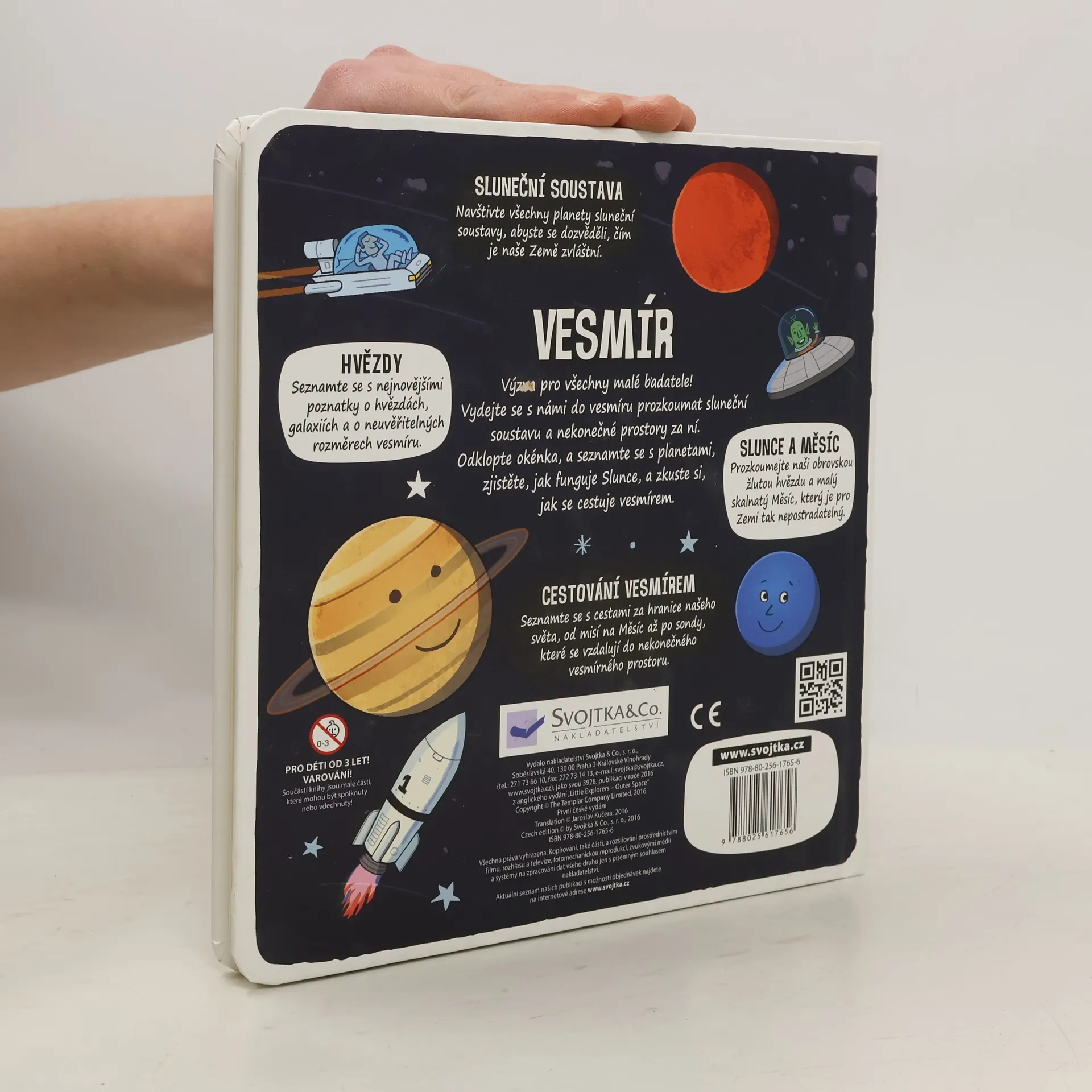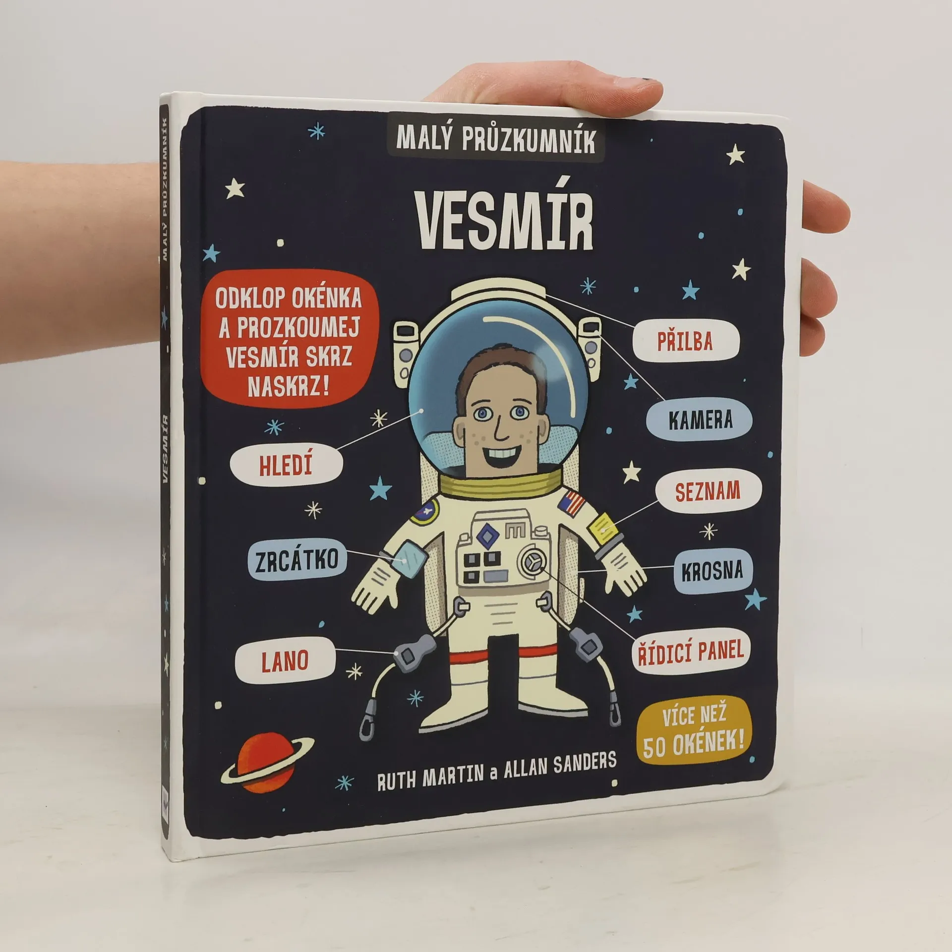 Zveme všechny malé průzkumníky k objevování – odklopte více než 50 okének a prozkoumejte vesmír skrz naskrz! Je toho přece spousta k objevování! Přilba skafandru, hledí, zrcátko, lano, kamera, seznam, krosna, řídicí panel... Zveme všechny malé průzkumníky k objevování! Vydejte se s námi do vesmíru prozkoumat sluneční soustavu a nekonečné prostory za ní. Odklopte více než 50 okének, nahlédněte dovnitř a prozkoumejte vesmír skrz naskrz. Seznamte se s planetami, zjistěte, jak funguje Slunce, a zkuste si, jak se cestuje vesmírem za hranice našeho světa. Přečtěte si něco o nejnovějších poznatcích o hvězdách, galaxiích a neuvěřitelných rozměrech vesmíru a navštivte všechny planety sluneční soustavy, abyste se dověděli, čím je zvláštní naše Země – je toho přece spousta k objevování!