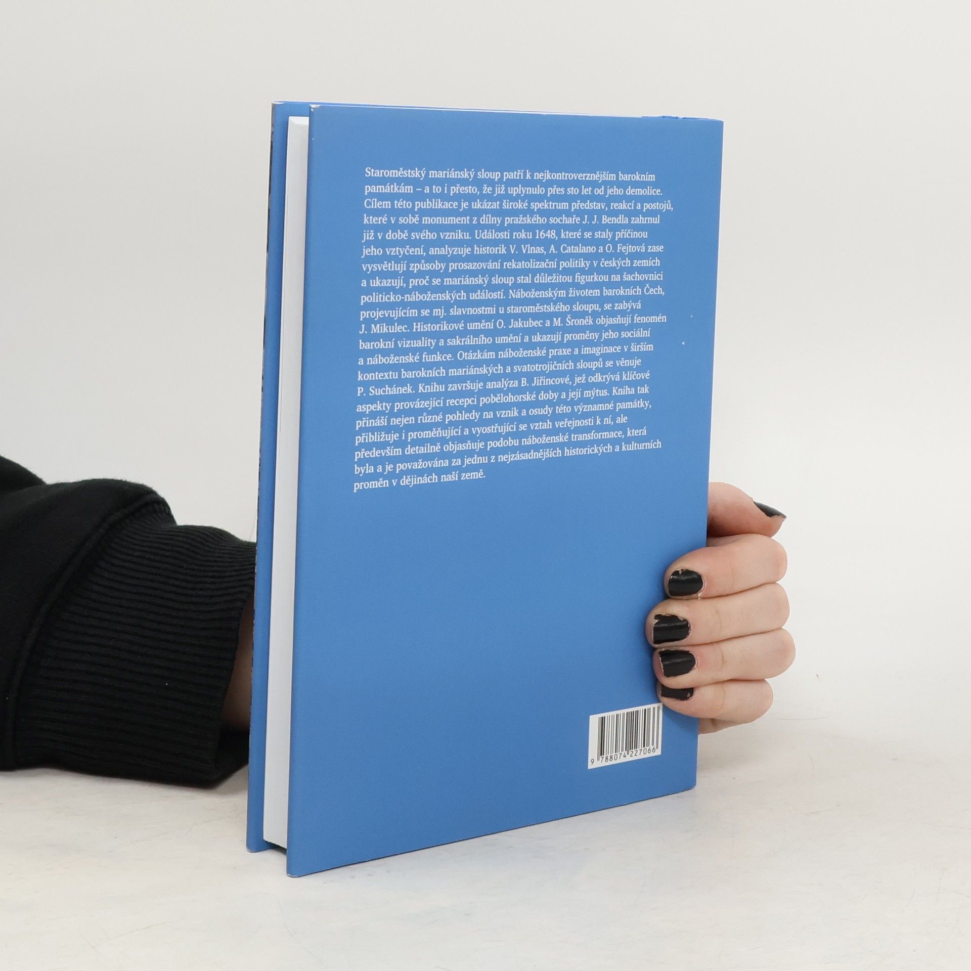 Staroměstský mariánský sloup patří k nejkontroverznějším barokním památkám – a to i přesto, že již uplynulo přes sto let od jeho demolice. Cílem této publikace je ukázat široké spektrum představ, reakcí a postojů, které v sobě monument z dílny pražského sochaře J. J. Bendla zahrnul již v době svého vzniku. Události roku 1648, které se staly příčinou jeho vztyčení, analyzuje historik V. Vlnas. A. Catalano a O. Fejtová zase vysvětlují způsoby prosazování rekatolizační politiky v českých zemích a ukazují, proč se mariánský sloup stal důležitou figurkou na šachovnici politicko-náboženských událostí. Náboženským životem barokních Čech, projevujícím se mj. slavnostmi u staroměstského sloupu, se zabývá J. Mikulec. Historikové umění O. Jakubec a M. Šroněk objasňují fenomén barokní vizuality a sakrálního umění a ukazují proměny jeho sociální a náboženské funkce. Otázkám náboženské praxe a imaginace v širším kontextu barokních mariánských a svatotrojičních sloupů se věnuje P. Suchánek. Knihu završuje analýza B. Jiřincové, jež odkrývá klíčové aspekty provázející recepci pobělohorské doby a její mýtus. Kniha tak přináší nejen různé pohledy na vznik a osudy této významné památky, přibližuje i proměňující a vyostřující se vztah veřejnosti k ní, ale především detailně objasňuje podobu náboženské transformace, která byla a je považována za jednu z nejzásadnějších historických a kulturních proměn v dějinách naší země.
