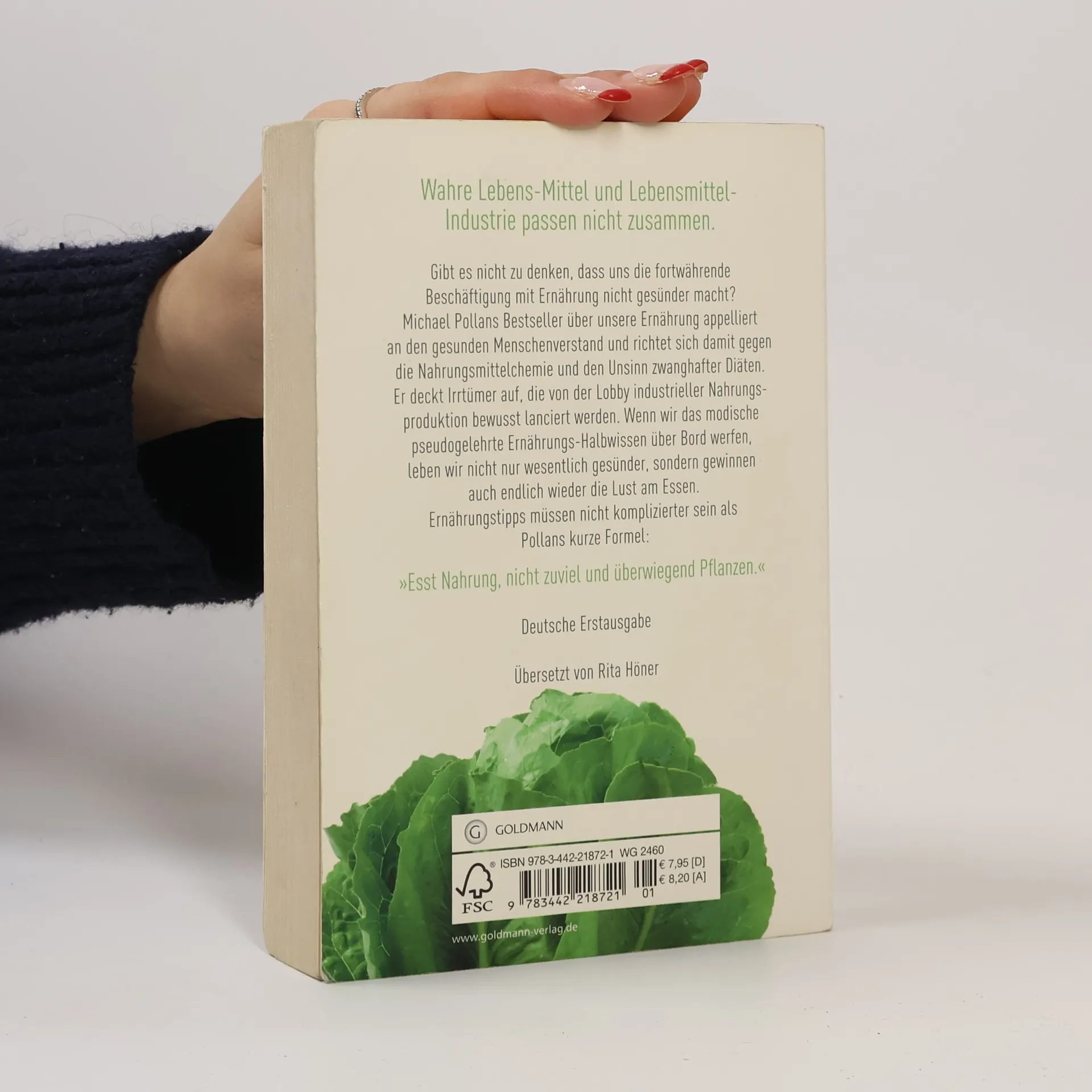 Ein Plädoyer gegen synthetische Nahrung und das Geschäft mit Ergänzungsstoffen.„Je mehr wir uns über Ernährung Sorgen machen, desto weniger gesund werden wir“, schreibt Michael Pollan. Er reduziert seine Ernährungstipps auf den Satz: „Esst Nahrung, nicht zu viel und überwiegend Pflanzen“ und plädiert im Übrigen dafür, das Essen dem gesunden Menschenverstand zu überlassen. Ein vergnüglicher Antiratgeber, der auf erfrischende Weise gegen den Strich gebürstet ist. Er macht Schluss mit dem Diätenwahn und gibt uns endlich die Lust am Essen zurück.