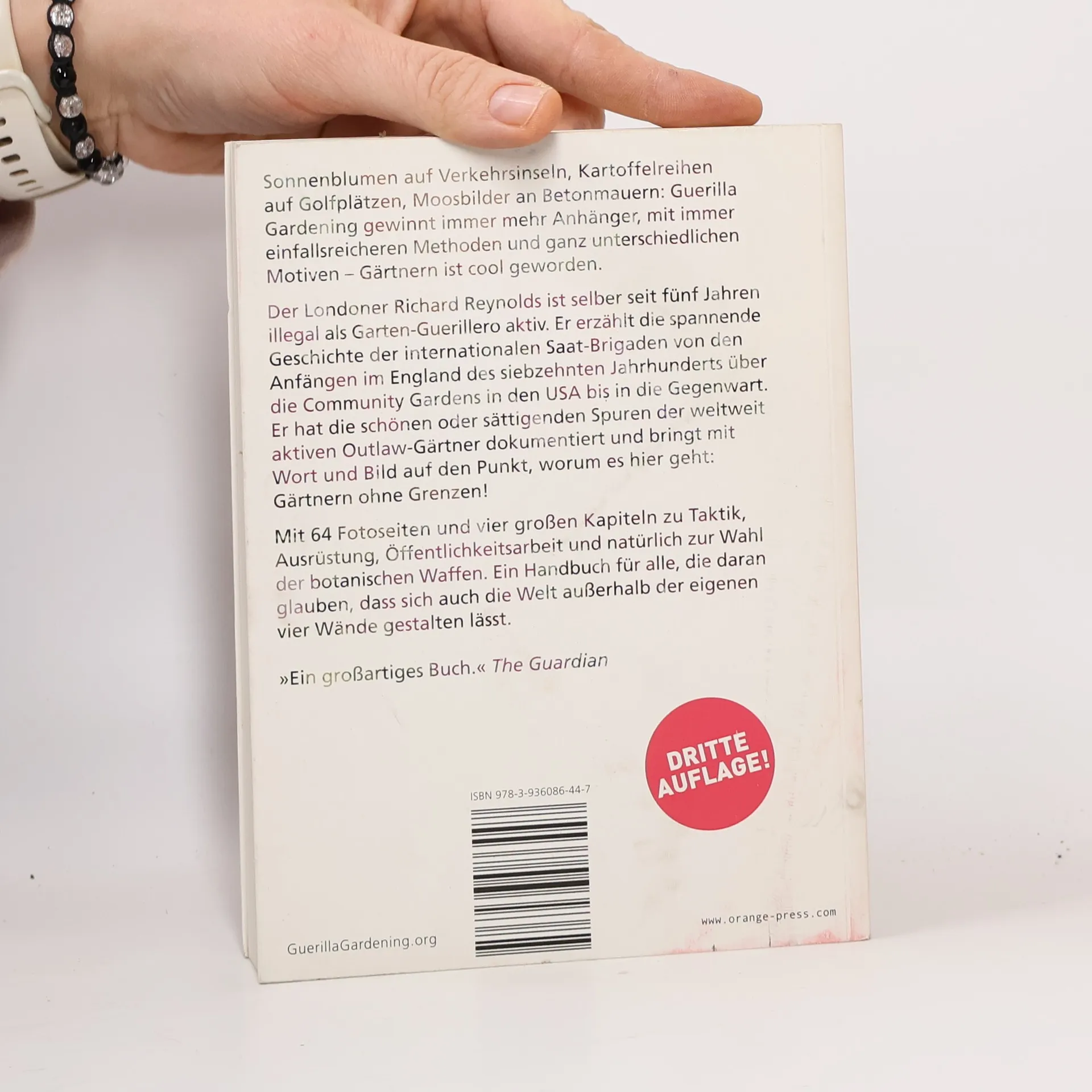Saatbomben, Tomatenpflanzen auf Abrissplätzen, Moosbilder an Betonmauern: Eine besondere Form des Gartenbaus, unter dem Namen ”Guerilla Gardening“ erstmals im Manhattan der Siebzigerjahre bekannt geworden, ist zu einer weltweiten Bewegung angewachsen und gewinnt immer mehr Anhänger. Gärtnern ist cool geworden! Guerilla-Gärtner sind heimlich unterwegs: Bei Nacht und Nebel bepflanzen sie Verkehrsinseln, besetzen brachliegende Flächen, indem sie sie fruchtbar machen oder gehen mit Blumen gegen die Verwahrlosung des eigenen Wohnblocks vor - denn der öffentliche Raum gehört allen, und nicht dem Grünflächenamt. Der Londoner Richard Reynolds, selbst seit fünf Jahren im Einsatz als urbaner Gartenguerillero, bietet mit seiner Website www.guerillagardening.org einen virtuellen Treffpunkt für diese internationale Community von Botanik-Aktivisten, die sich darüber auch zu gemeinsamen Begrünungsaktionen verabreden. Als Inhaber eines Diploms der Royal Horticultural Society betreibt der 32-Jährige das Gärtnern mit ebensoviel botanischer Leidenschaft wie Willen zum zivilen Ungehorsam und ist heute Europas bekanntester Guerilla-Gärtner.