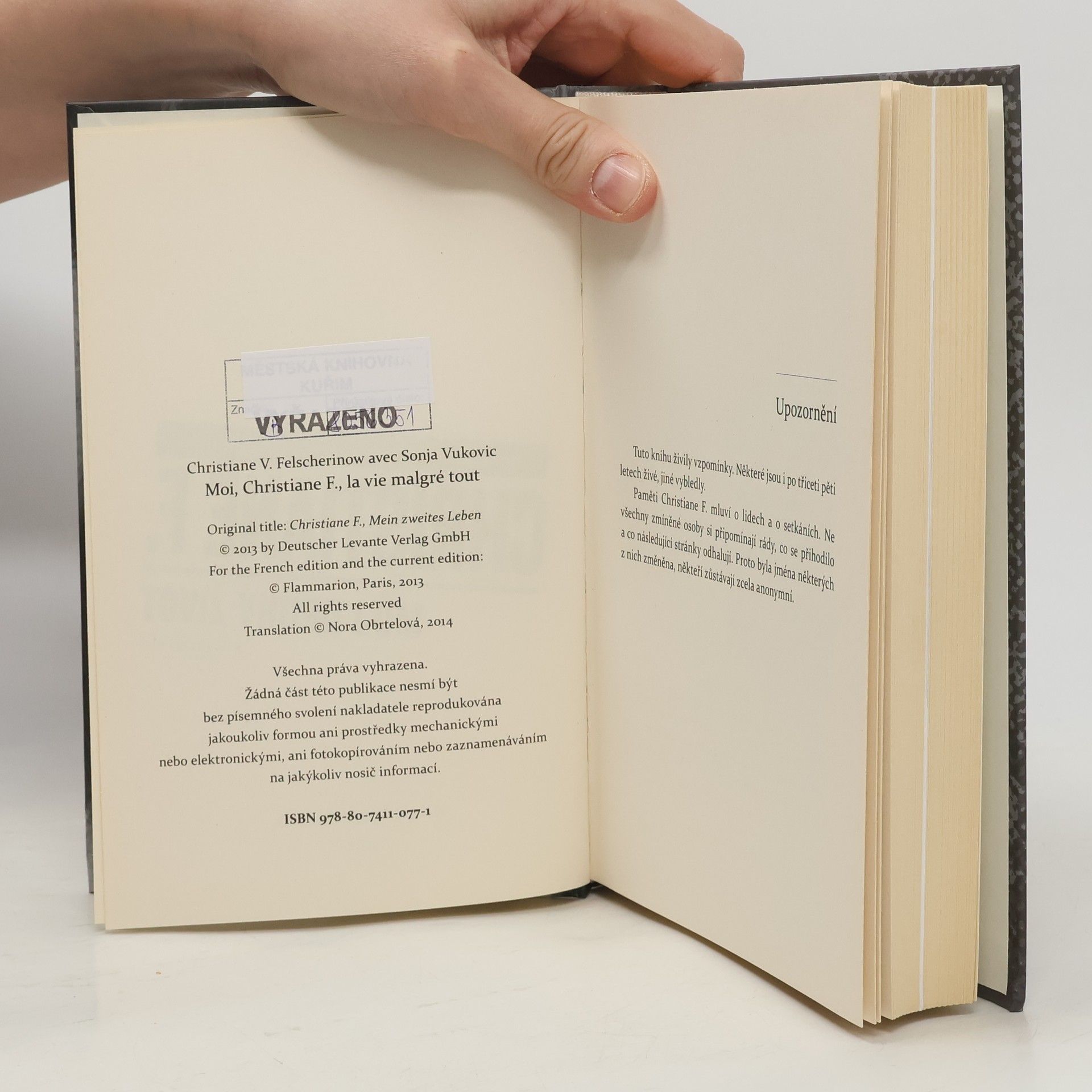 Osud Christiane F. znají miliony čtenářů po celém světě. Vyrůstali s drásavou výpovědí třináctileté německé narkomanky o pekle závislosti na heroinu a prostituci. Kniha My děti ze stanice ZOO a stejnojmenný film z ní udělaly celebritu a změnily zásadně její život. Po pětatřiceti letech se Christiane Felscherinow nechala přesvědčit novinářkou Sonjou Vukovic, aby vyprávěla, co bylo potom. Procházíme spolu s Christiane jejím bojem se závislostí na drogách, pobytem ve vězení, ale také setkáními s legendami amerického rocku a evropské literatury, šťastnými roky v Řecku a největším darem – narozením syna Philippa. Jaký je dnes život Christiane F. Jakou cenu zaplatila za životní selhání i mediální slávu? Sama říká: „Třicet pět let, a ještě jsem neumřela. Koho by kdy napadlo, že se dožiju jednapadesáti let?“