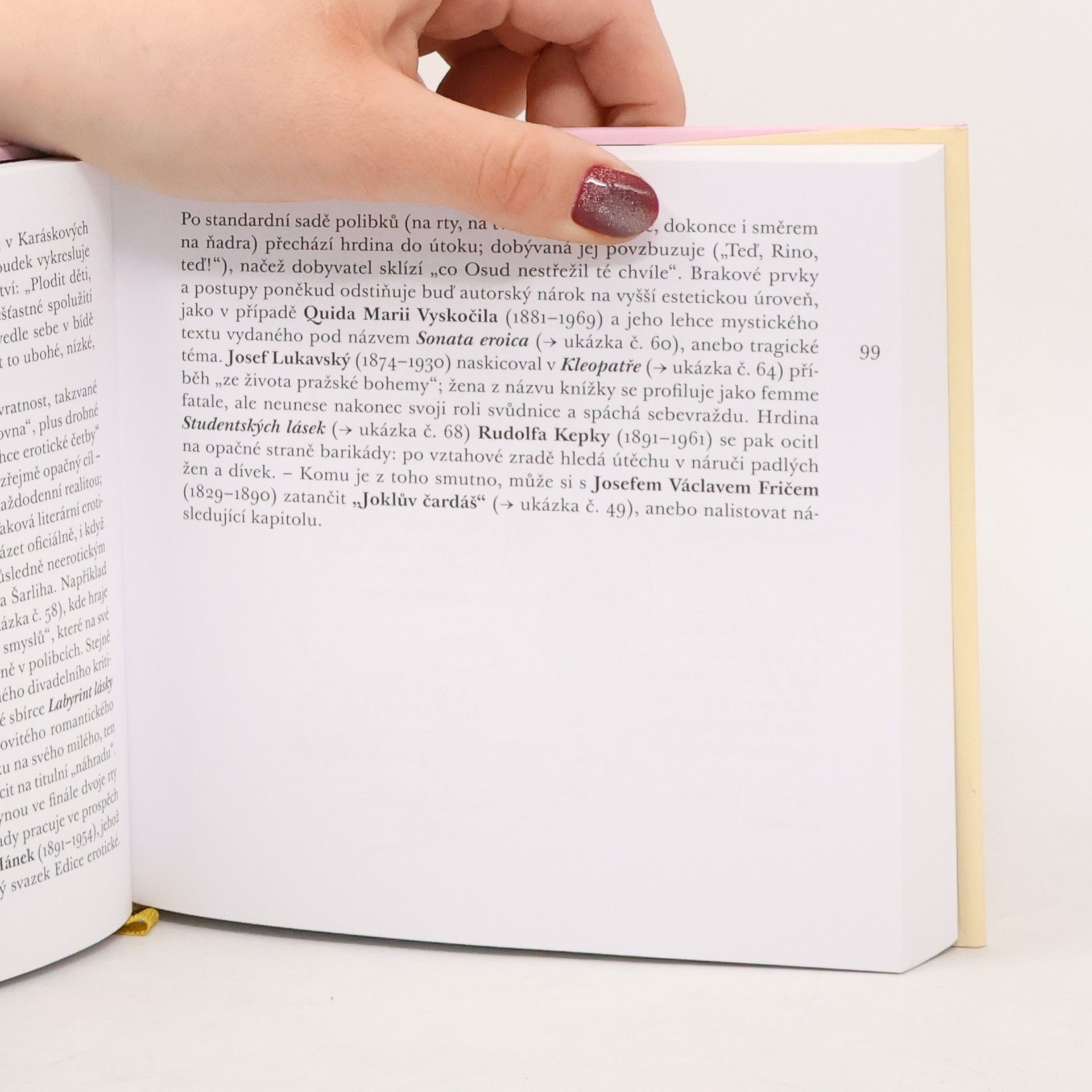 Antologie erotiky v české literatuře. Výprava za tématem erotiky napříč staletími - od počátků po rok 1989. Pouť začíná v polovině 14. století dramatickým Mastičkářem a končí texty, které vznikly těsně před "listopadovým uragánem". Povaha sebraného materiálu je různá, jako se různily doby, kdy jednotlivé příspěvky vznikaly. Čtenář objeví jak velké postavy dějin české literární erotiky (Jeník z Bratřic, K. H. Mácha, K. J. Obrátil), tak desítky autorů anonymních, zapomenutých nebo dosud neobjevených. Autorem osvětové předmluvy je esejista Jan Nejedlý. Kniha pojatá zábavným, nenuceným způsobem poslouží dobře k čtení, listování i snění v každém věku.