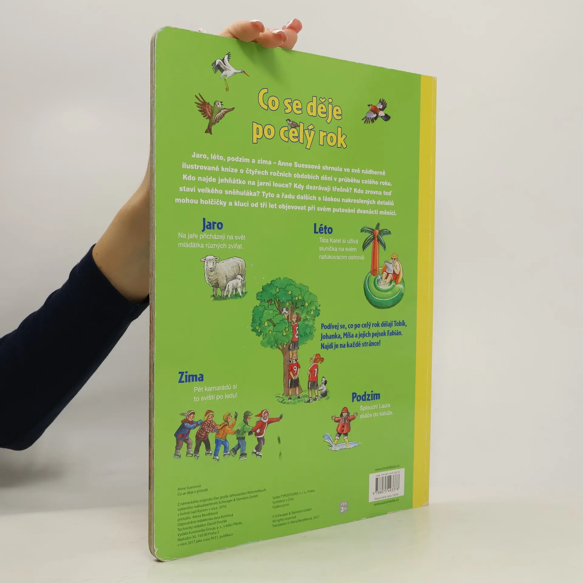 Jaro, léto, podzim a zima – Anne Suessová shrnula ve své nádherně ilustrované knize o čtyřech ročních obdobích dění v průběhu celého roku. Kdo najde jehňátko na jarní louce? Kdy dozrávají třešně? Kdo zrovna teď staví velkého sněhuláka? Tyto a řadu dalších s láskou nakreslených detailů mohou holčičky a kluci od tří let objevovat při svém putování dvanácti měsíci