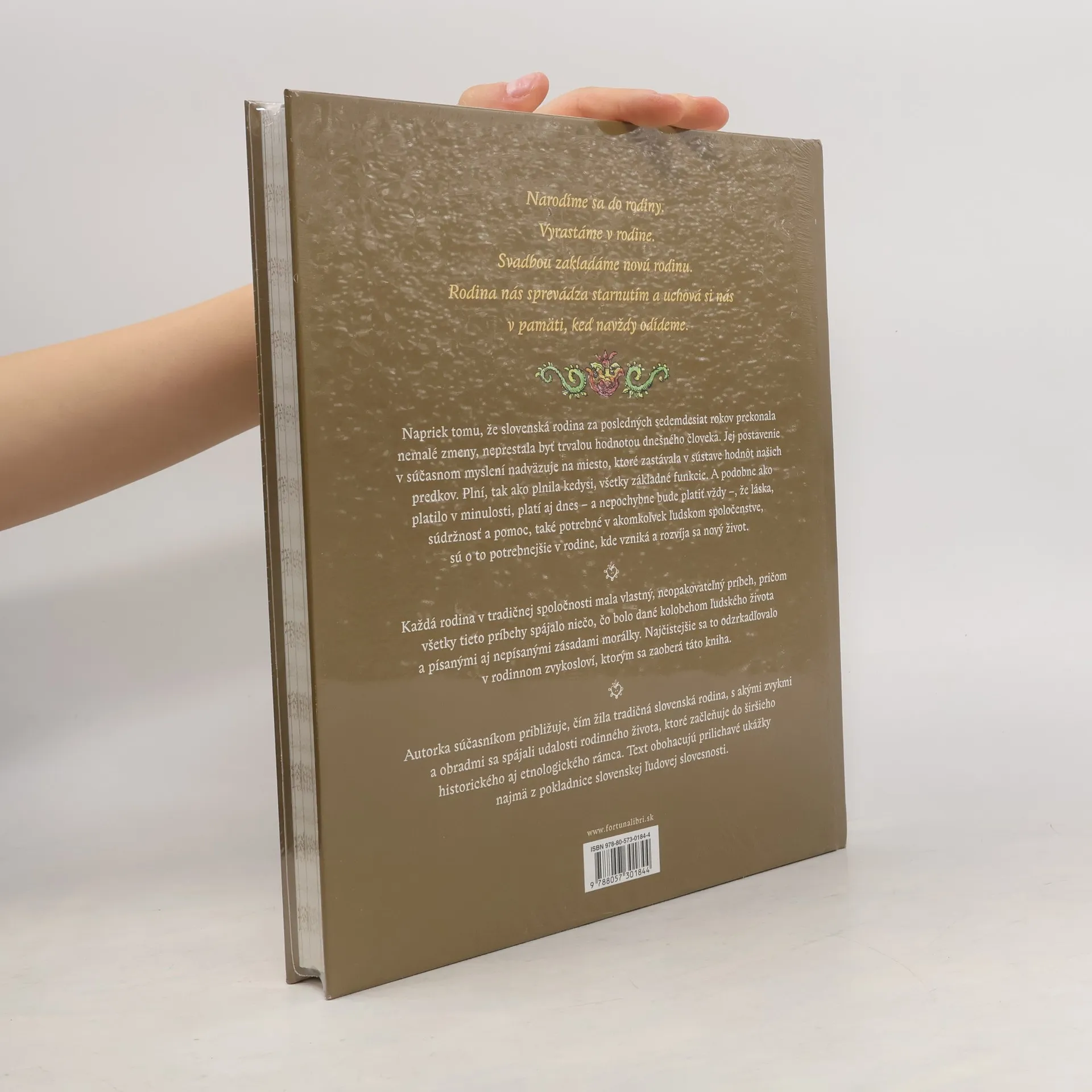 Nová kniha známej slovenskej etnologičky Kataríny Nádaskej, autorky úspešného diela Slovenský rok, je založená na životnom cykle človeka. Približuje rozsiahly a pestrý komplex javov, ktoré v živote tradičnej slovenskej rodiny súviseli s jednotlivými fázami tohto cyklu. Autorka sa najskôr venuje okruhu tradícií spojených s narodením nového človiečika, potom krok za krokom sleduje jeho začleňovanie do dedinského spoločenstva, podrobne rozoberá svadbu ako rozhodujúci krok založenia novej rodiny a napokon sprostredkuje prirodzenosť, s ktorou tradičné spoločenstvo akceptovalo fakt staroby a smrti. Narodíme sa do rodiny. Vyrastáme v rodine. Svadbou zakladáme novú rodinu. Rodina nás sprevádza starnutím a uchová si nás v pamäti, keď navždy odídeme. Napriek tomu, že slovenská rodina za posledných sedemdesiat rokov prekonala nemalé zmeny, neprestala byť trvalou hodnotou dnešného človeka. Jej postavenie v súčasnom myslení nadväzuje na miesto, ktoré zastávala v sústave hodnôt našich predkov. Plní, tak ako plnila kedysi, všetky základné funkcie. A podobne ako platilo v minulosti, platí aj dnes – a nepochybne bude platiť vždy –, že láska, súdržnosť a pomoc, také potrebné v akomkoľvek ľudskom spoločenstve, sú o to potrebnejšie v rodine, kde vzniká a rozvíja sa nový život.